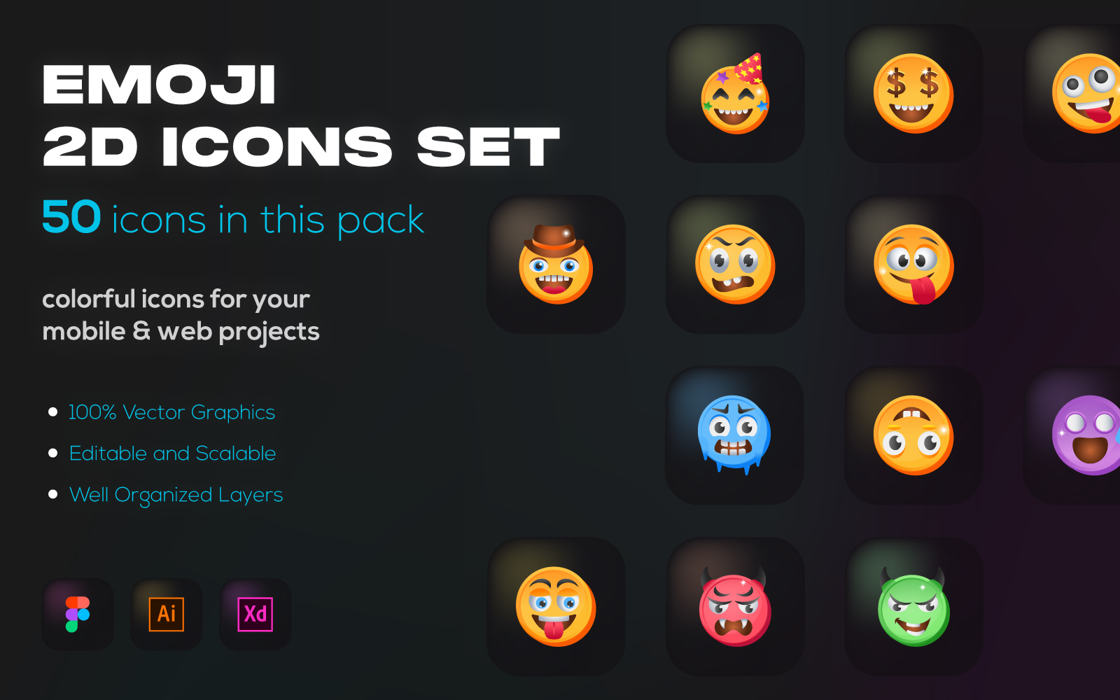 Treat your users with cool emoji icons and let them express their emotions with our emoticons vectors that will add value to your project and make its user interface more fun. You can also integrate these cool icons in your project to make it engaging and expressive.