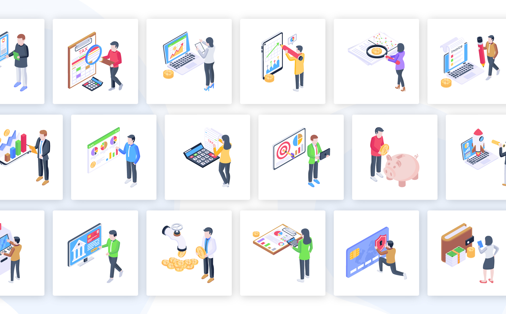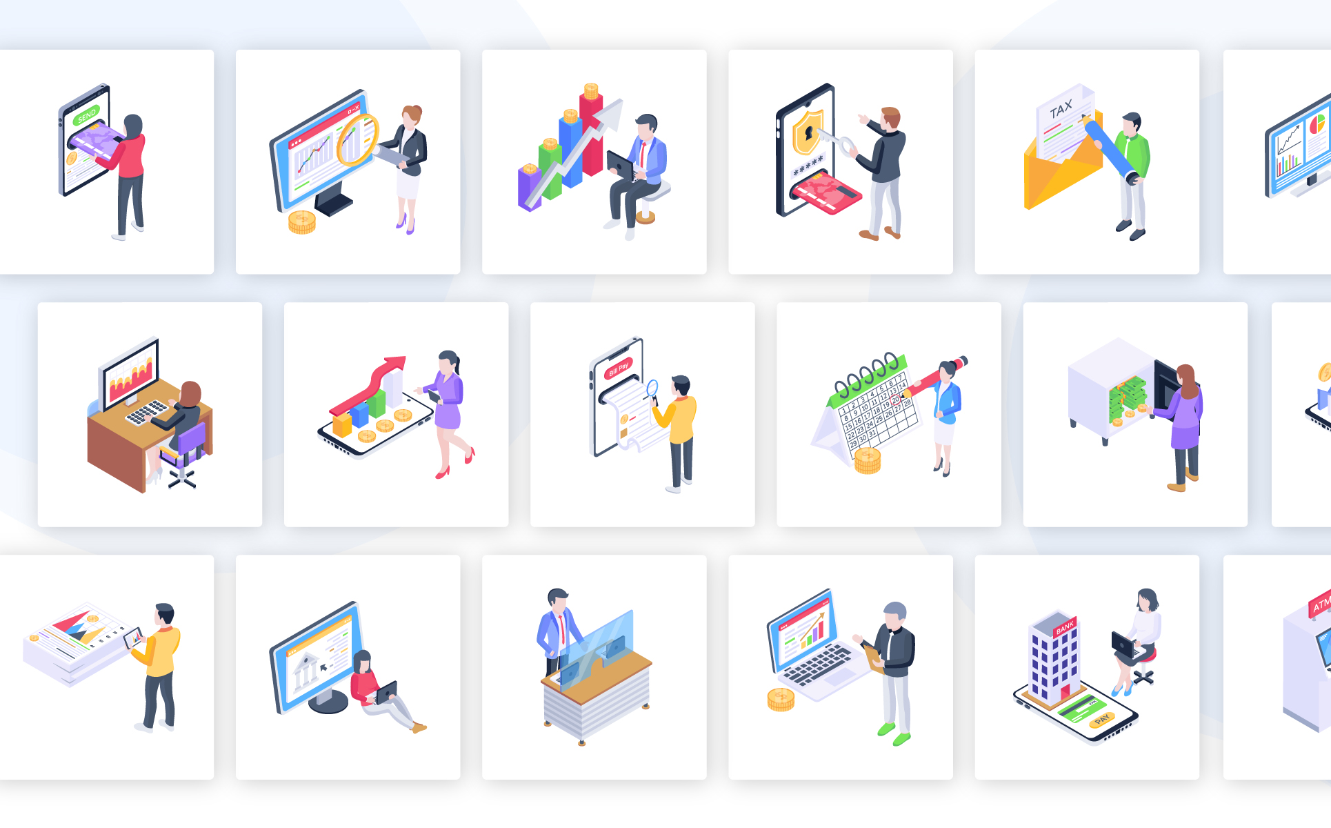 These isometric character-based icons revolve around the concept of business accounting and portray various business accounting states and scenarios effectively. These isometric business accounting vectors are customizable according to the requirements of given project.