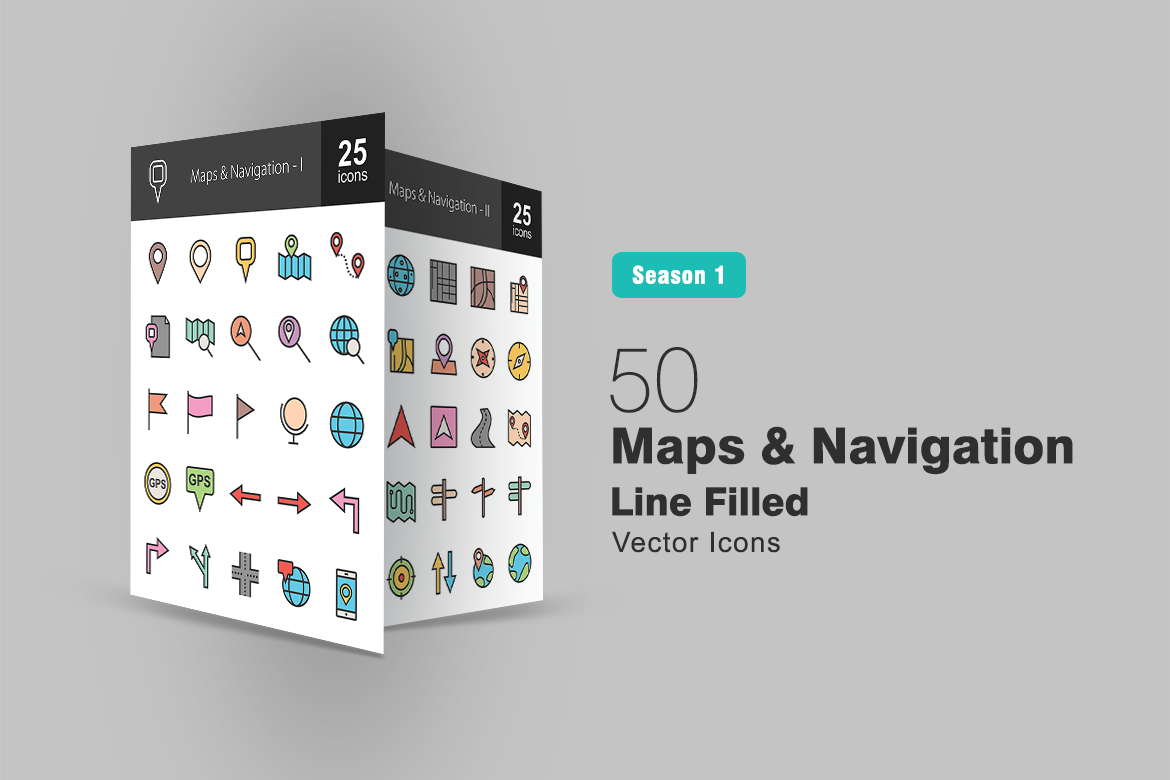 Download this premium 50 Maps & Navigation Filled Line Icon Set published on TemplateMonster.