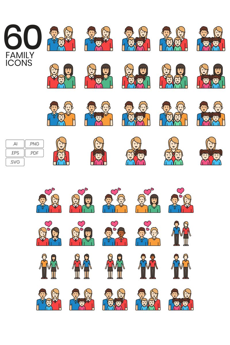 These 60 Family Icons intend to provide you what you need too! You can use these icons to inspire yourself or others, also, you can use them as a way to convey your message. As a marketing tool, whether online or offline, printed, or be put in a website or app, it\'s so versatile! We only hope to help you by designing these icons!
