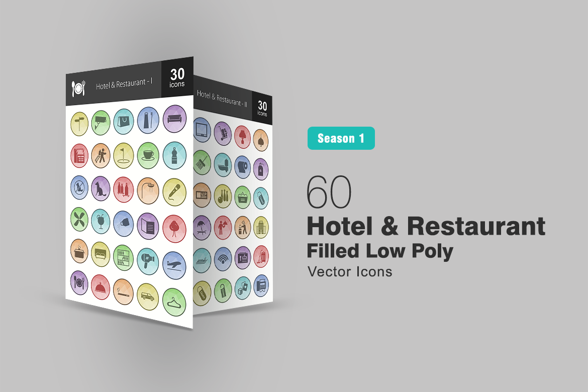 Download this premium 60 Hotel & Restaurant Filled Low Poly Icon Set published on TemplateMonster.