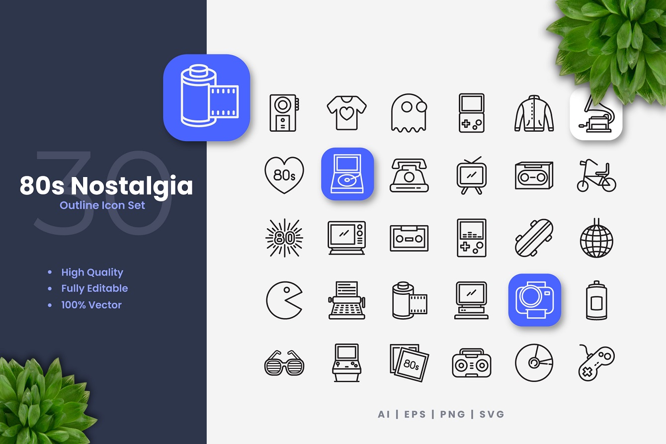 Set of 30 80's Nostalgia outline icons | Simple and clean design,perfect for websites, mobile apps, books, social media, infographics, flyer, print, banners, posters and many more. To resize, change color, or edit stroke weight ,you can easily edit on vector software like Adobe Illustrator and CorelDRAW.