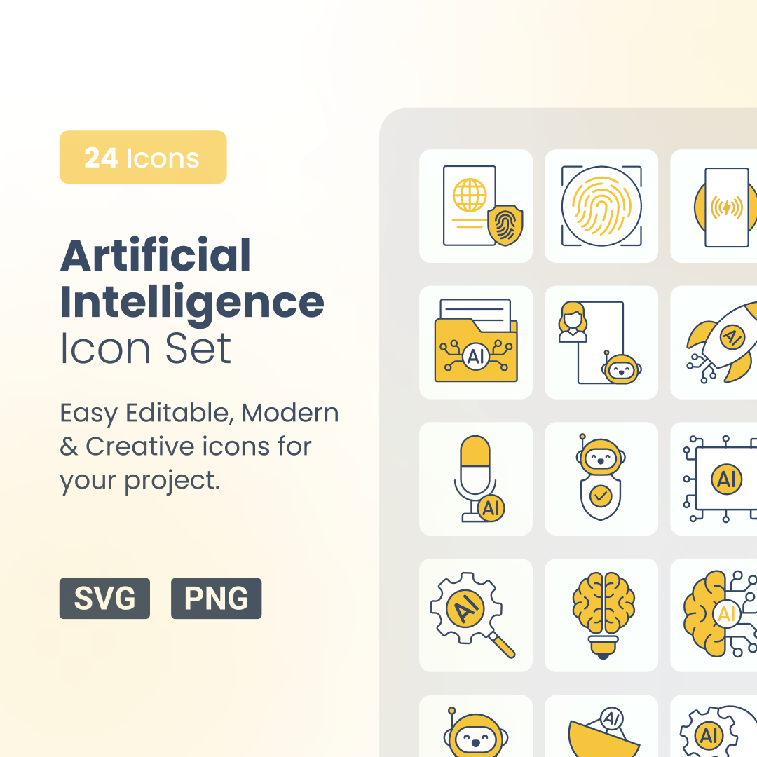 The icons cover different AI topics like neural networks, robots, data analysis, and machine learning. Available in SVG and PNG formats, Whether you're a teacher, part of a tech team, a designer, or just want your work to look better, these icons can help make your content clear and interesting.