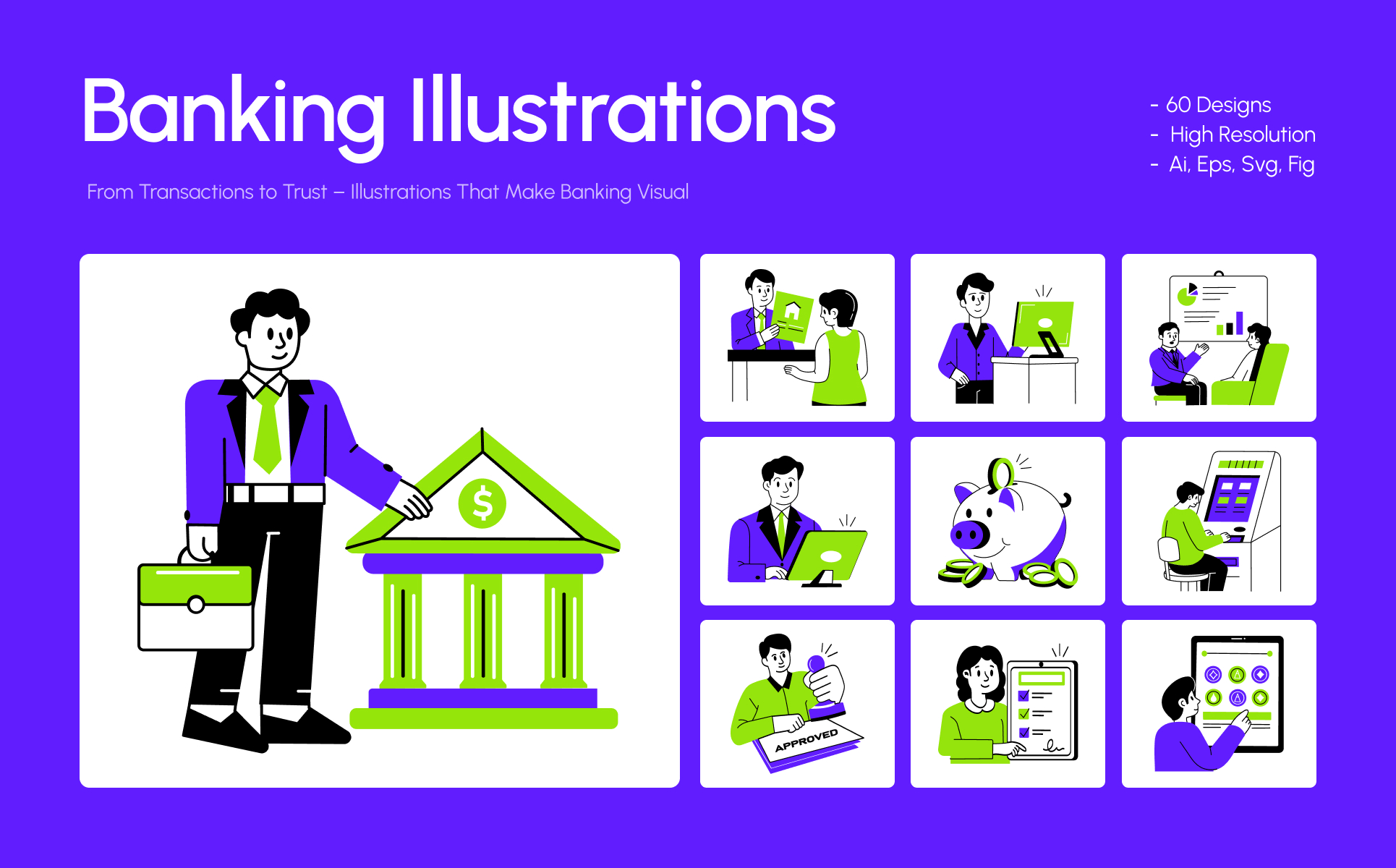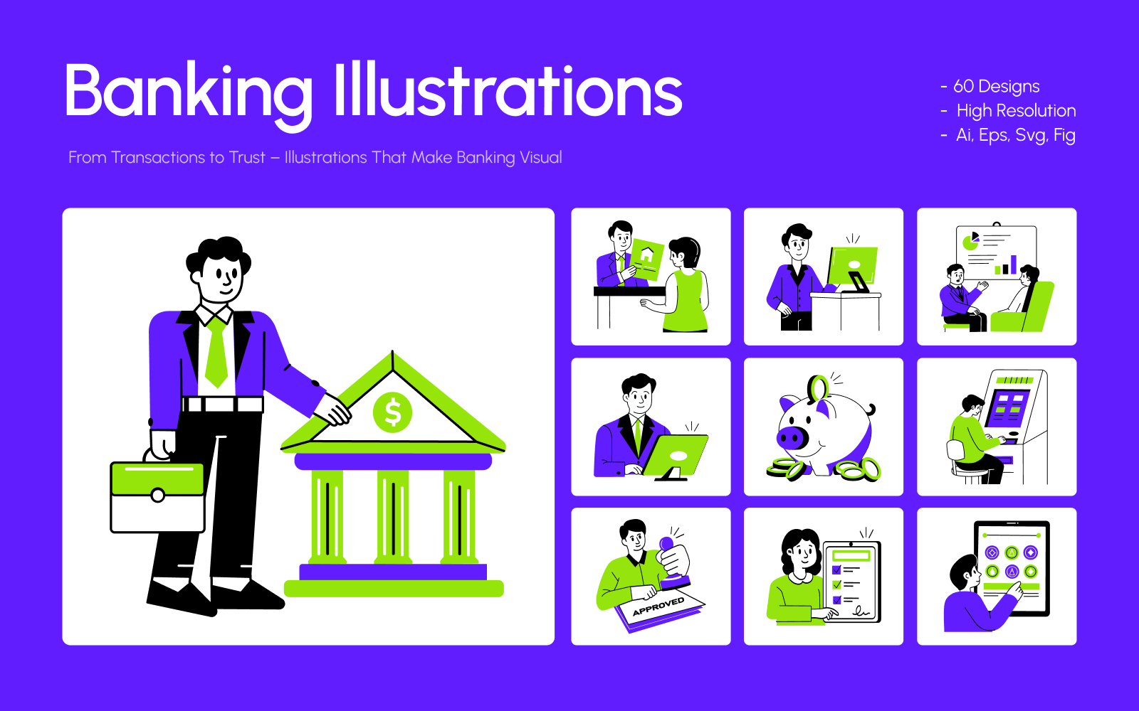 Step into the world of modern finance with this Bank and Banking Illustration Art Set. A versatile, high-quality collection perfect for digital banking apps, fintech platforms, investment dashboards, or anything money-related. Designed in a playful yet professional style, this set makes complex finance visuals friendly and engaging. Whether you're working on a fintech startup, finance blog, mobile app, or client project, this pack adds a modern, illustrative flair with ease.