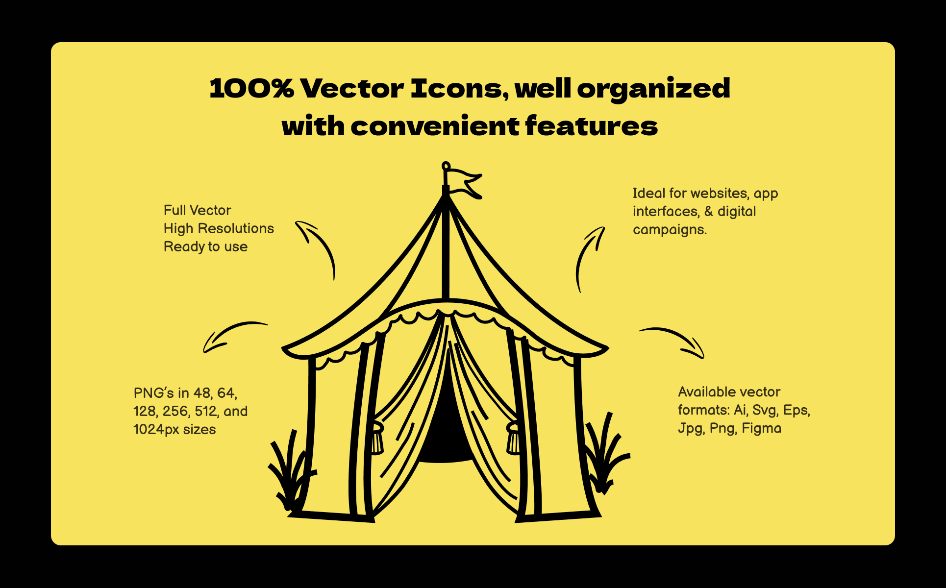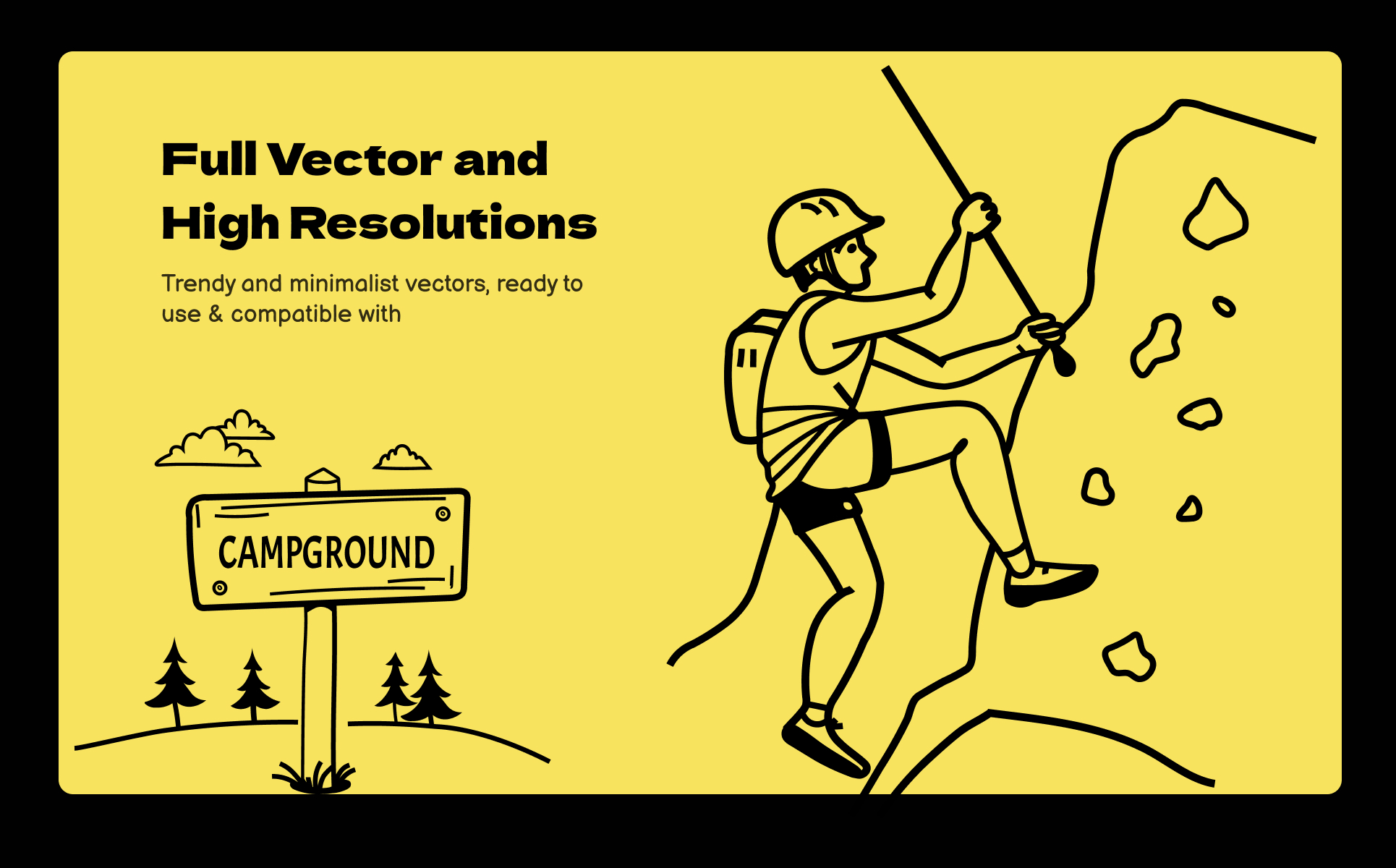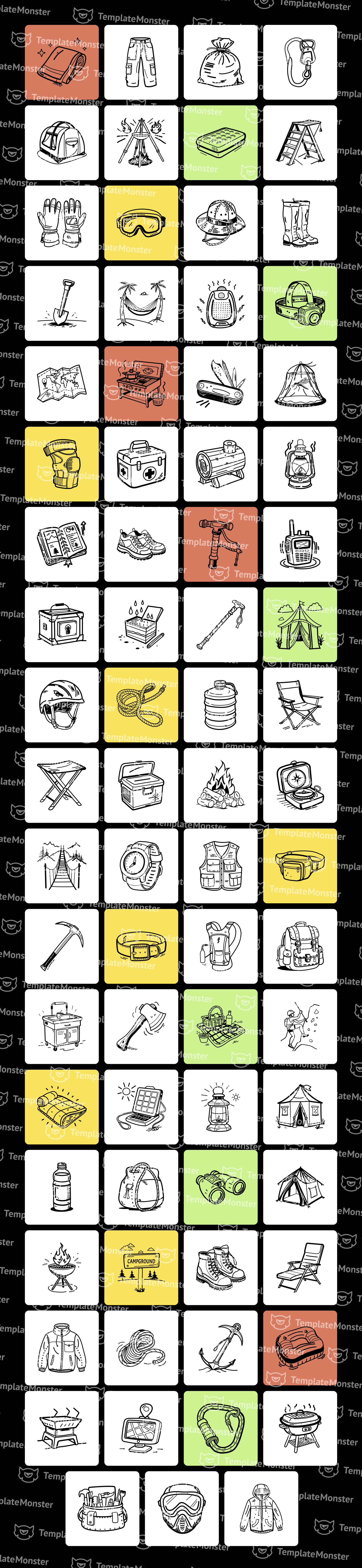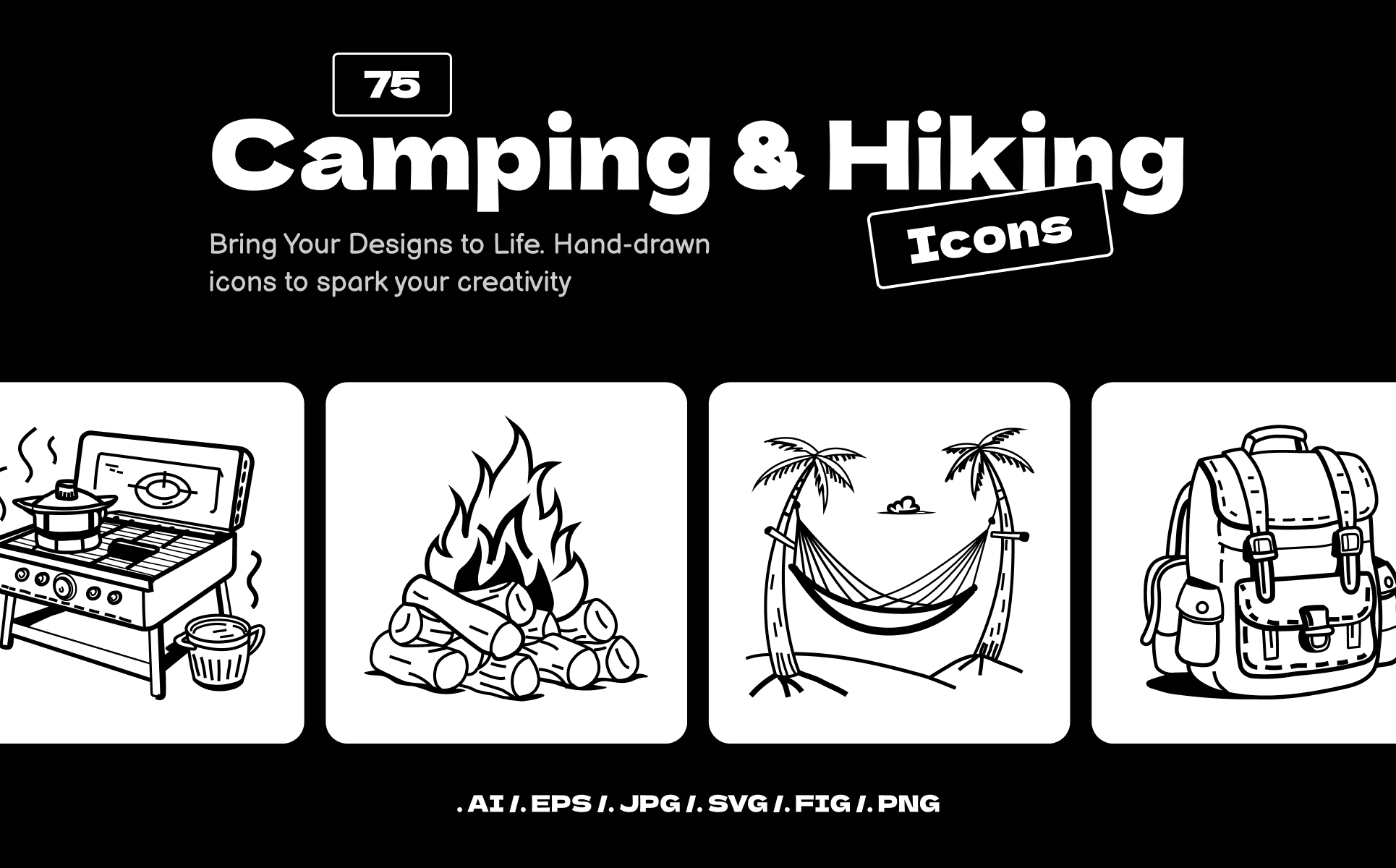 Enhance your designs with our meticulously illustrated Camping and Hiking Icons. Eye-catching icons are available in multiple sizes. Ideal for websites, apps, and print materials, these icons capture the essence of outdoor adventure with detailed, hand-drawn precision.