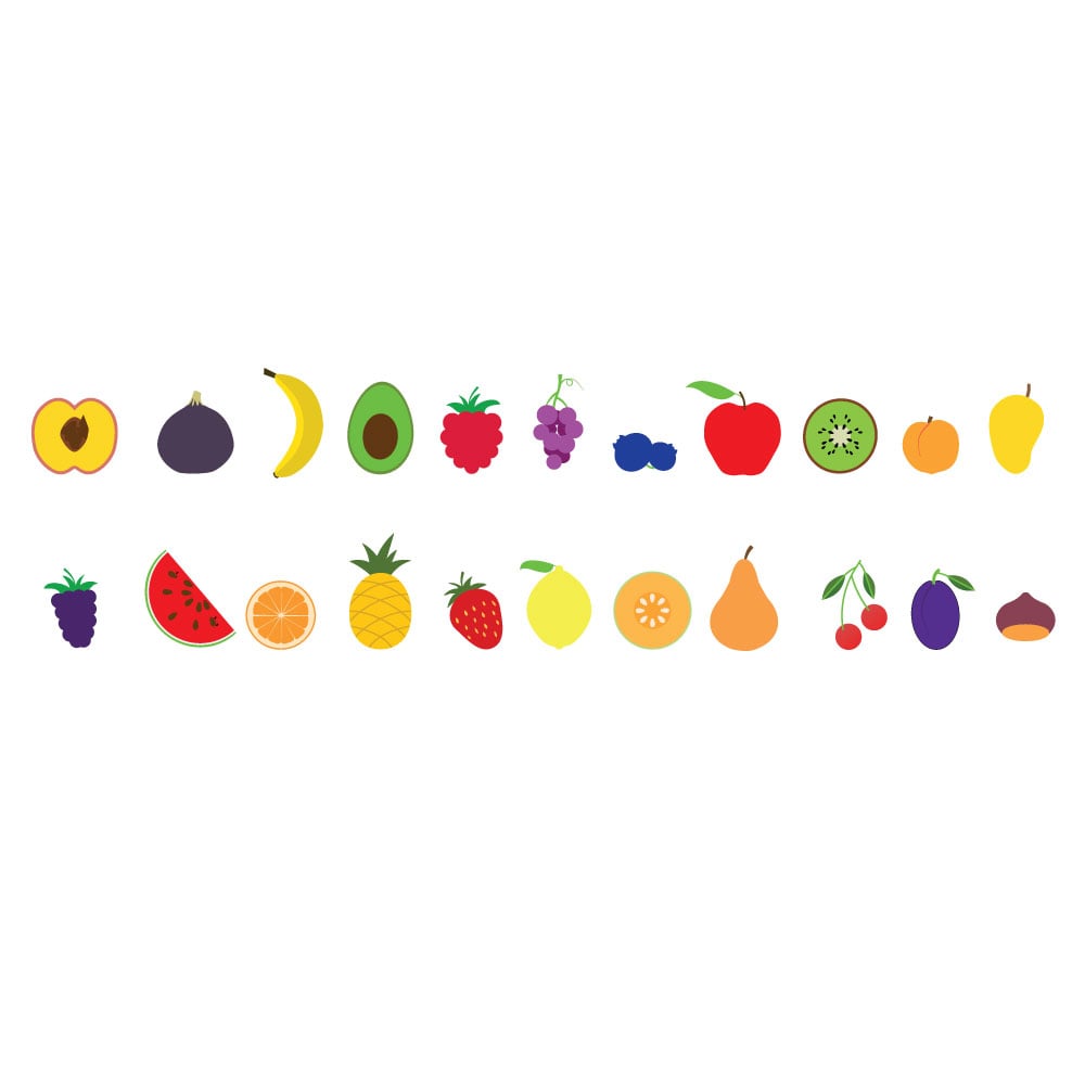 Perfect for web, mobile apps, and print, it includes a banana, strawberry, pineapple, watermelon, grapes, mango, blueberries, peach, cherry, lemon, avocado, pear, and kiwi. These scalable, editable vector files ensure high quality for any project, making them ideal for UI design, branding, and food-related themes. Easily customizable in Adobe Illustrator or similar software.