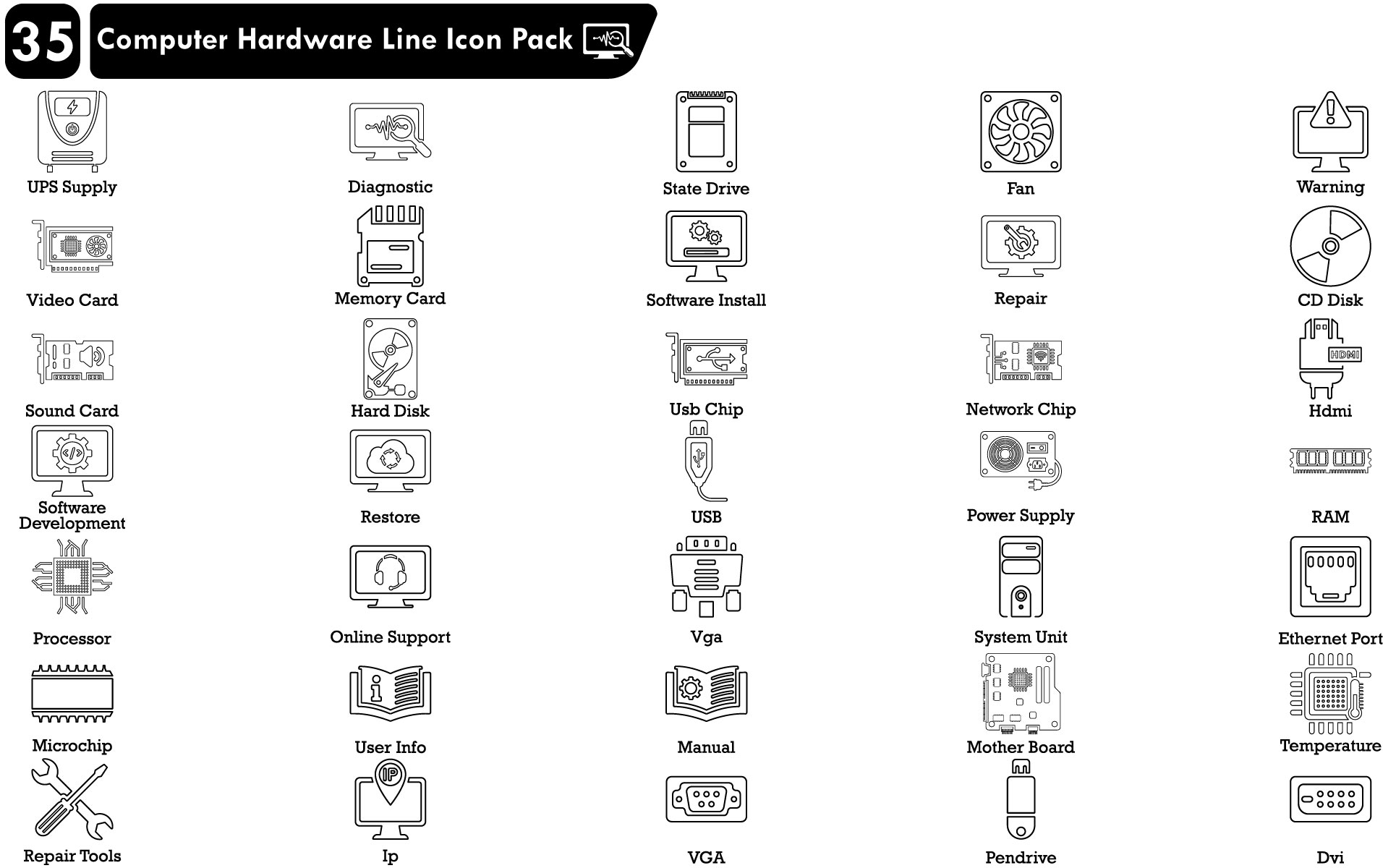 Beautiful, meticulously designed 35 Computer Hardware Line Icon Pack. Perfect for use in designing and developing websites, printed materials, presentations, Promotional Materials, Illustrations, Info graphics or any type of design projects