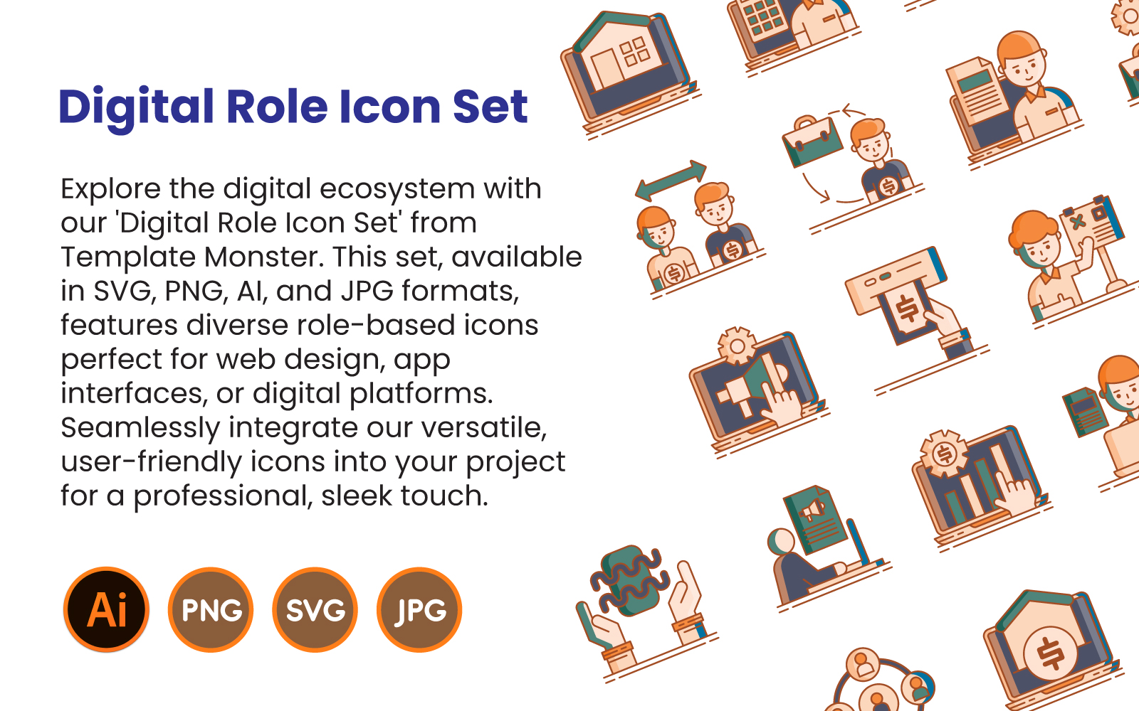The 'Digital Role Icon Set' is designed to be versatile and user-friendly with multiple format options for ease of use - AI for vector editing, SVG for scalable graphics, PNG for lossless compression, and JPG for broad compatibility. Every icon in the set has been thoughtfully created to ensure it encapsulates the essence of the role it represents while maintaining visual harmony when viewed as a collection.