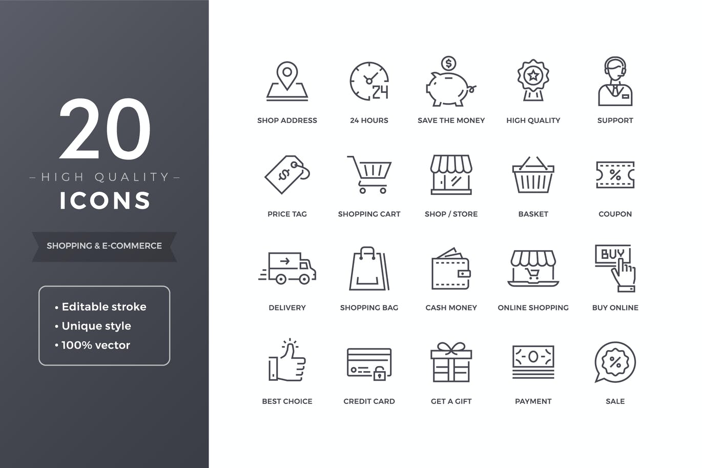 ** This icon set includes: ** e-commerce, shopping, icon, line, store, payment, shop, delivery, basket, discount, cart, sale, internet, commerce, gift, bag, business, buy, money, price, card, coupon, market, cash, shipping, best, address, support, quality, retail, secure, order, piggy, wallet, fast, choice, shopping cart, tag, online, 24 hours, thumb, click, purchase