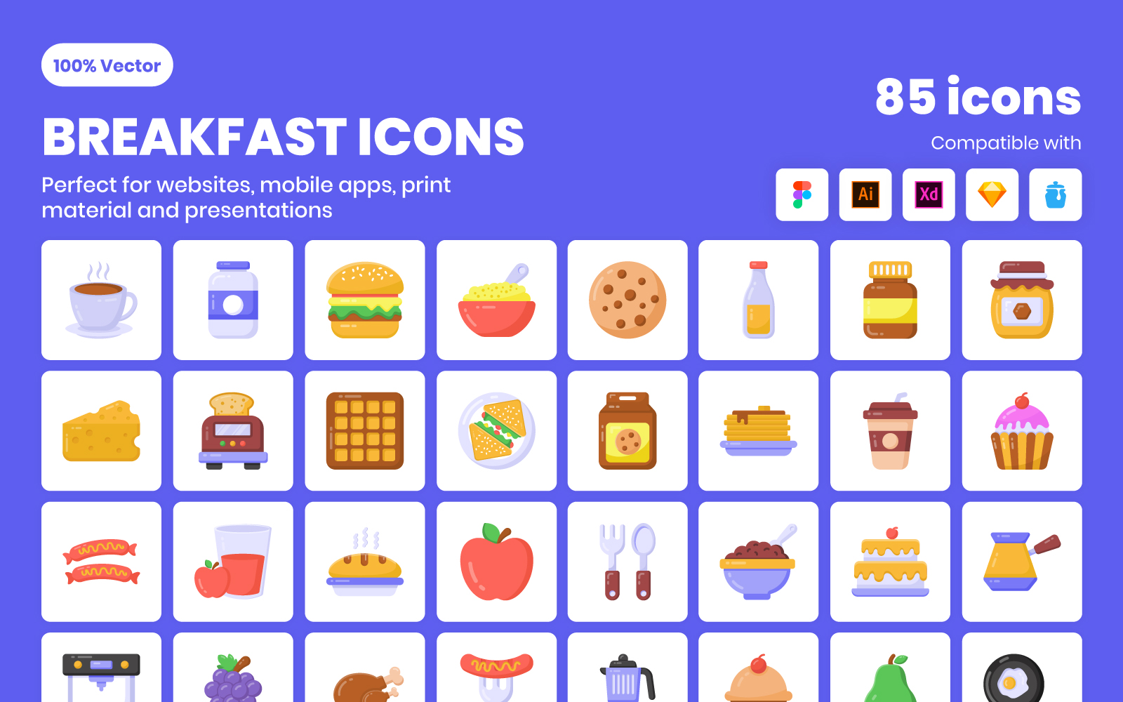 Nothing better than a healthy breakfast in the morning. This set offers breakfast icons, which you can use in your projects. All graphics are vector-based and can easily be resized and recolored. Perfect for menus, websites, and invitations.