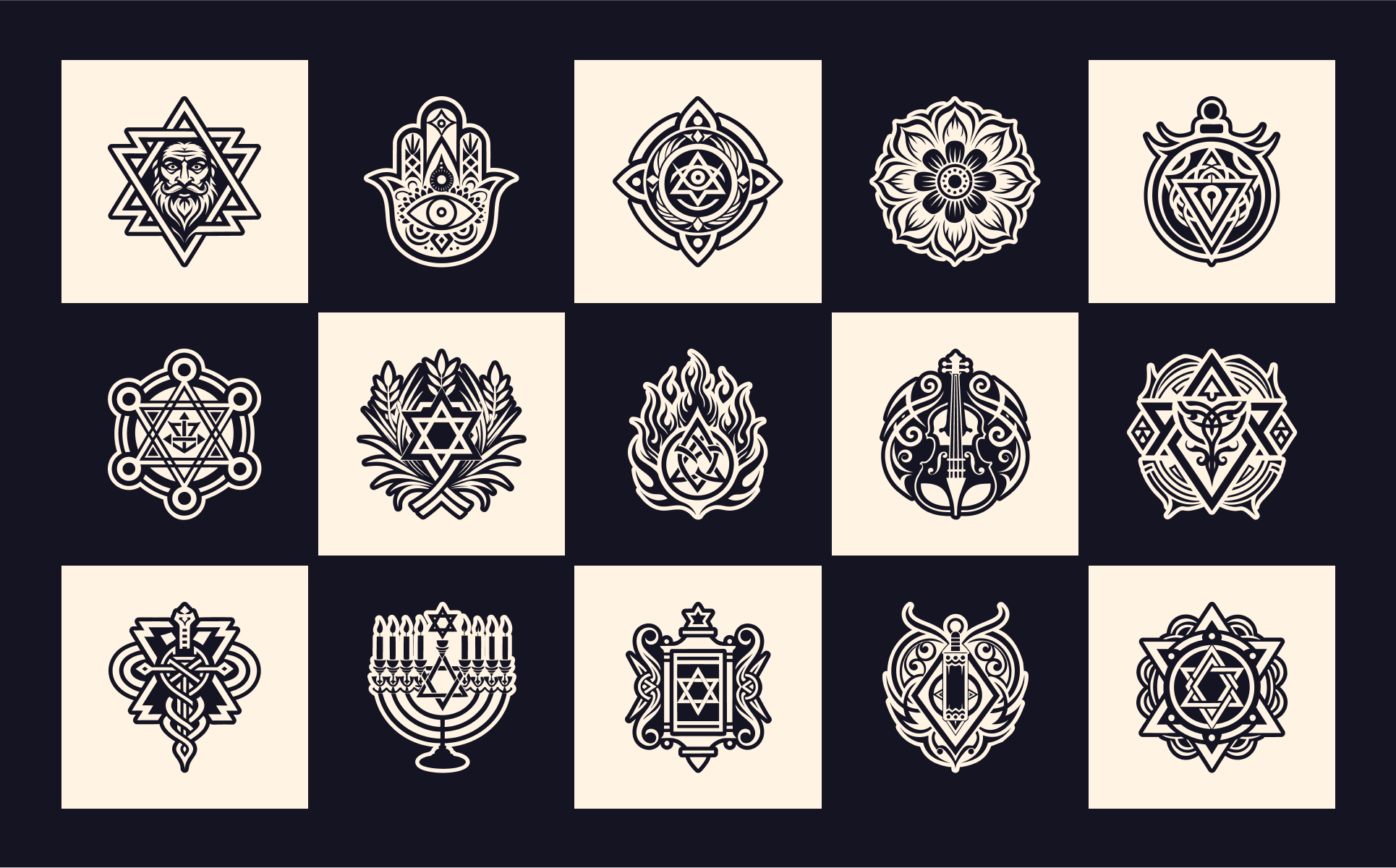 Bring the rich culture of Judaism into your creative projects with this beautifully crafted Jewish Symbols Collection! Whether you're designing for Hanukkah promotions, creating stunning jewelry designs, illustrating sacred traditions, or even crafting tattoos, these symbols offer versatile usability across countless mediums. Let ancient heritage beautifully inspire your modern creations!