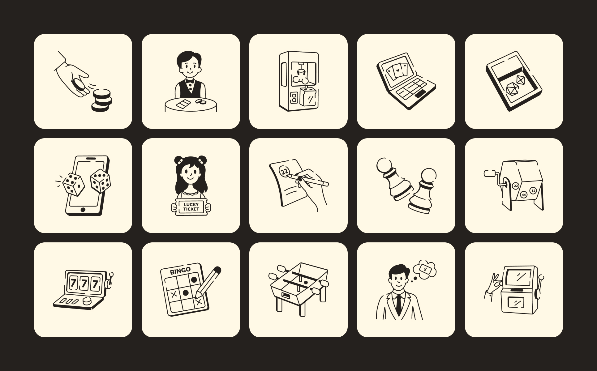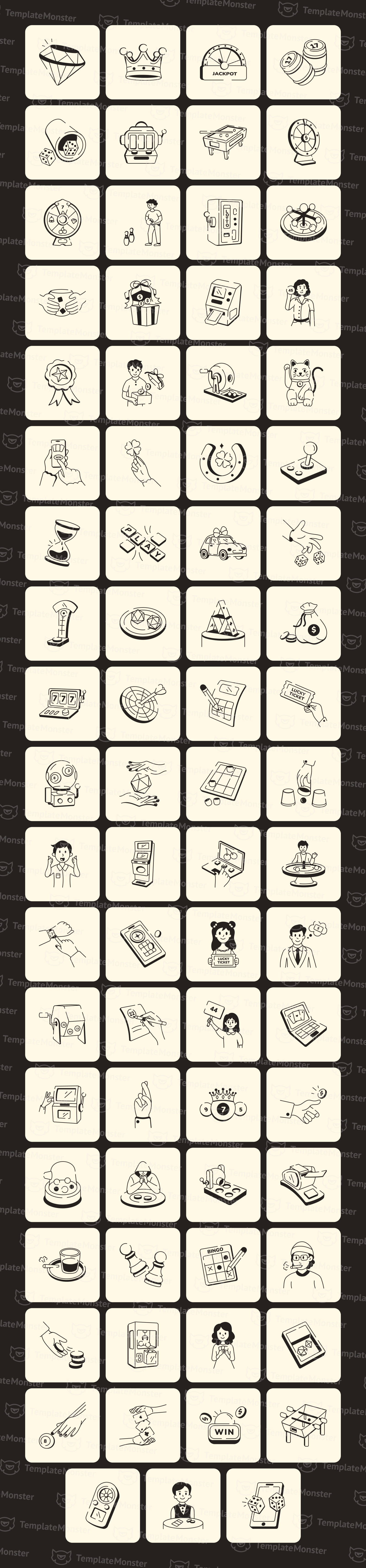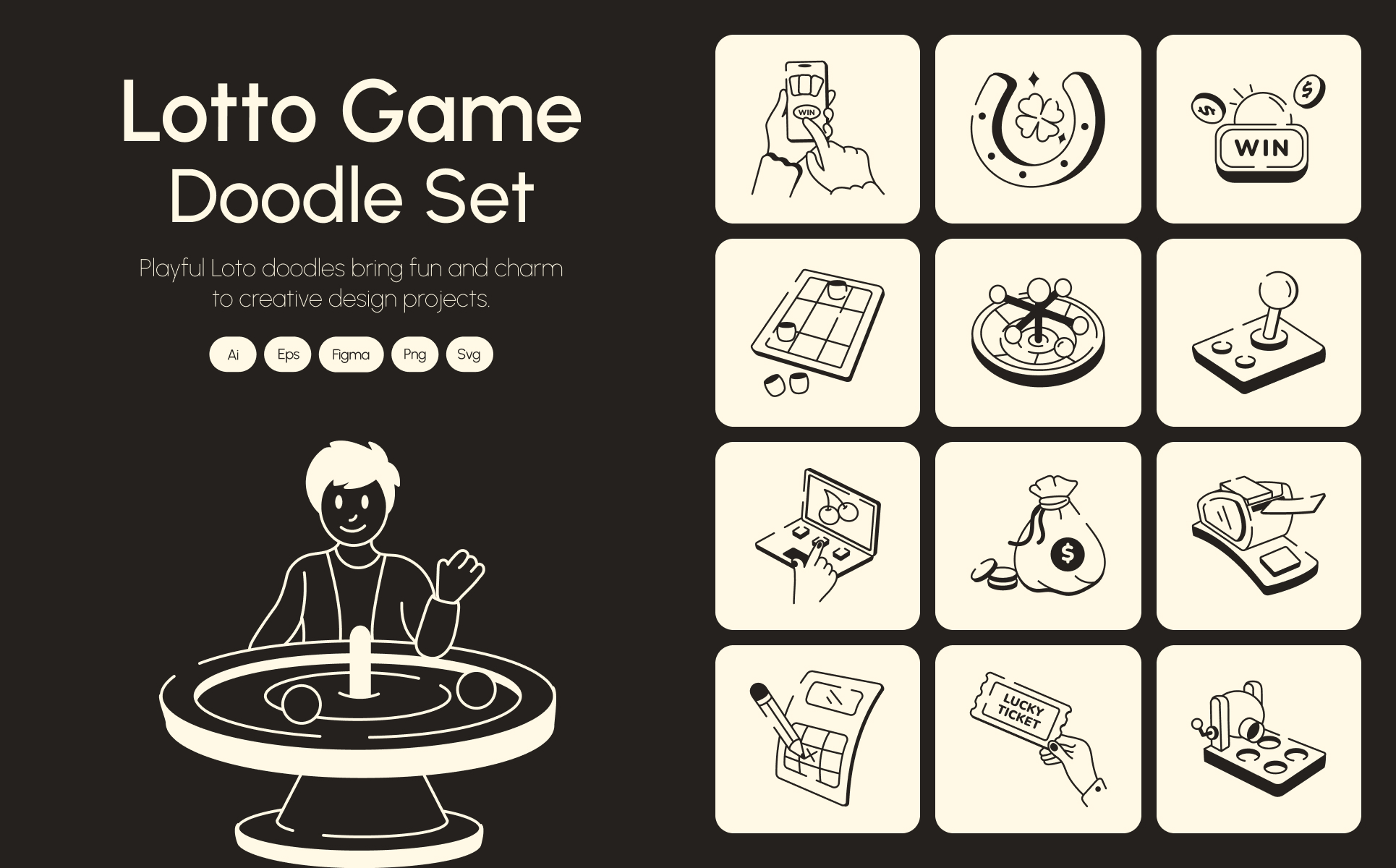 Add a spark of excitement and playfulness to your designs with this lotto game doodle icon set. Each icon captures the thrill of chance, the fun of gaming, and the joy of winning, making it perfect for lottery promotions, game interfaces, mobile apps, social media posts, or any project that needs a touch of luck and energy. Whether you're crafting a landing page or spicing up a marketing campaign, these cheerful doodles help communicate fun, anticipation, and that irresistible jackpot feeling.