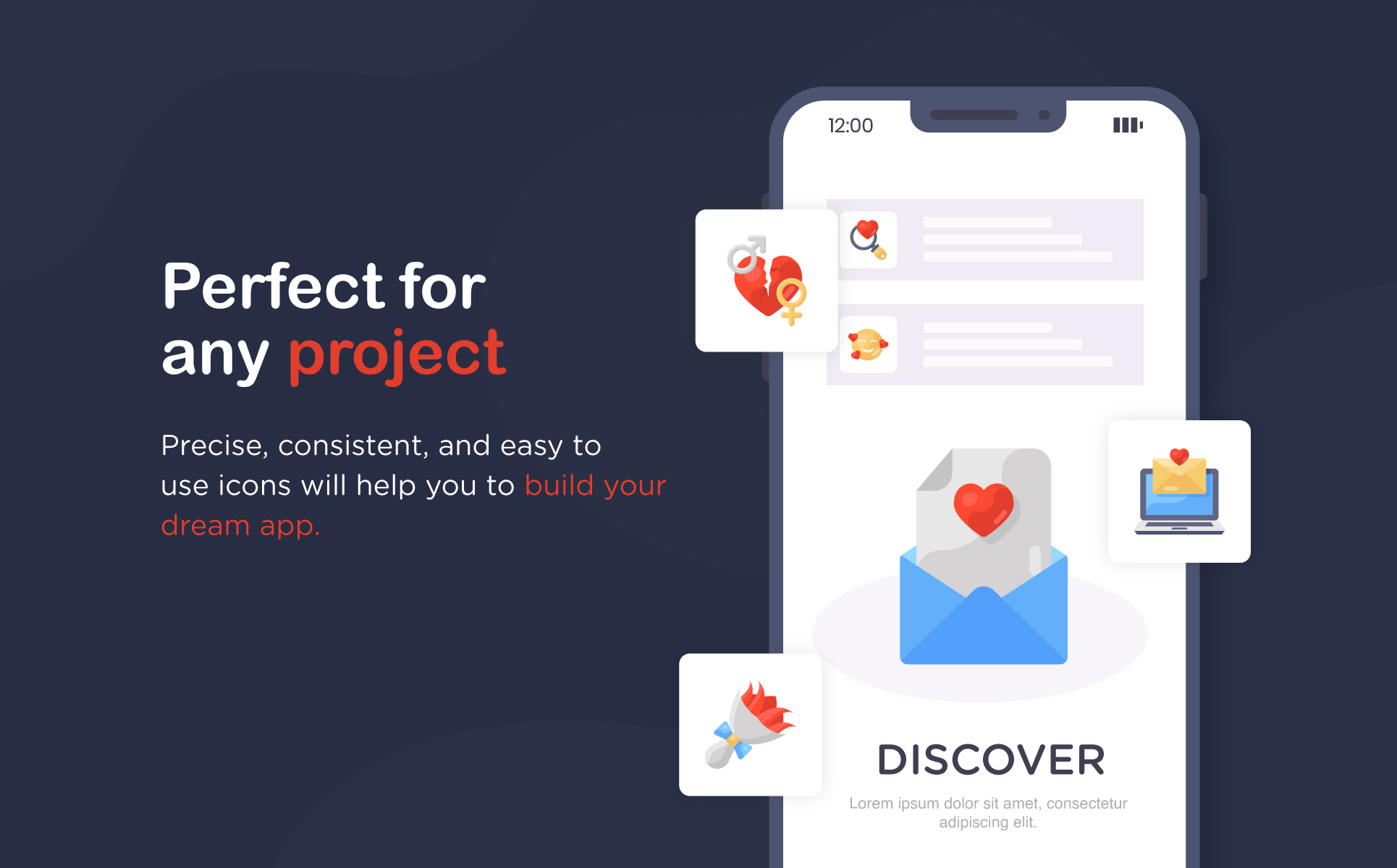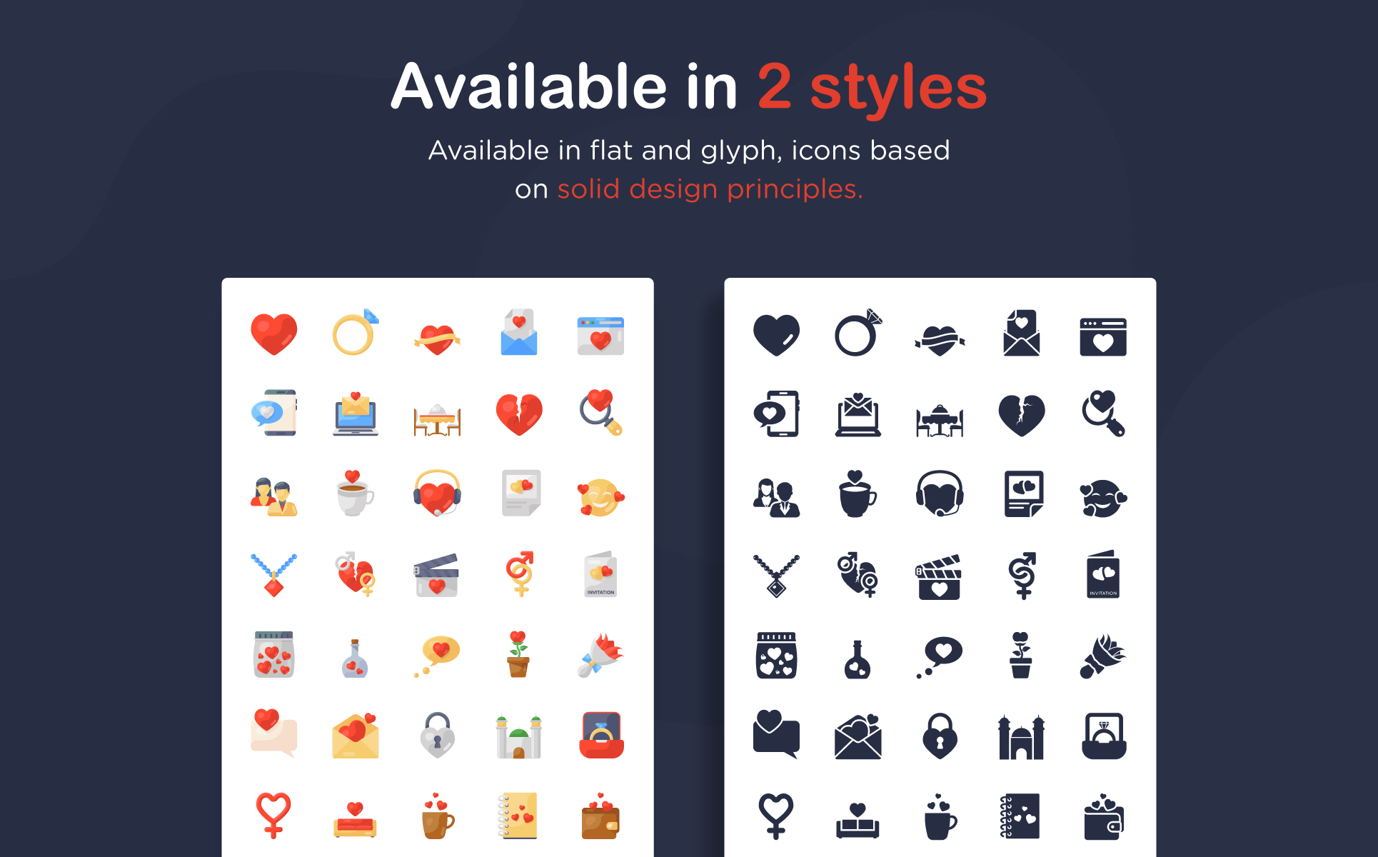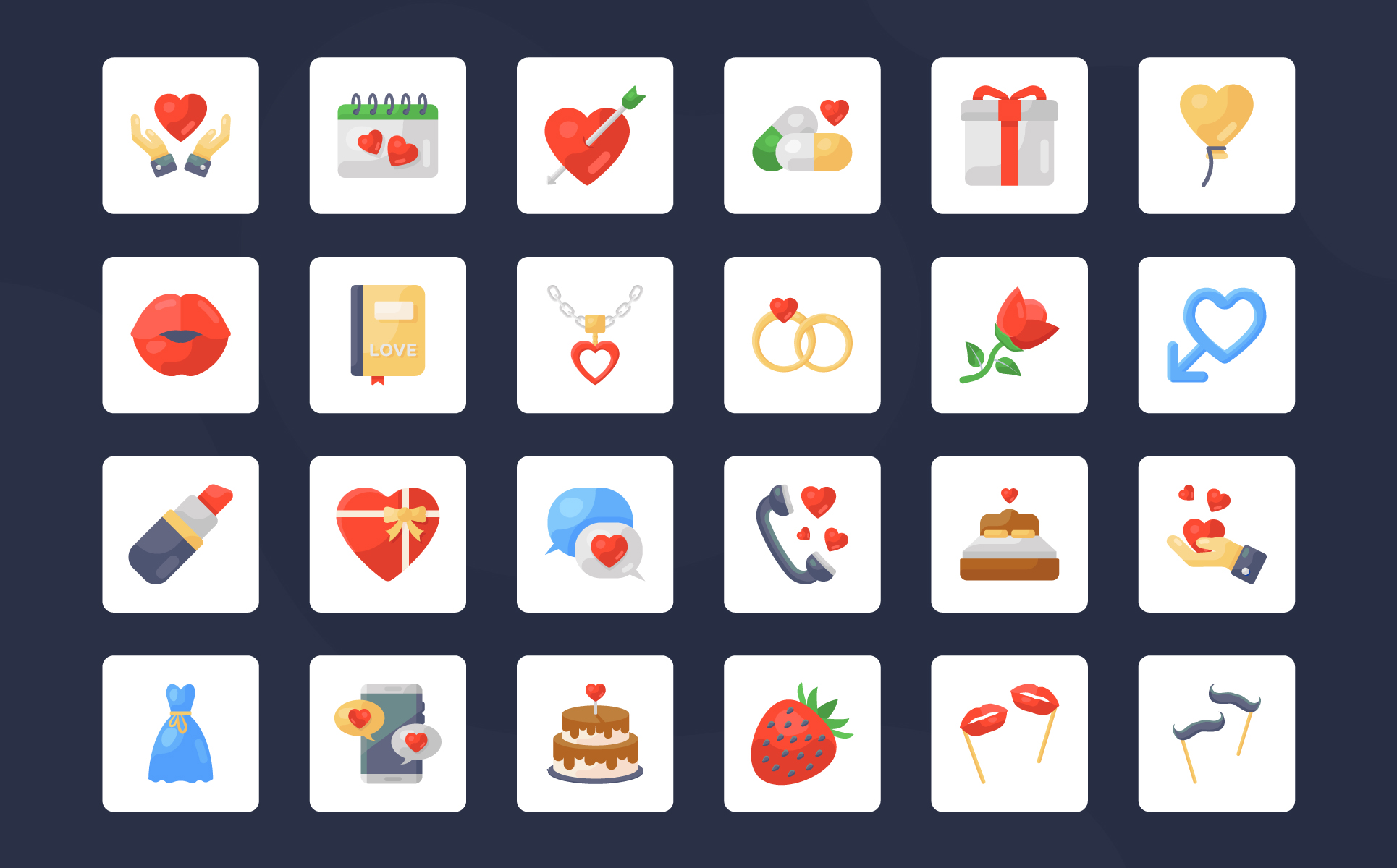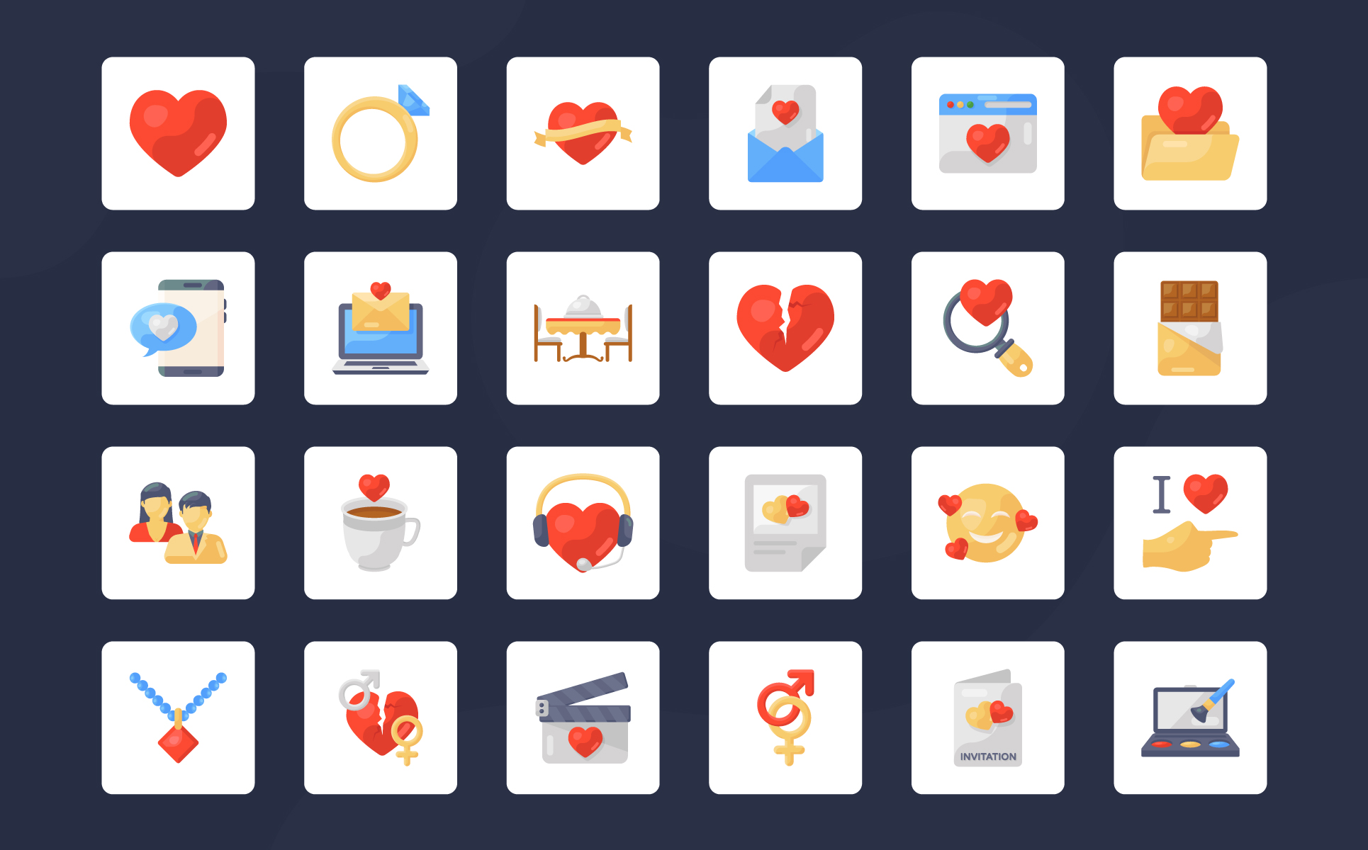 A pack of love and romance flat icons for your design project. Here we have changed the way that valentine and wedding graphic visuals art is used to support your assignment. These icons are in flat style with editable quality. Enjoy Designing!