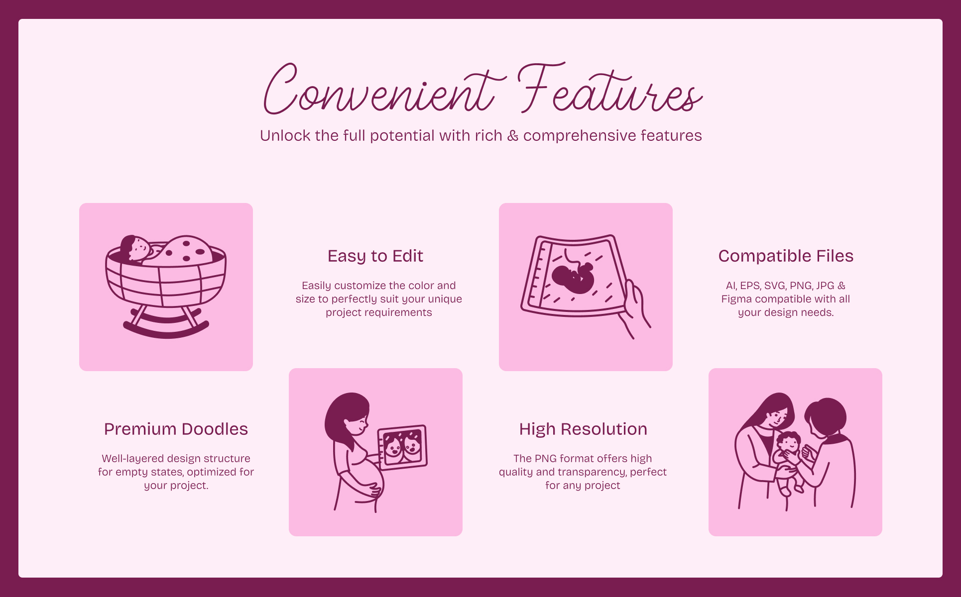 Bring a touch of warmth to your motherhood designs with the Medical Obgyn Doodles Set! This charming collection features hand-drawn doodles of pregnancy, baby care, and other gynaecological themes. Whether you're designing for a clinic, a parenting blog, or a maternity project, these adorable icons are perfect to go for all.