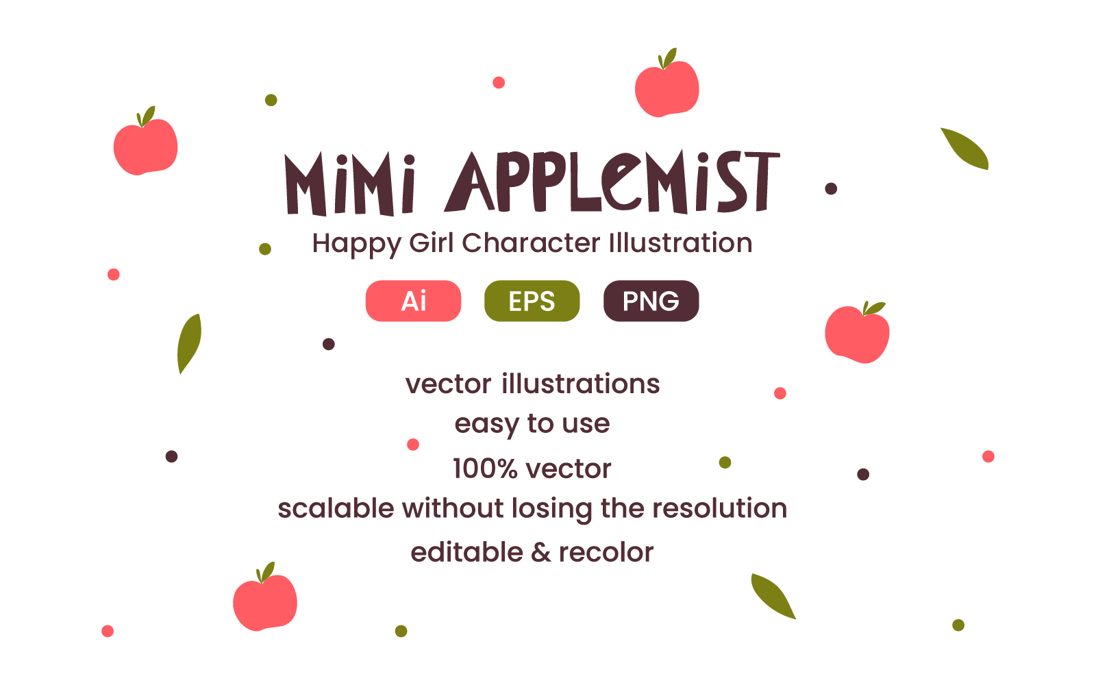 Meet Mimi— the happiest little dancer with a heart full of joy and apples on her dress! This adorable character illustration features Mimi in her signature red-and-cream outfit, twirling with charm, rosy cheeks, and playful ribbons. She's perfect for kids-themed projects, storybooks, stickers, merchandise, and more! Fully editable and high quality, this set comes in multiple formats so you can use it however you need — print or digital.