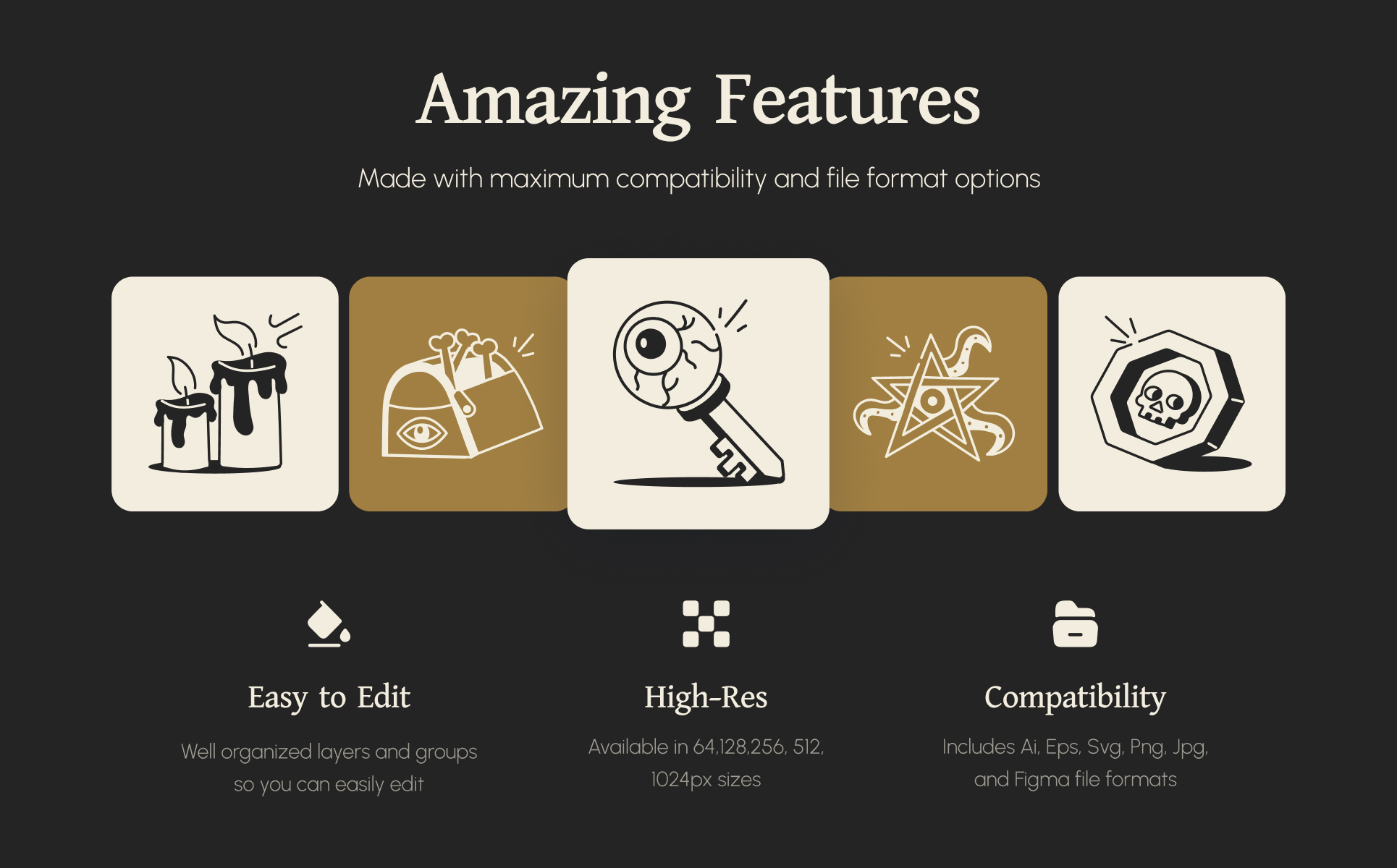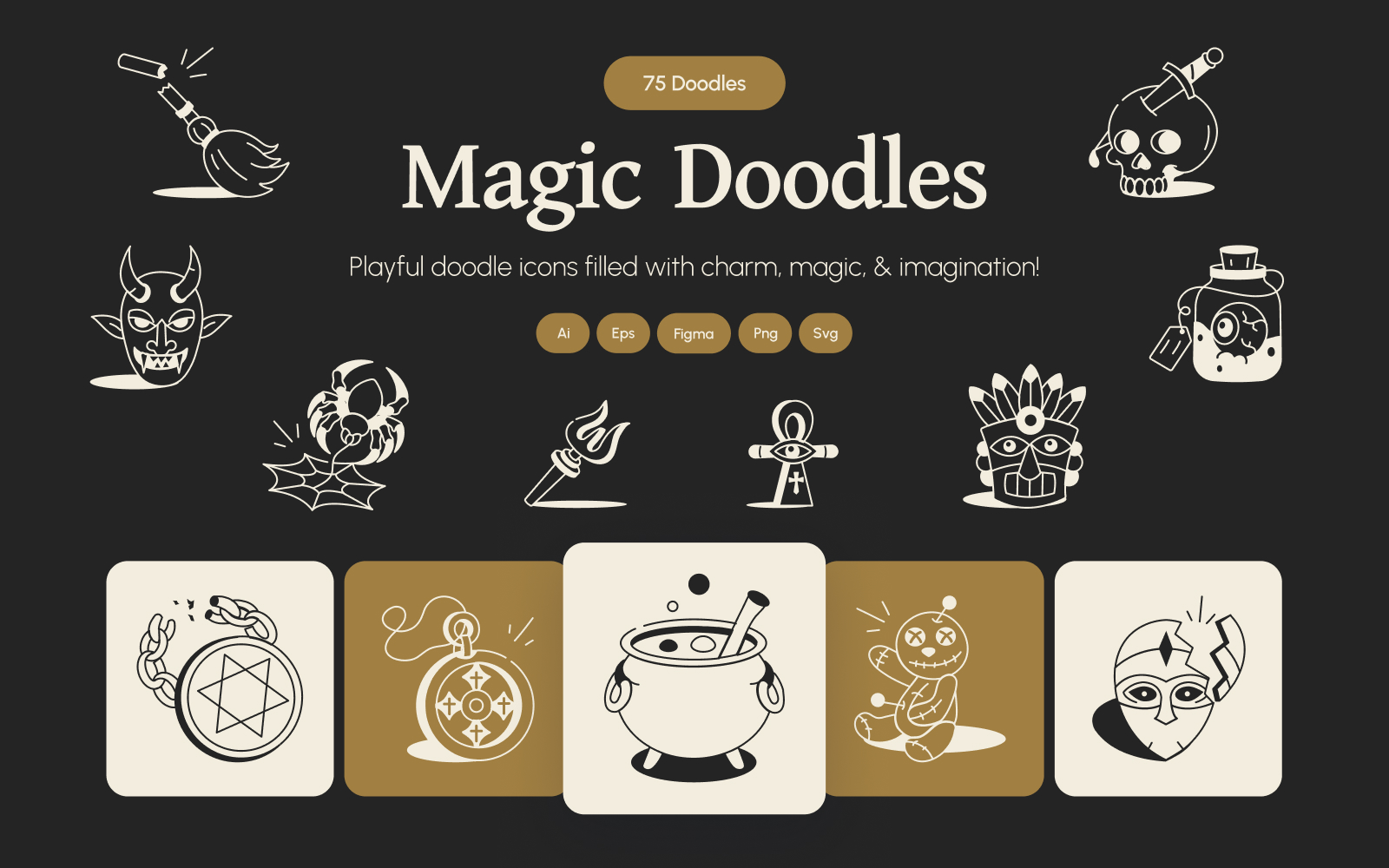 - 75 Unique hand-drawn magic icons – perfect for fantasy & mystic themes.