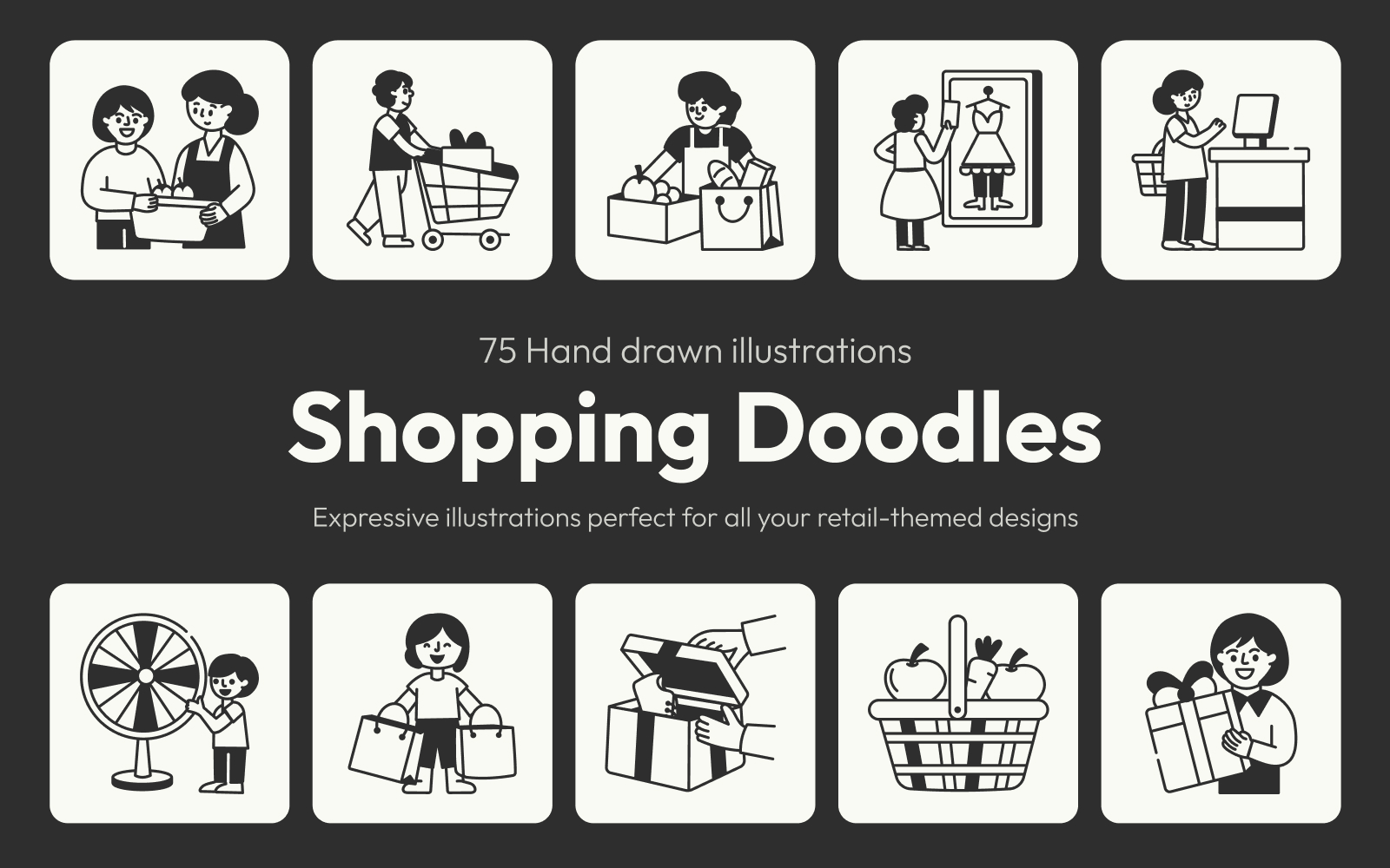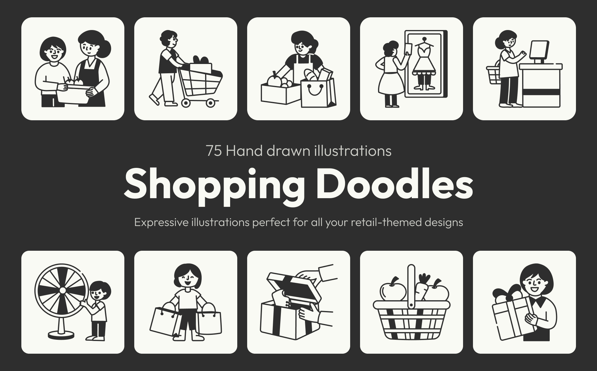 This Shopping Drawing Set is the perfect creative boost for your next retail themed project. Featuring hand drawn, stylish shopping illustrations, this set is great for app interfaces, websites, promo banners, posters, and more. Whether you're designing for mobile or print. Ideal for creatives, developers, marketers, and designers looking to add a human touch to their shopping visuals.