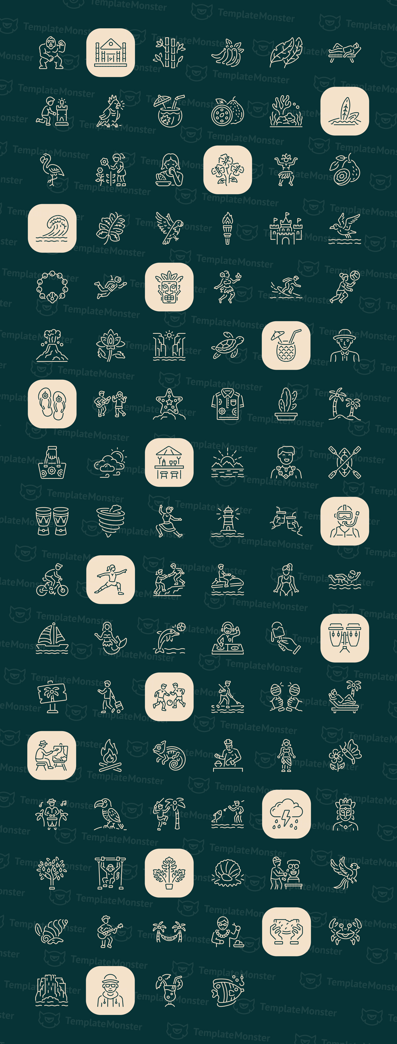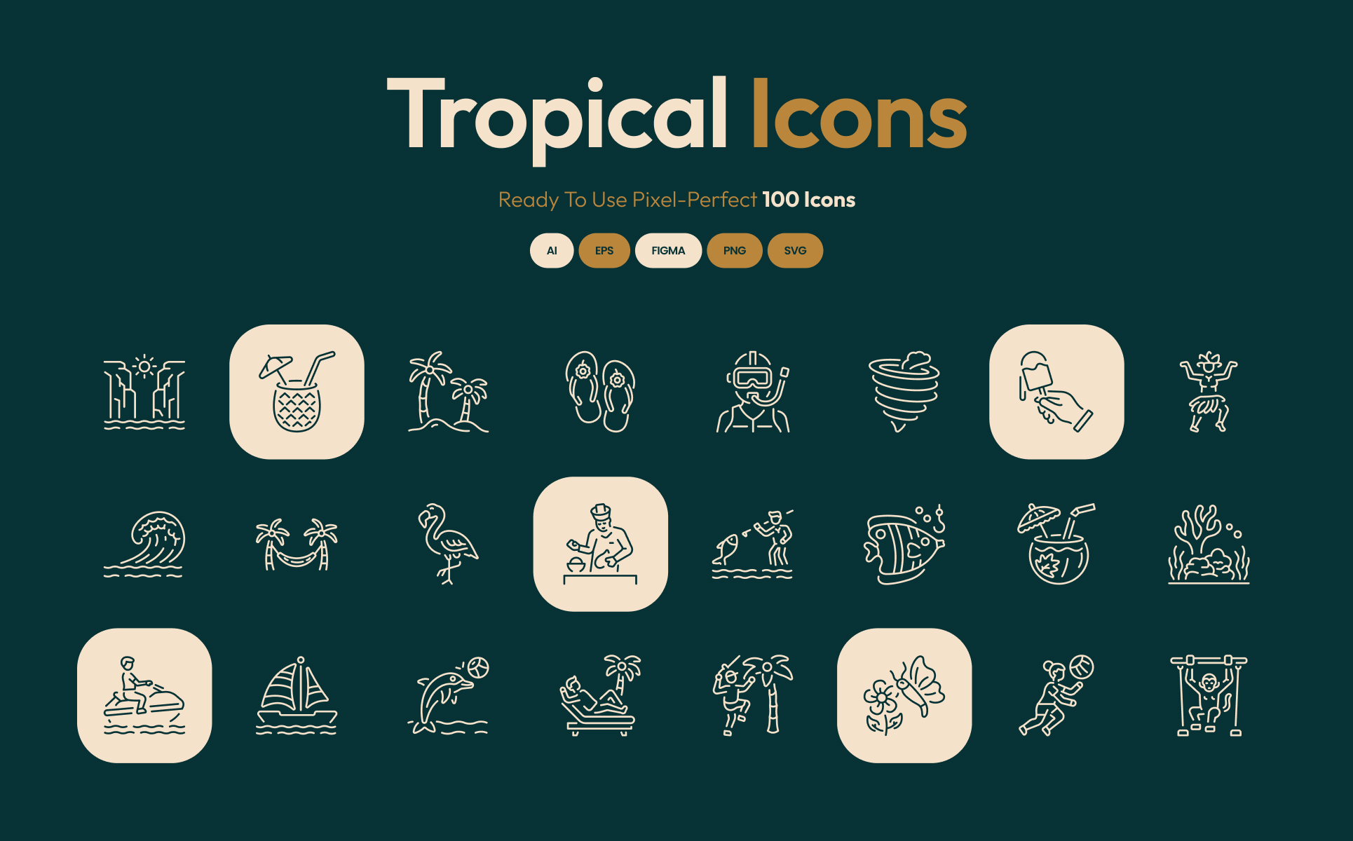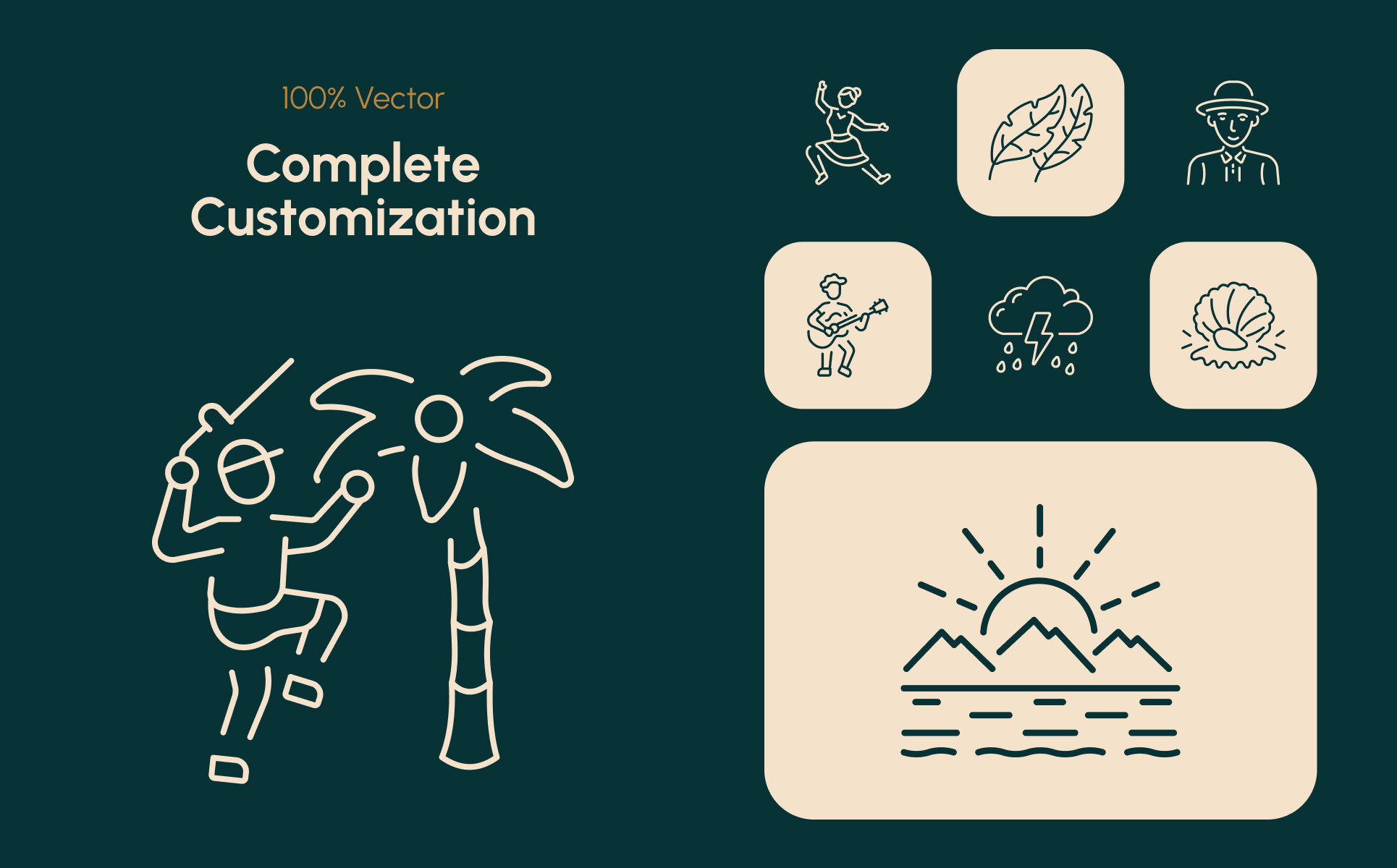 This Tropical Icon Art Set is your go-to design asset for everything bright and exotic. Whether you are working on a summer-themed app, vacation brochure, Instagram template, or packaging design, this collection offers versatile vector icons featuring tropical fruits, drinks, leaves, flowers, and animals. You can easily scale and customize them to fit your creative needs.