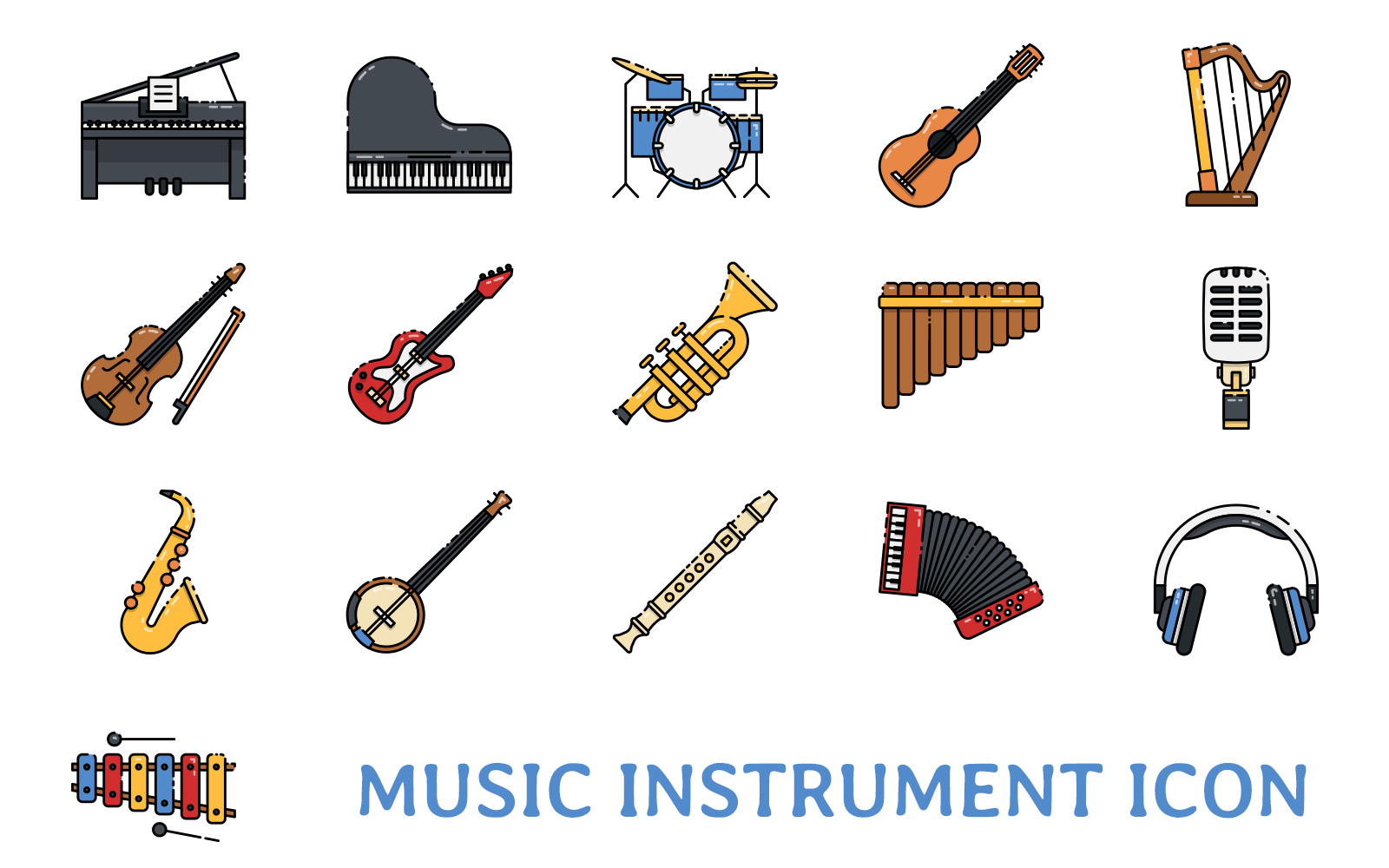 This is music instrument icon in vector. These icon have outline and different instrument. These icon collection have a lot of variation like: guitar, piano, violin, harp, drum and many more. There are 16 different icon.
