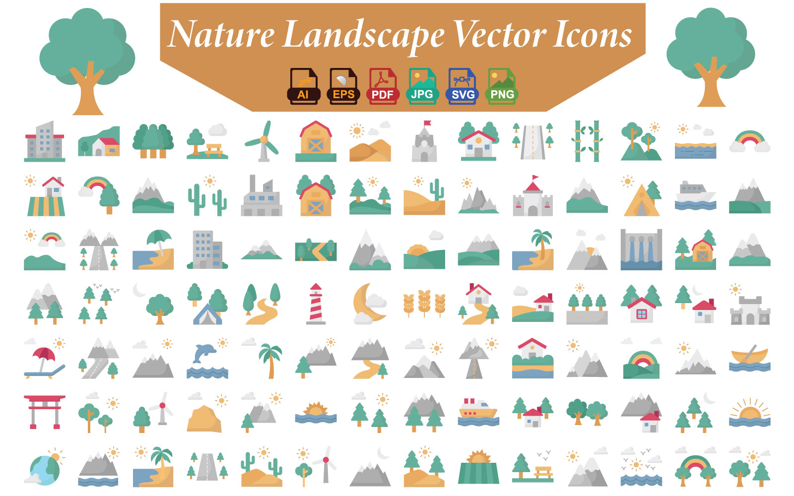 Nature and Landscape Icon Pack – 100 Minimal Outdoor Environment and Scenery Symbols in 6 Unique Styles for Eco, Travel, and Adventure Design Projects