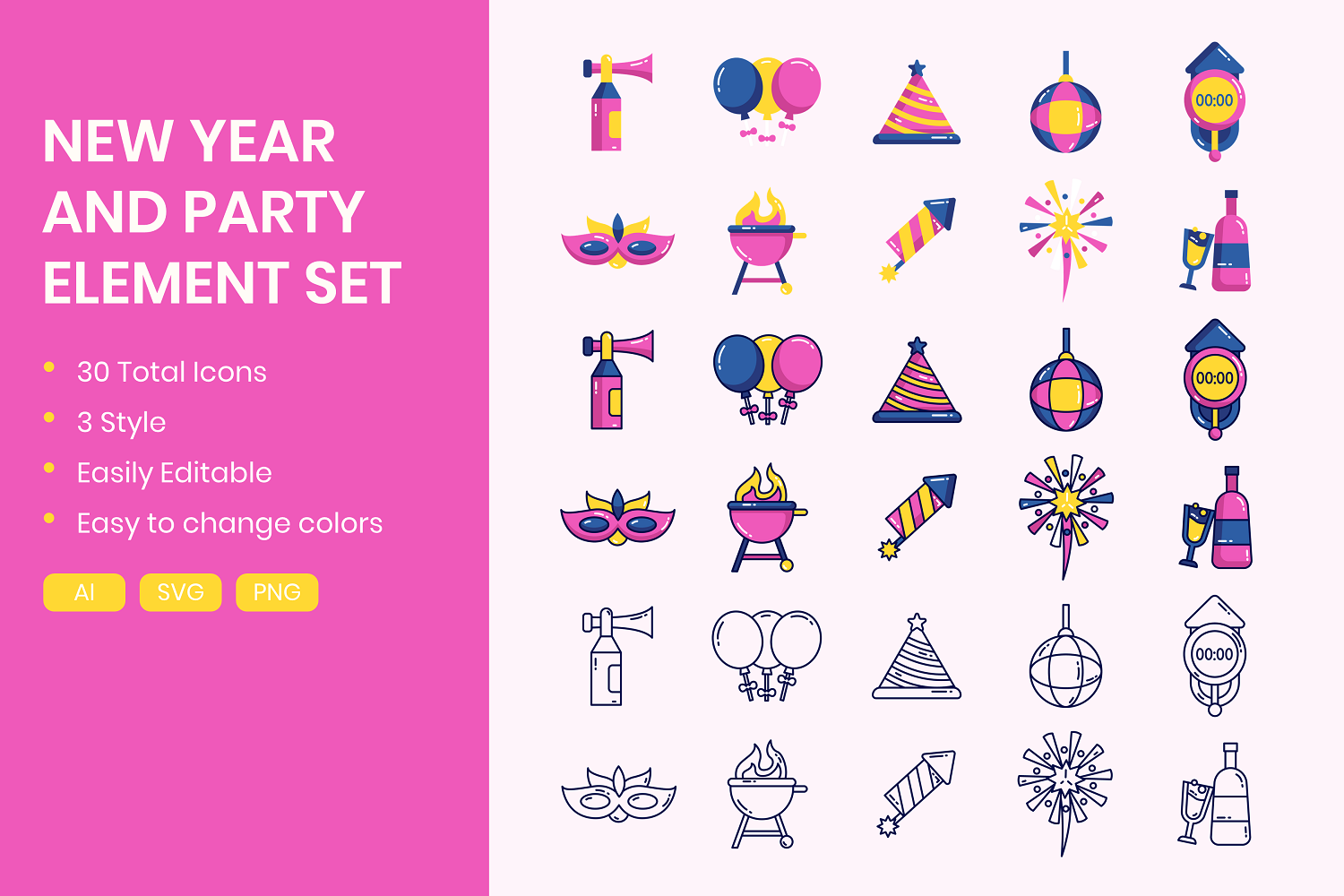 Step into the enchanting world of celebration with our New Year & Party Element Set, a vibrant collection designed to infuse joy and excitement into your festivities. This dynamic set captures the spirit of new beginnings and the thrill of ushering in a brand new year. Bringing real quality to your visuals, making them ideal for websites, flyers, apps, presentations and more, perfect for use in your projects.