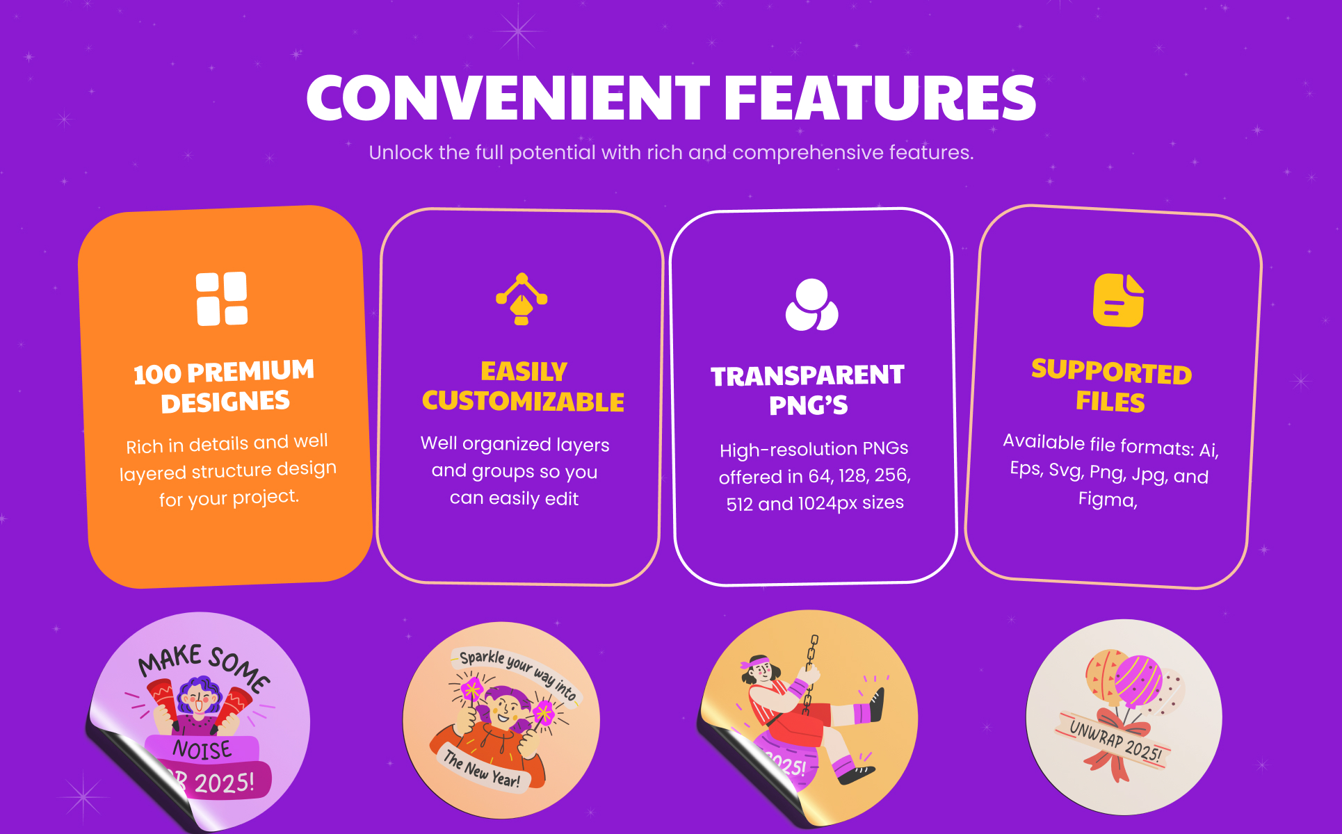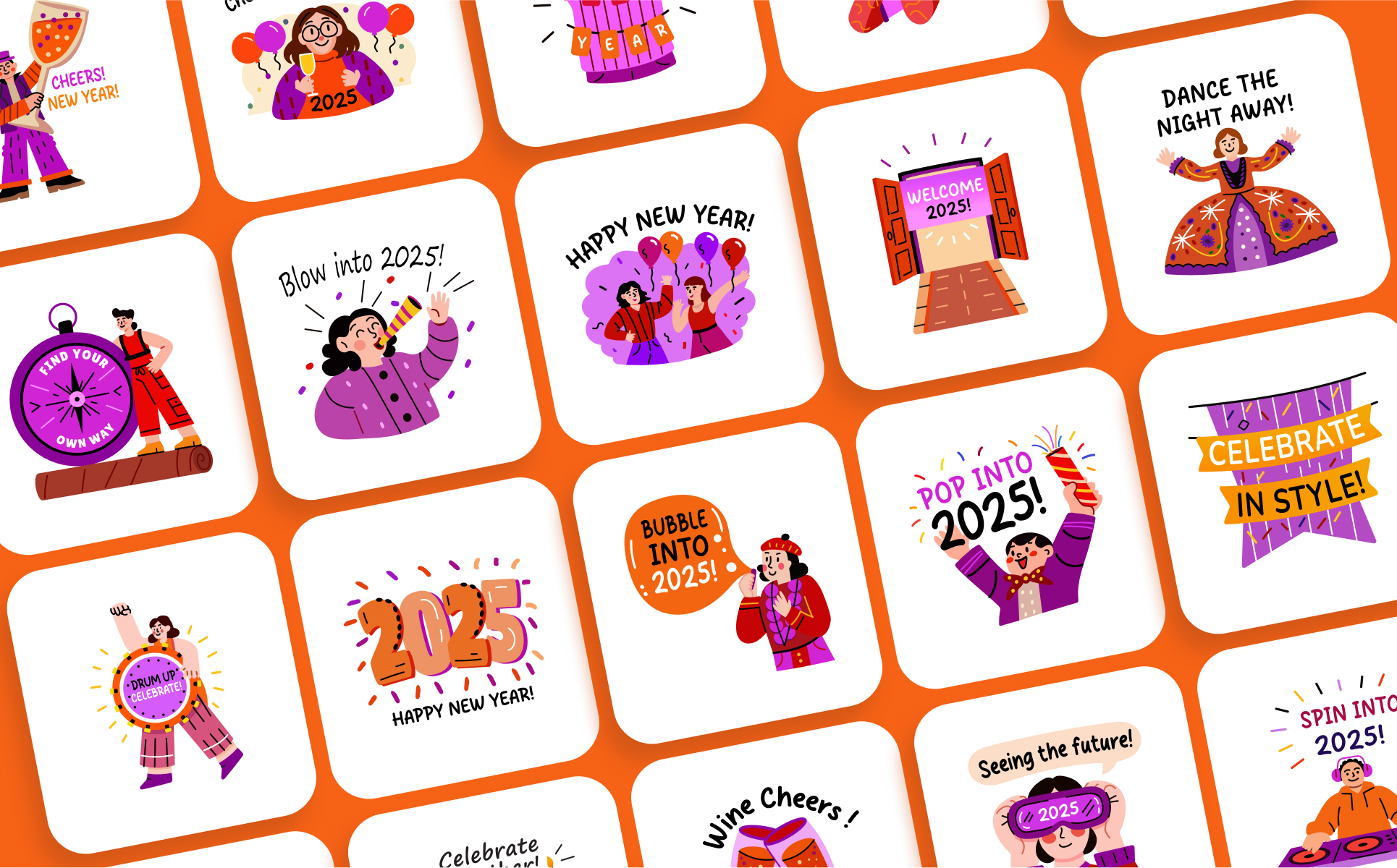 Bring the excitement of the new year into your designs with our new year stickers collection! Perfect for social media posts, crafts, cards, digital marketing, and party decor. Whether you’re a designer, crafter, or marketer, these stickers will add a festive touch to your projects with minimal effort!