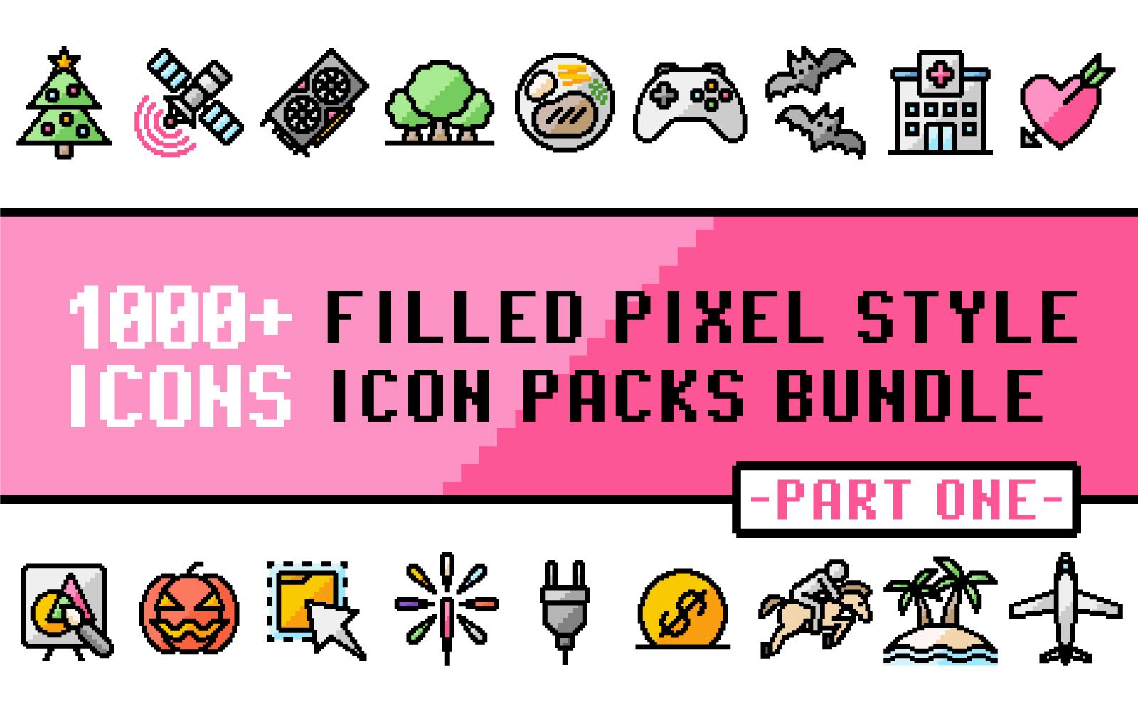Bundle of multipurpose icon packs in filled pixel style containing 1000+ icons. Editable vector icons can be resized to any size. Perfect for website, catalog, blogs, apps, design element, etc.