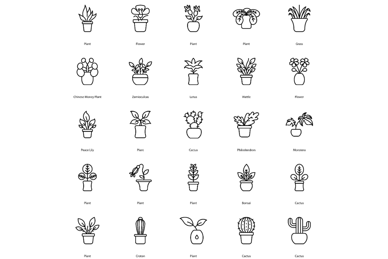 Plants Icon set Flowers Icon Bundle. This icon set includes a variety of plants and related elements. The icons are simple and modern. They are ideal for use in a variety of projects, from website and app design to product packaging. The icons are designed to be versatile, allowing for easy integration into a variety of designs.