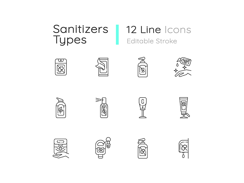 Bundle contains 12 linear icons such as pocket hand sanitizer, disinfecting wipes, alcohol free sanitizer, skincare lotion, liquid soap in tube, spray hand, dispenser for public restroom, disinfectant skincare product, automatic hand sanitizer dispenser, keychain holder for tube with liquid soap, antibacterial gel, touchless automatic dispenser.