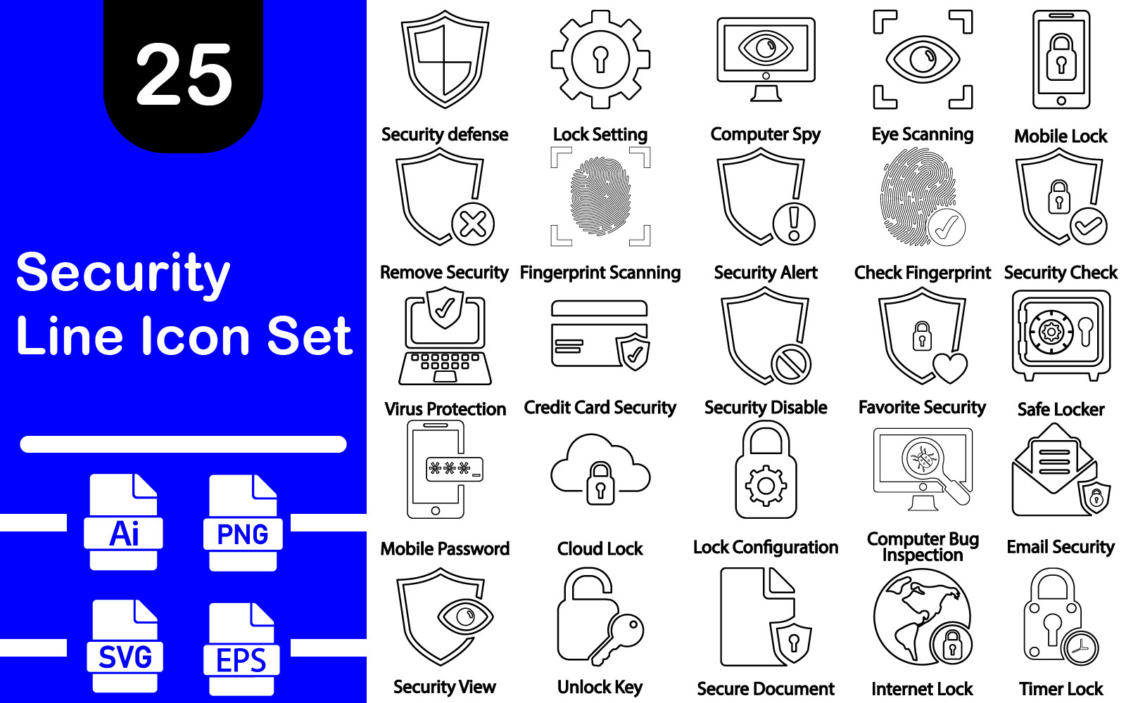 Beautiful, meticulously designed 25 Security Line Icon Set. Perfect for use in designing and developing websites, printed materials, presentations, Promotional Materials, Illustrations, Info graphics or any type of design projects