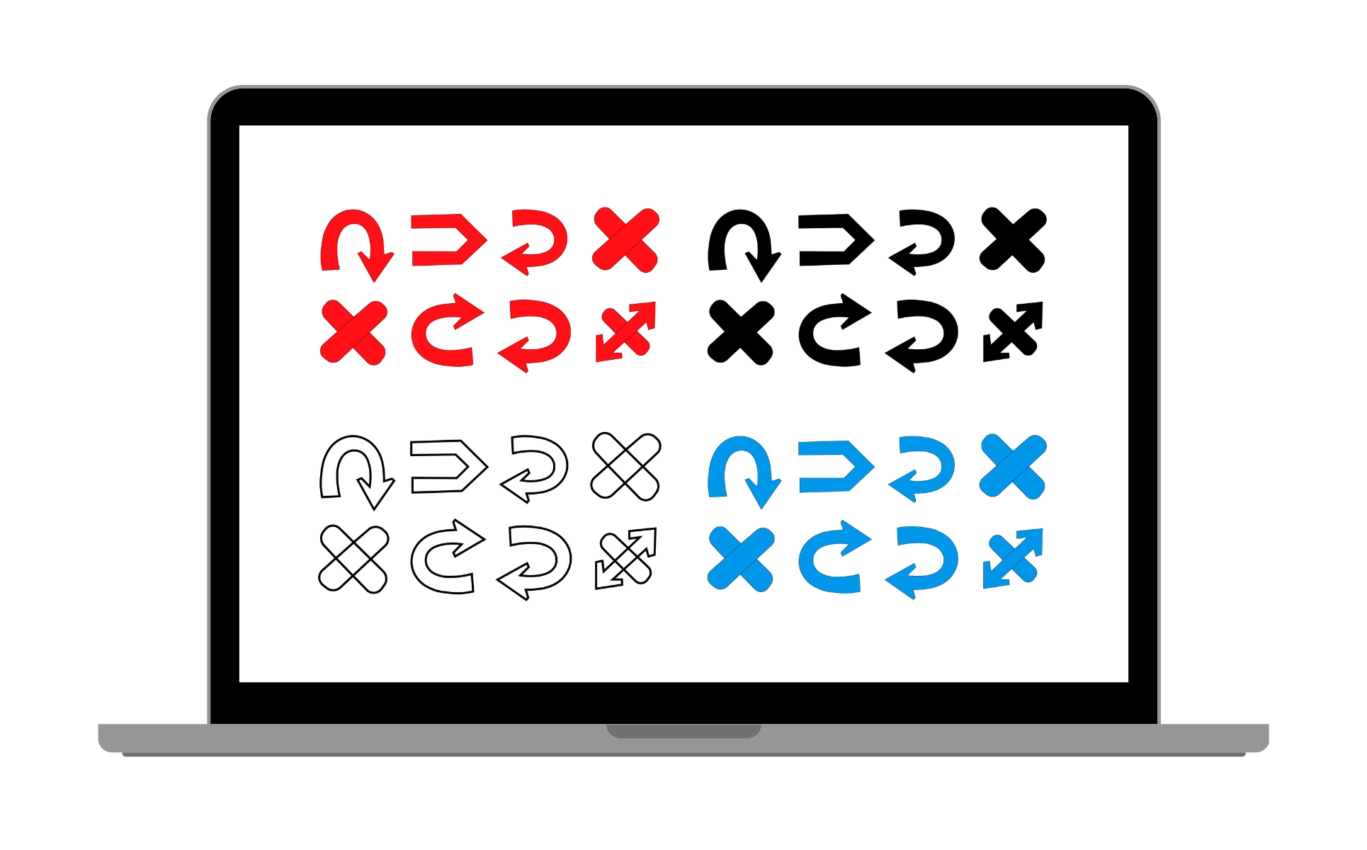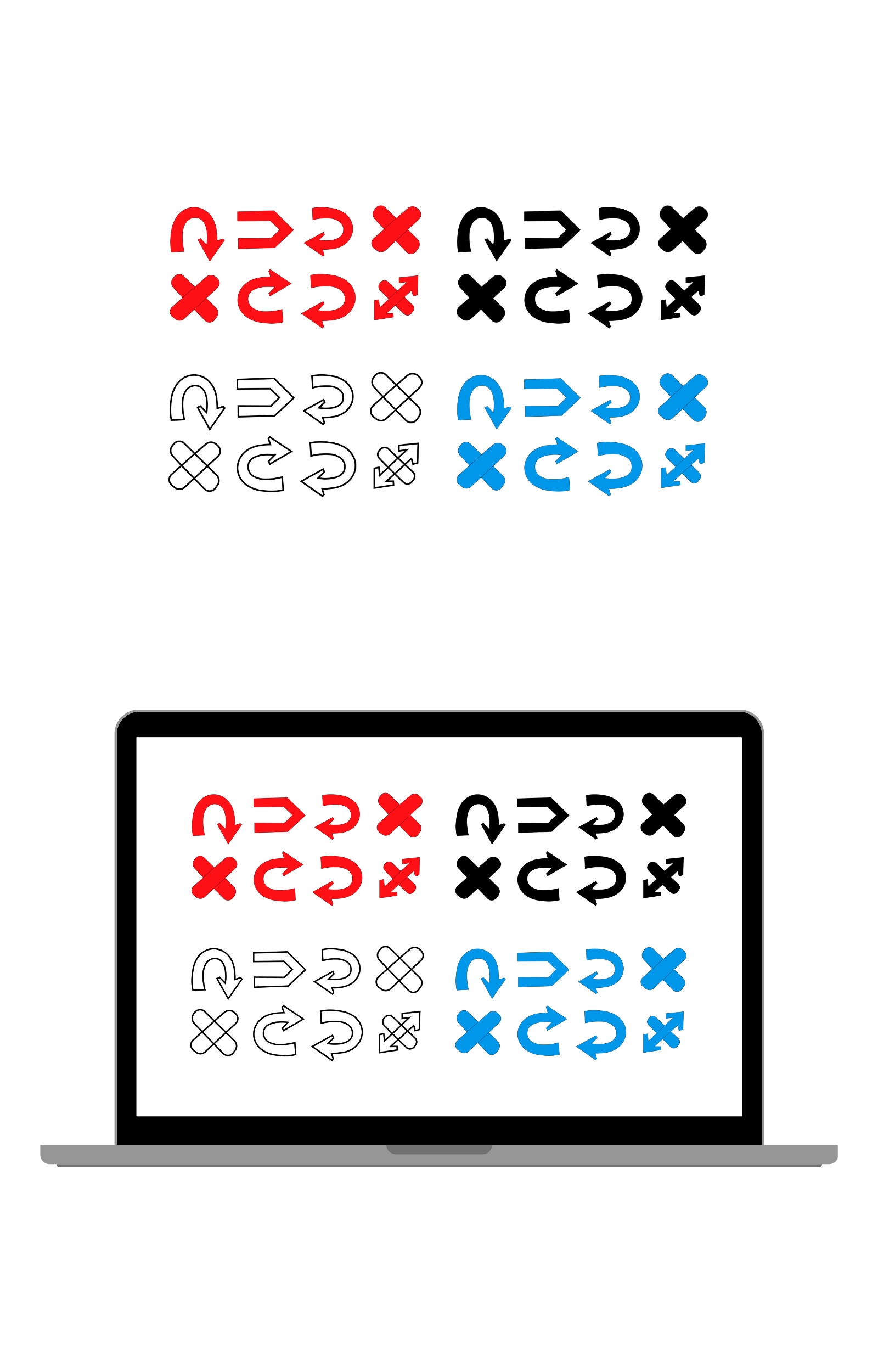 Set of arrows and crosses in red, black, blue and outline, isolated on white background Icon Set