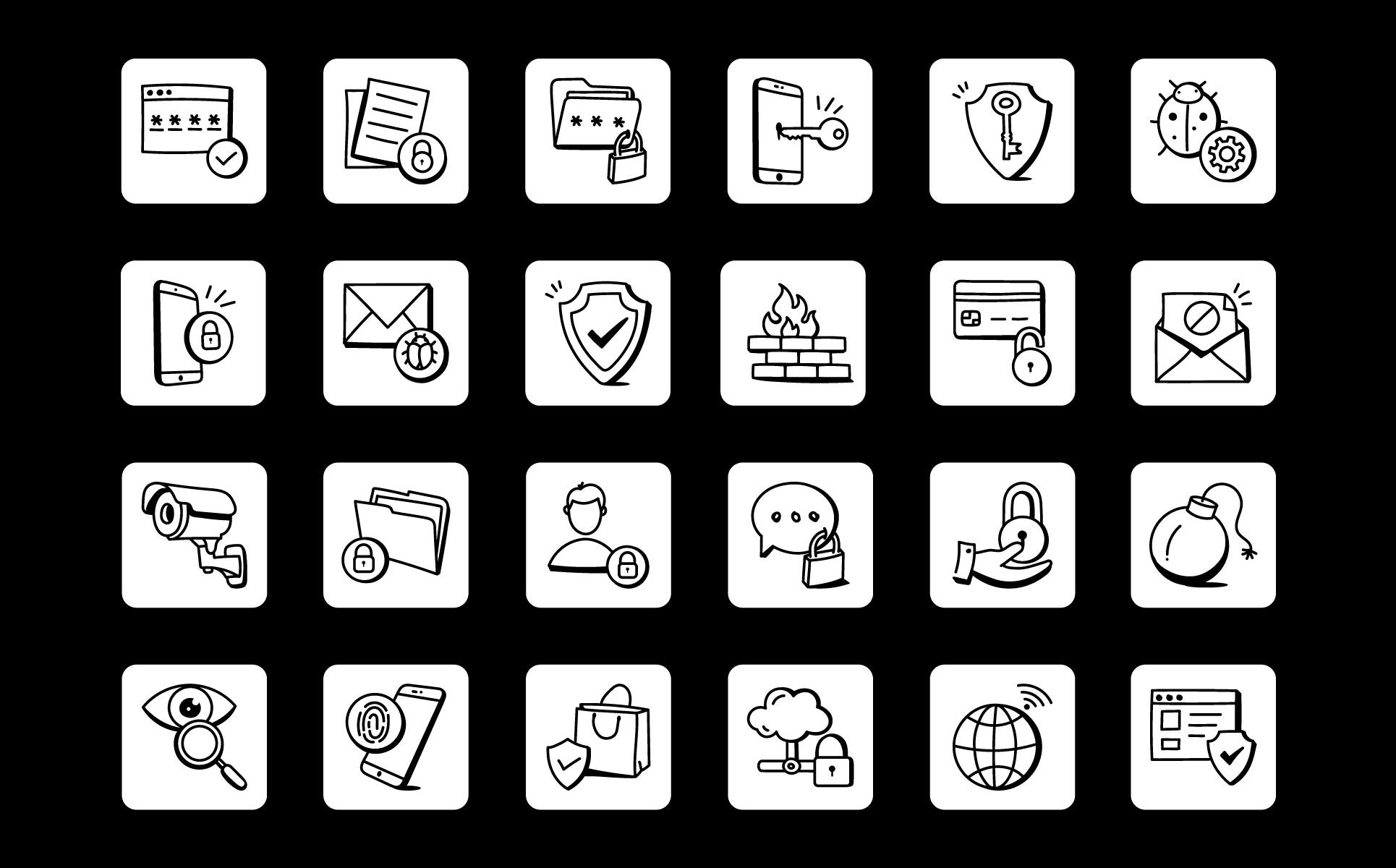We have crafted security icons effectively. This pack of doodle vectors comprises the concept of cybersecurity, data protection, bug detection as well as antivirus designs. These visually perfect vectors can be used for web pages and onboarding mobile apps.