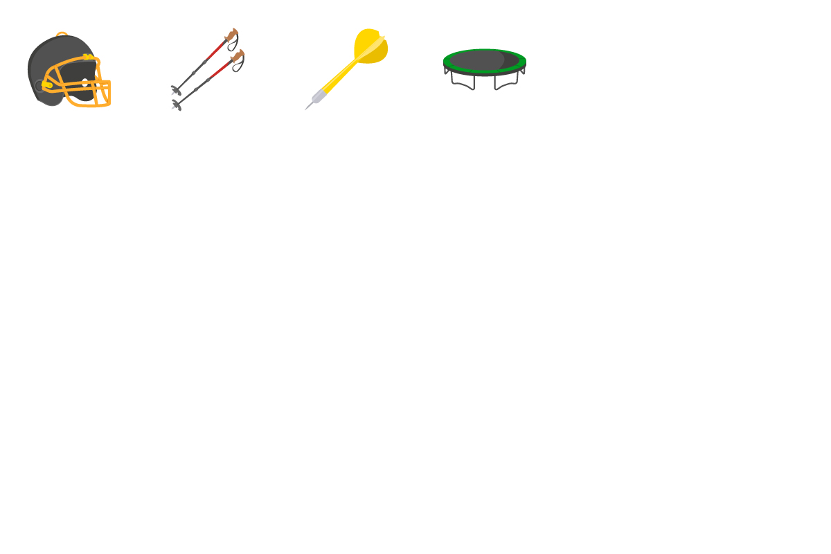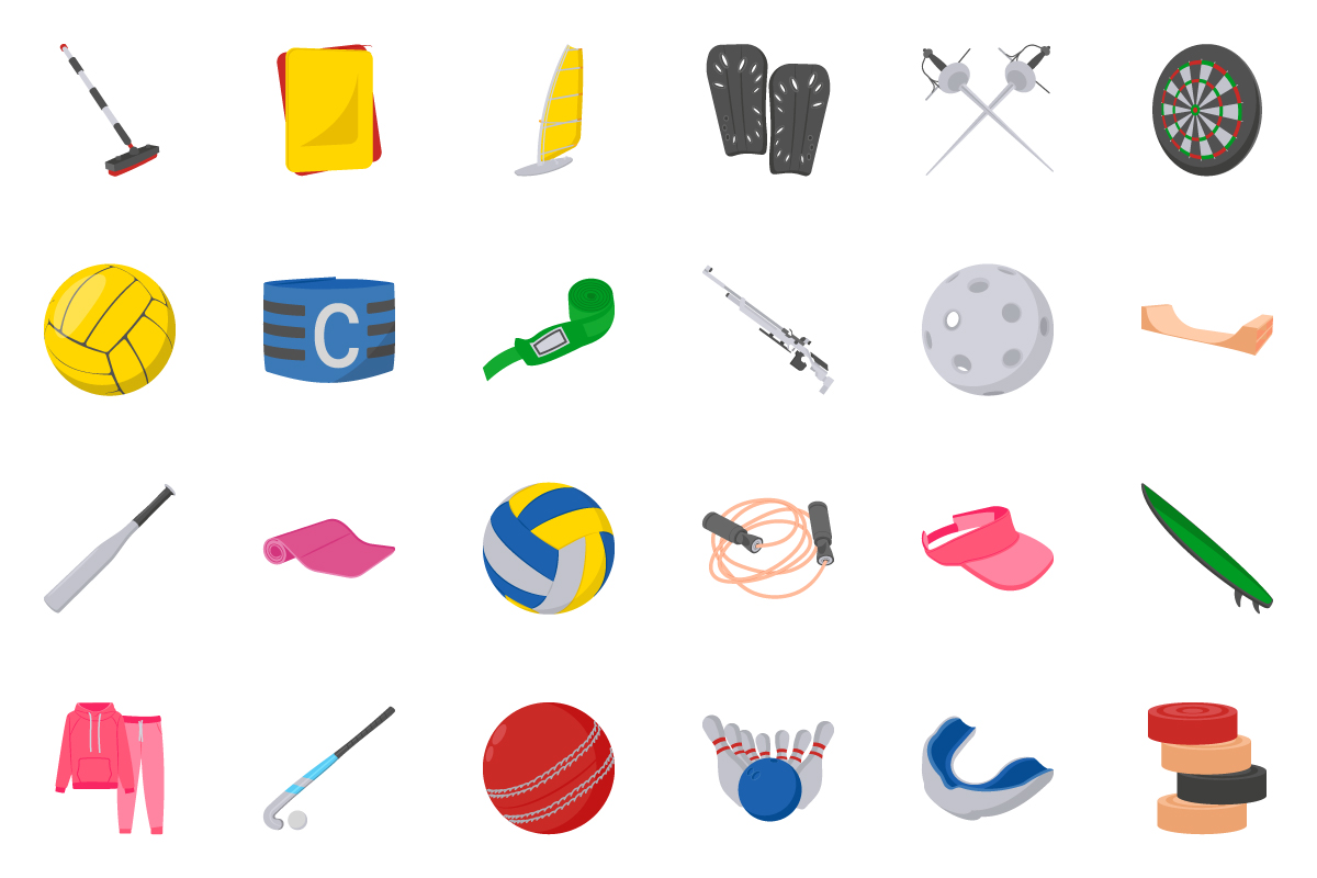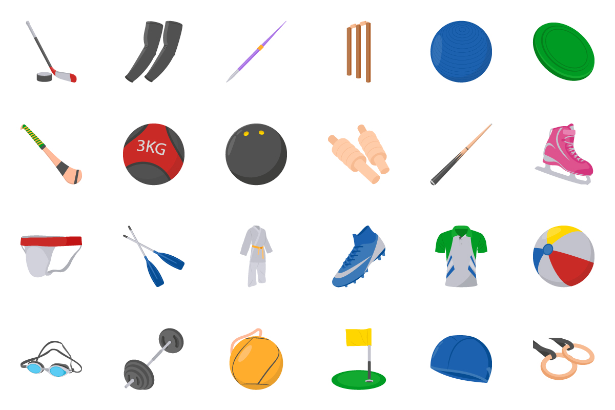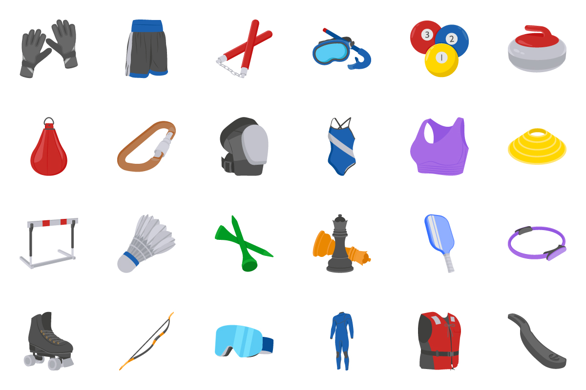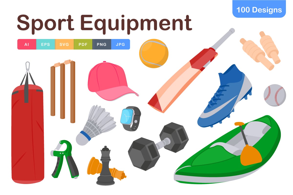 - Detailed equipment illustrations (weights, balls, rackets, helmets)
