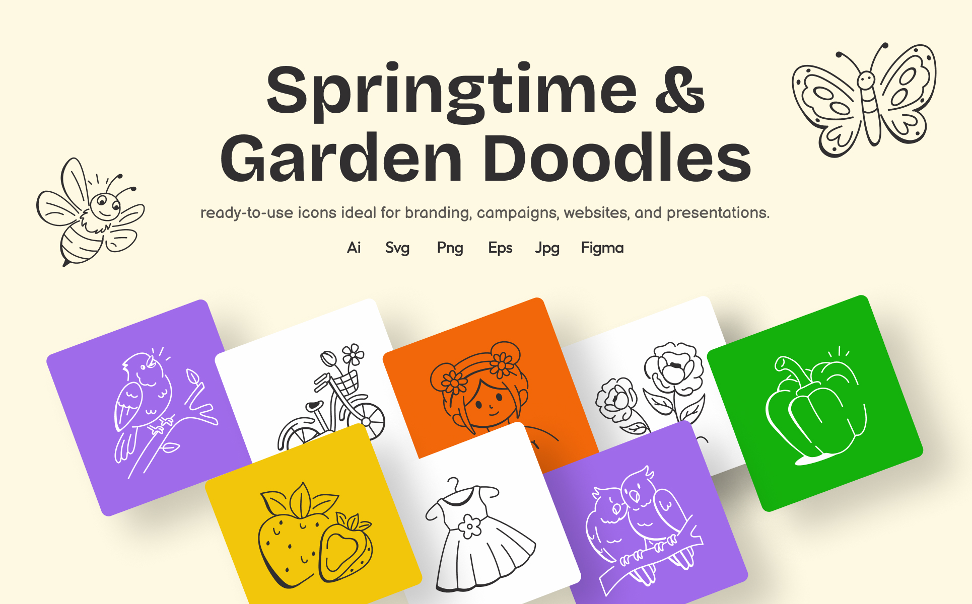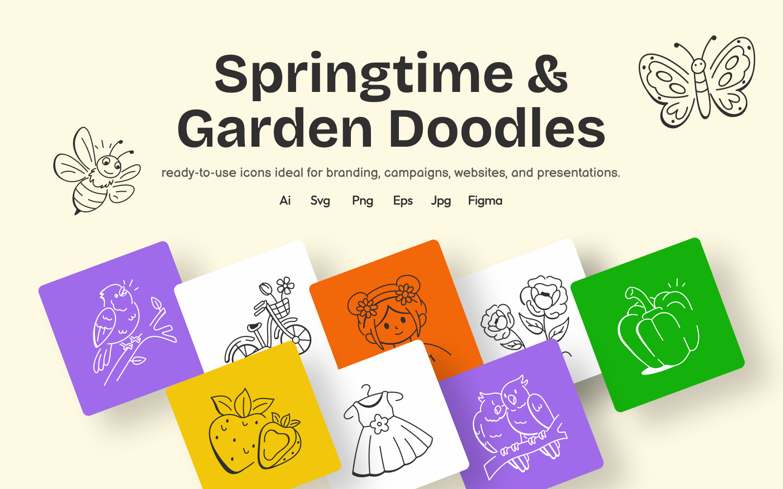Bring the charm of spring into your creative projects with this delightful Springtime and Garden Doodles Set. Whether you’re creating website banners, social media posts, invitations, or printable, these versatile doodles add a refreshing spring vibe. These beautiful icons are easy to use and adapt for all your design needs. Let your projects blossom with a touch of seasonal charm!