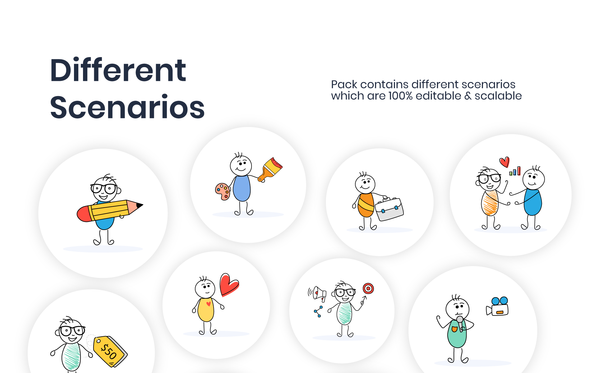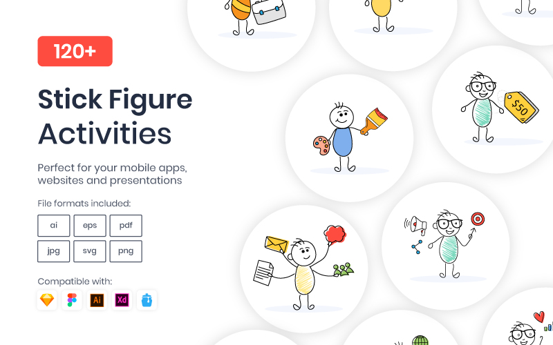 Cute as a button! These Stick Figure Activities Illustrations are beautifully created. With over 120 illustrations to choose from, you will never run out of ideas. It will look amazing in your websites, mobile apps, presentations or print projects. Download now and have fun designing with these cute cartoons.