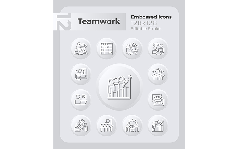 Team collaboration. Neumorphism effect. Isolated vector illustrations. Minimalist button design collection. Editable stroke. Montserrat Bold, Light fonts used.