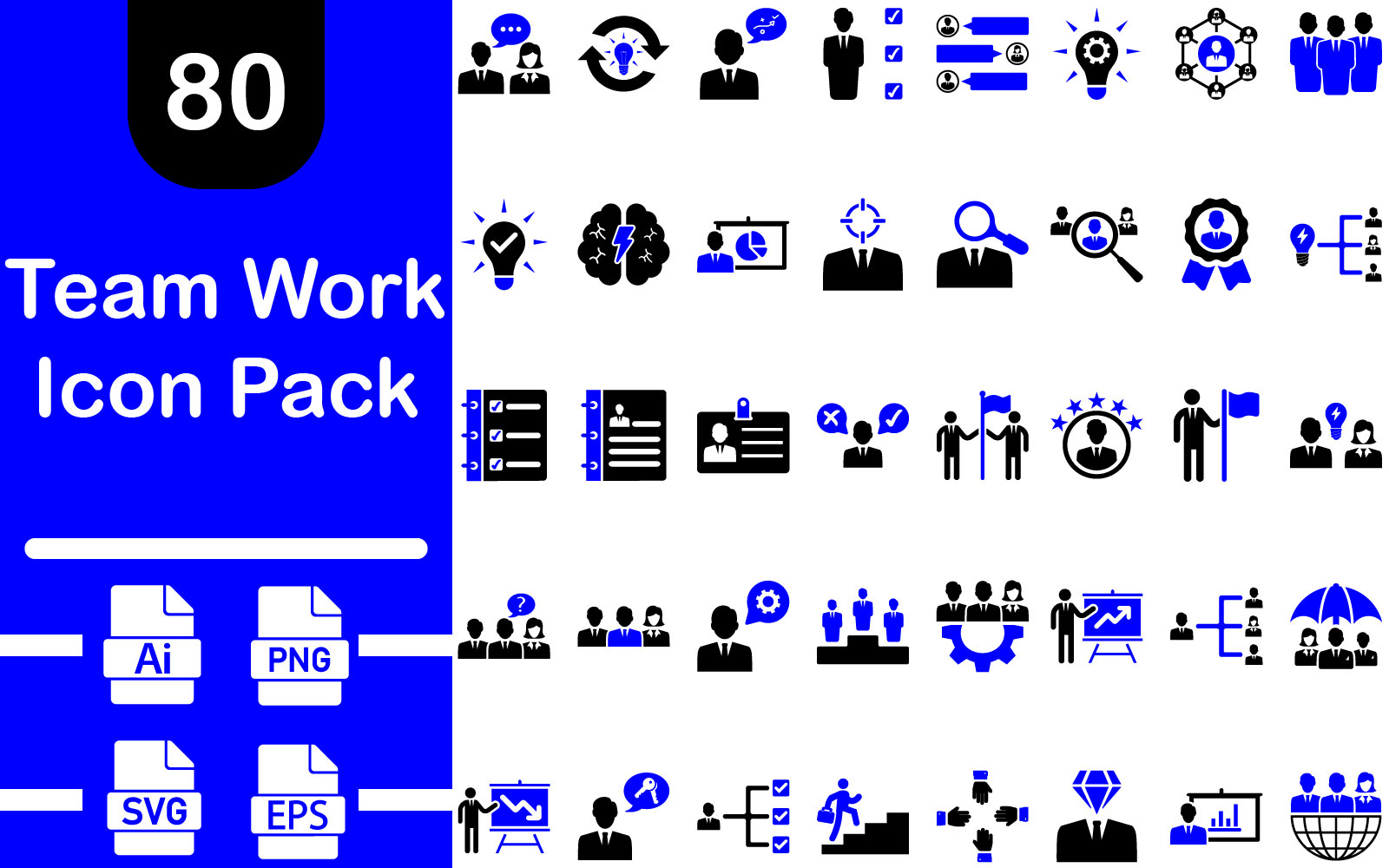 Beautiful, meticulously designed 80 Team Work Icon set. Perfect for use in designing and developing websites, printed materials, presentations, Promotional Materials, Illustrations, Infographics or any type of design projects