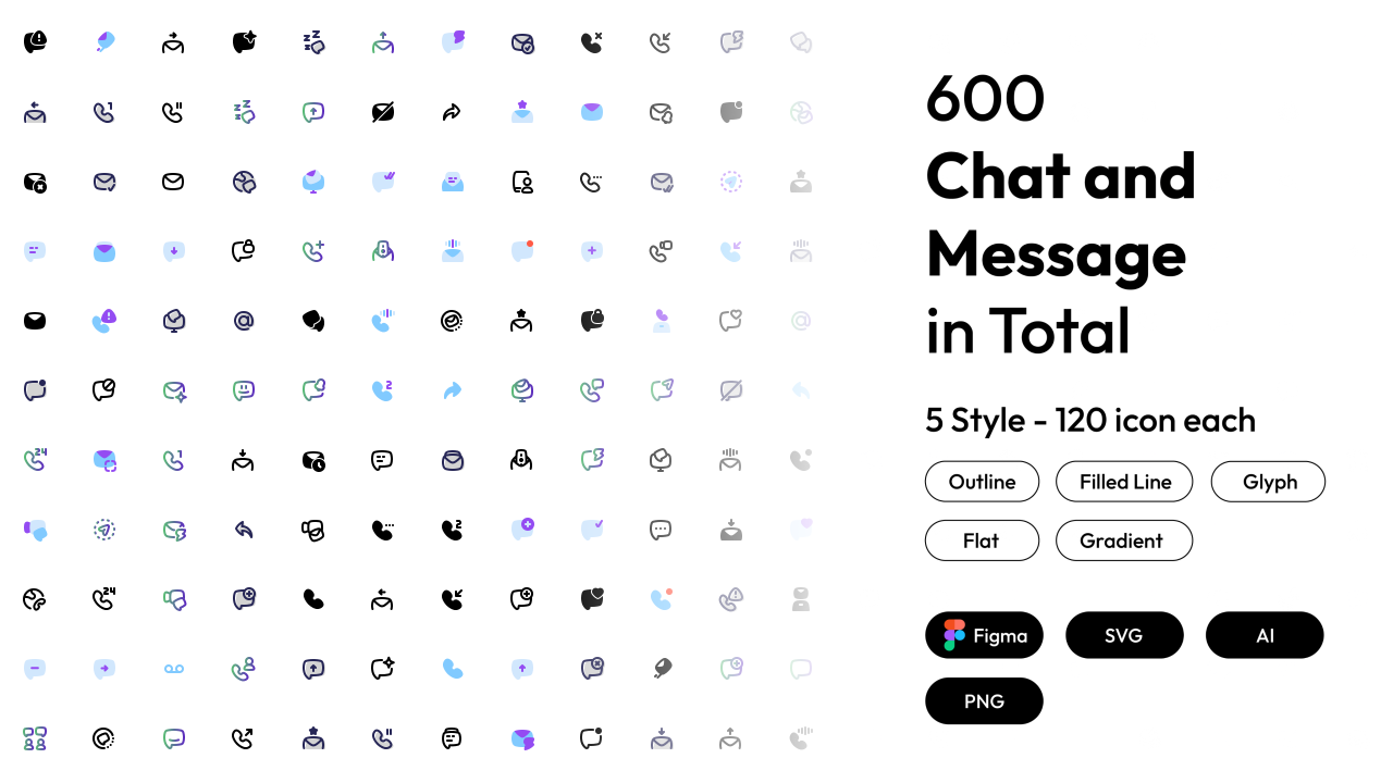 Elevate your Communication app projects with our comprehensive vector icon set, featuring 600 meticulously crafted icons across 5 unique styles: Outline, Filled Line, Flat, Glyph, and Gradient. With 120 icons in each style, this versatile collection is designed to give your application, website, and graphic content the perfect visual elements to stand out. Available in FIG, SVG, AI, PNG formats, each icon is scalable and pixel-perfect, ensuring it fits perfectly in any design.