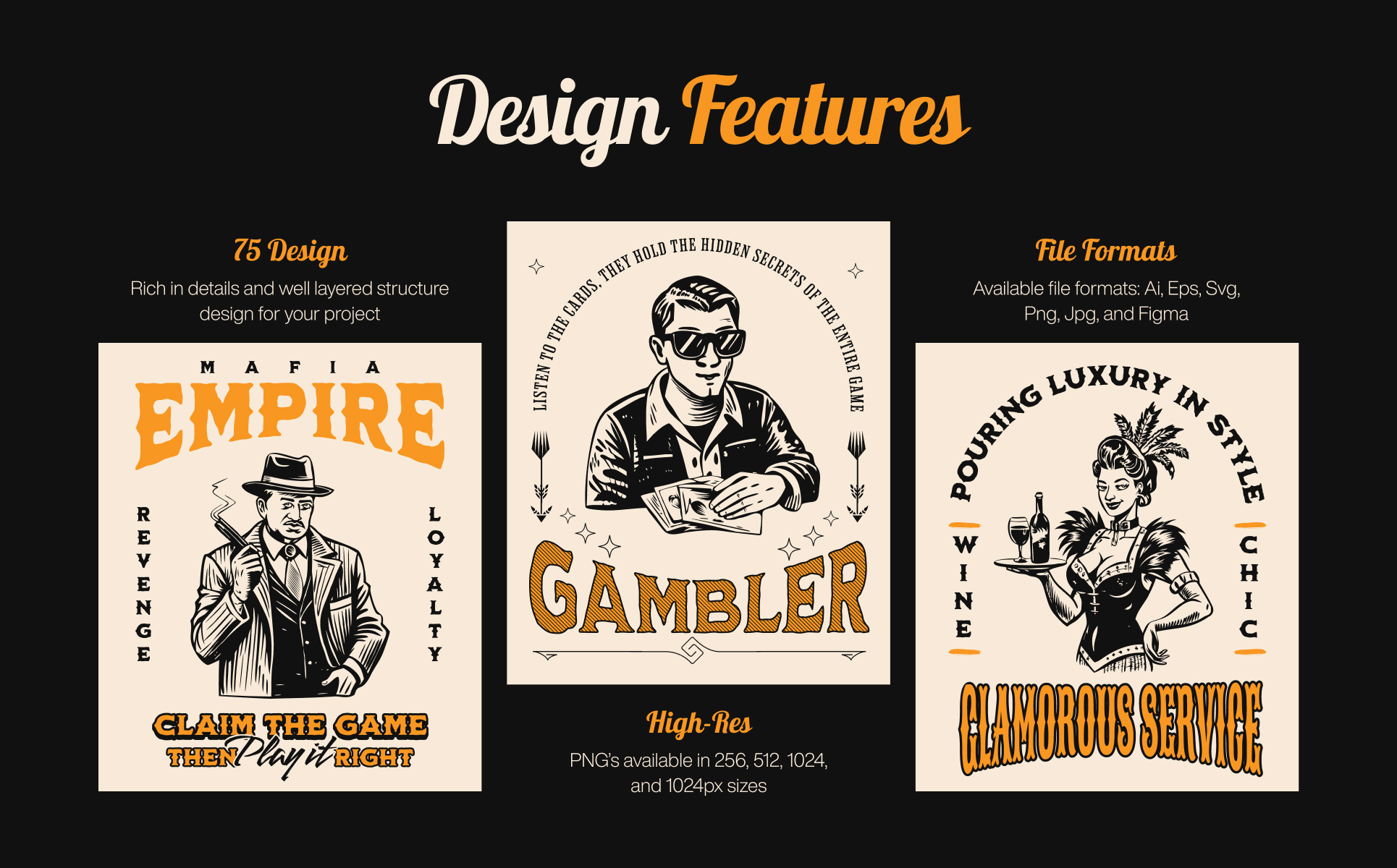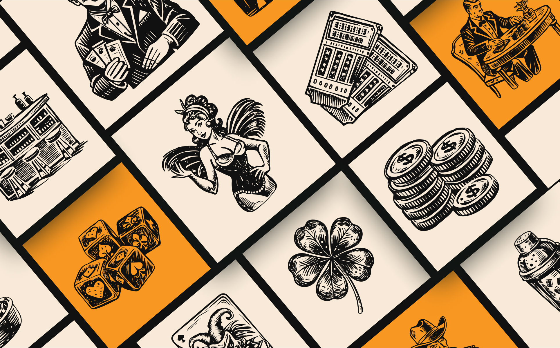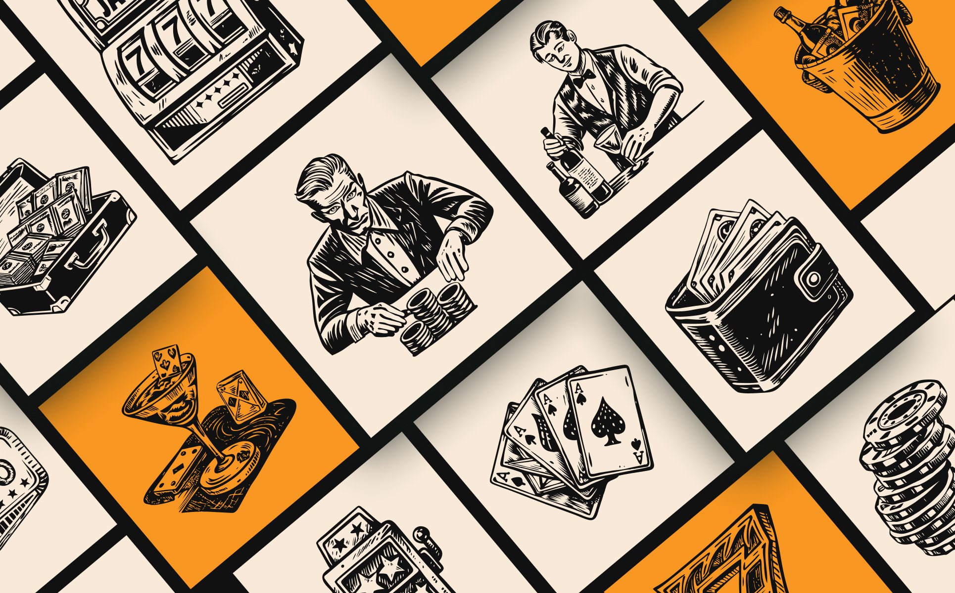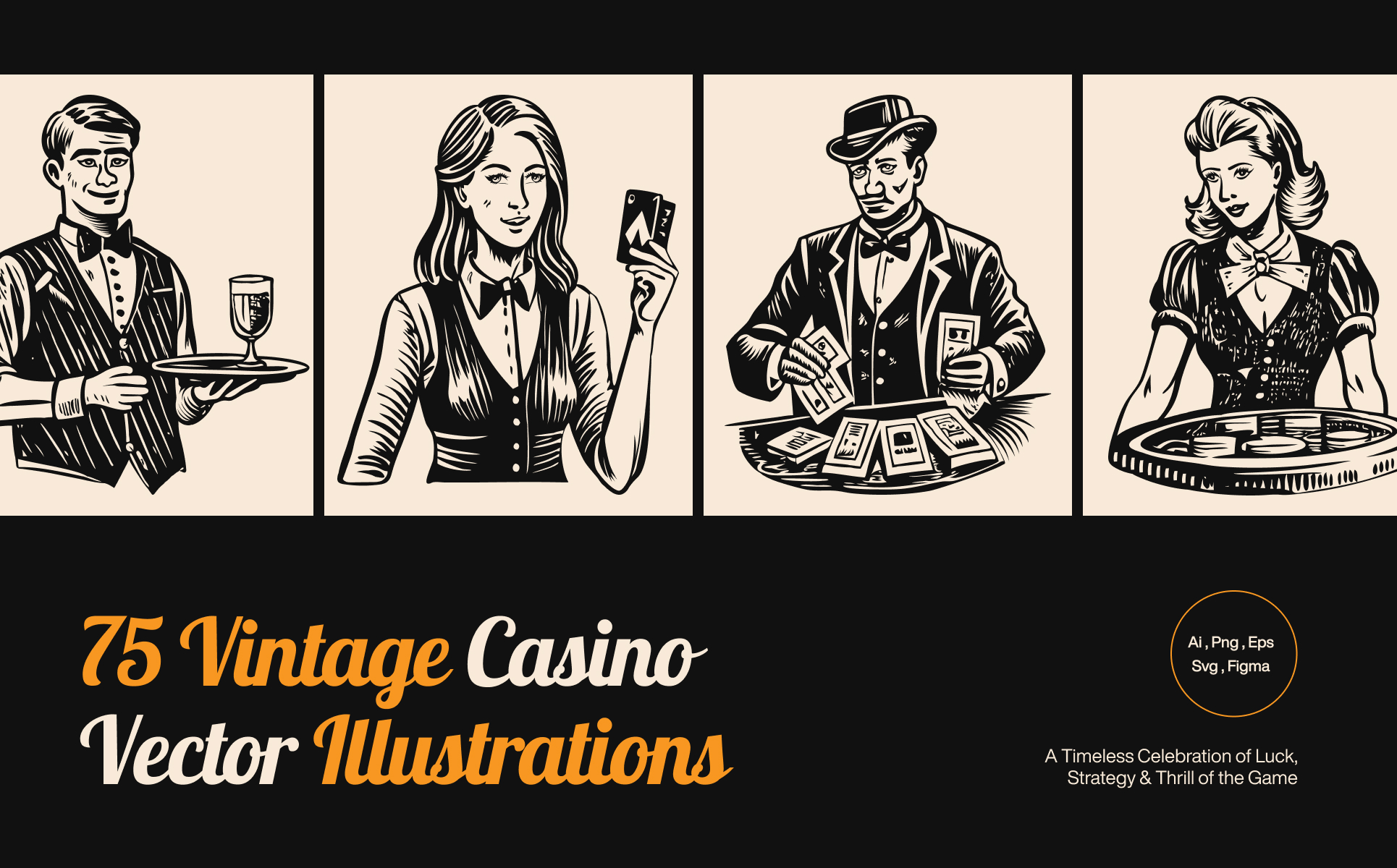 Step into the golden age of gambling with this Vintage Casino Vector Set! Featuring classic casino elements like poker chips, playing cards, dice, money stacks, and more—all designed in a sketchy, high-quality vector style. Whether you're creating casino branding, gambling-themed posters, websites, or merchandise, these vector graphics will bring a touch of timeless casino charm to your work.