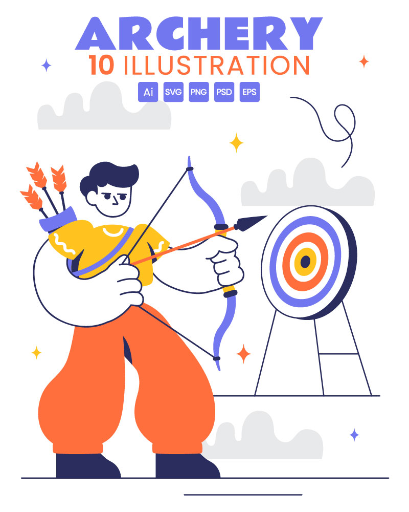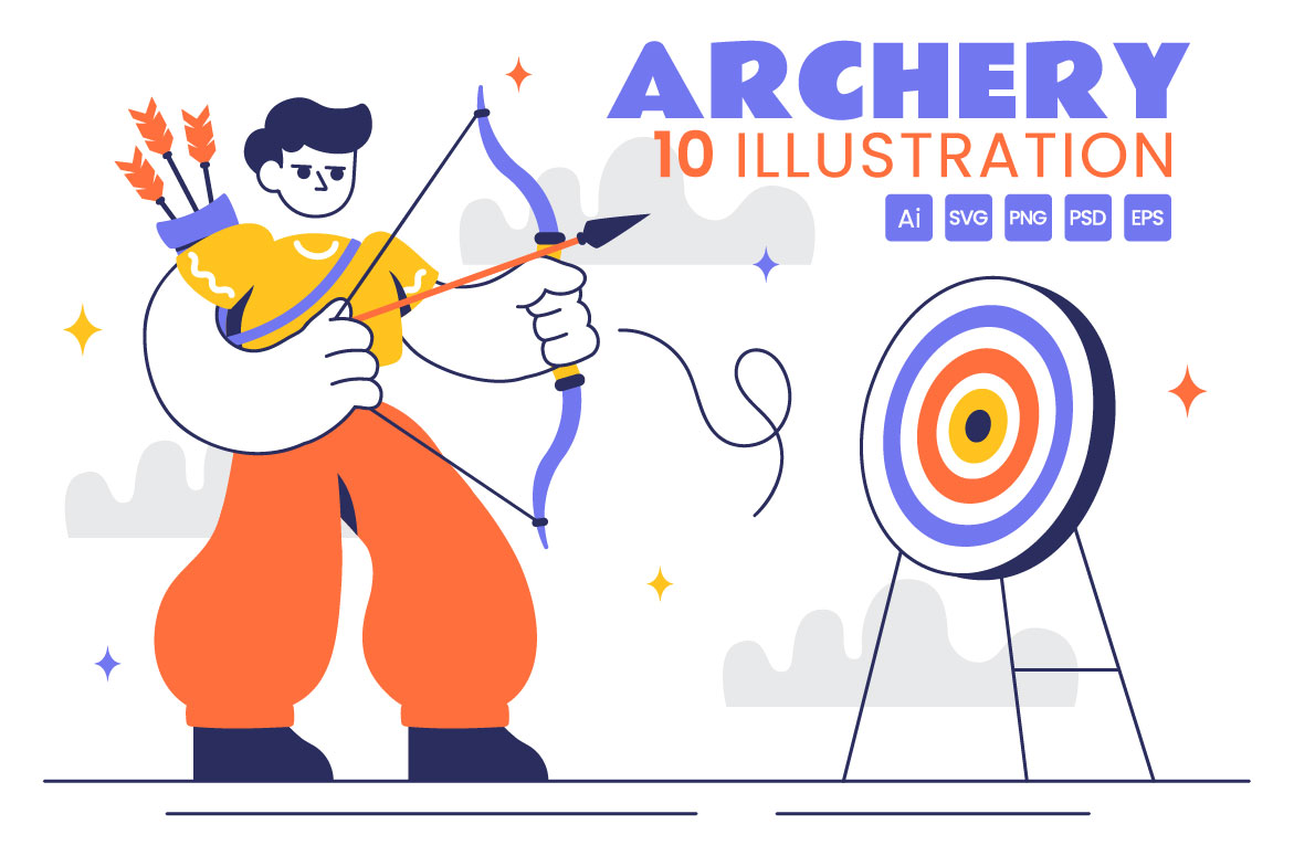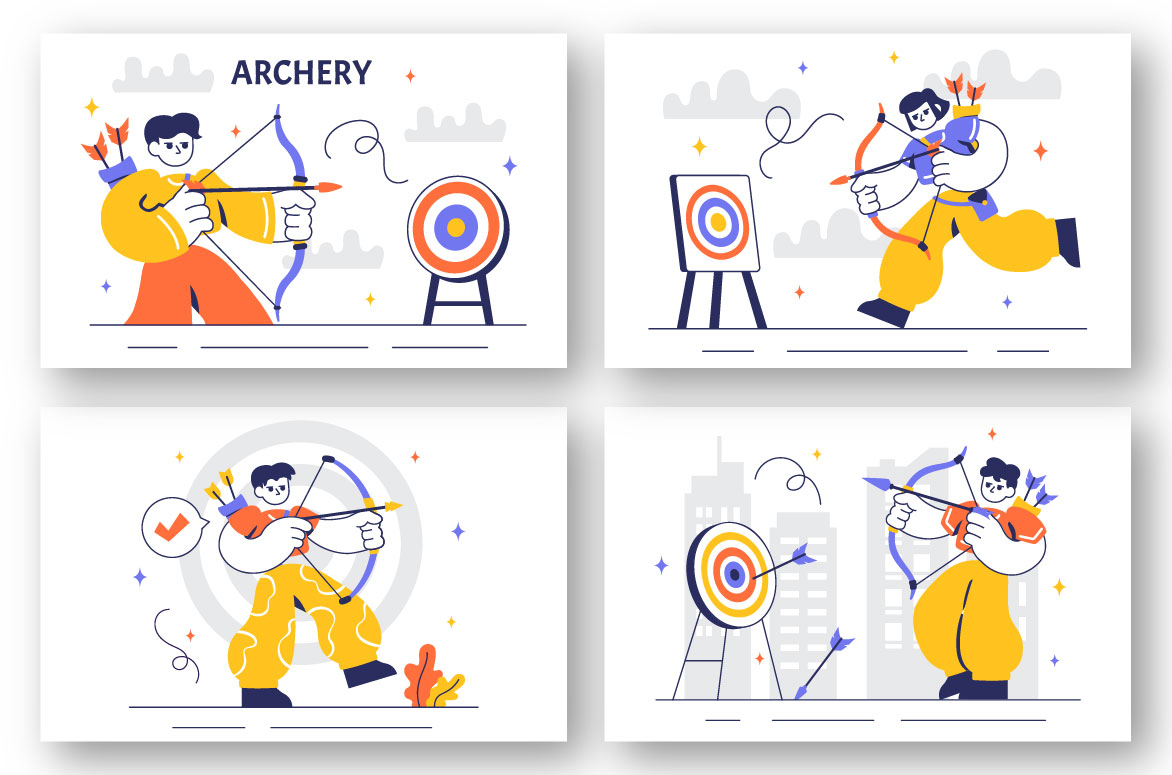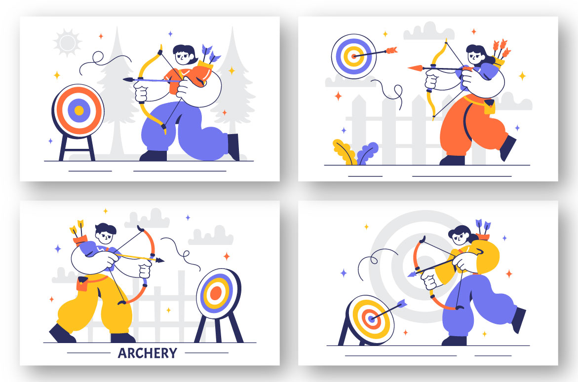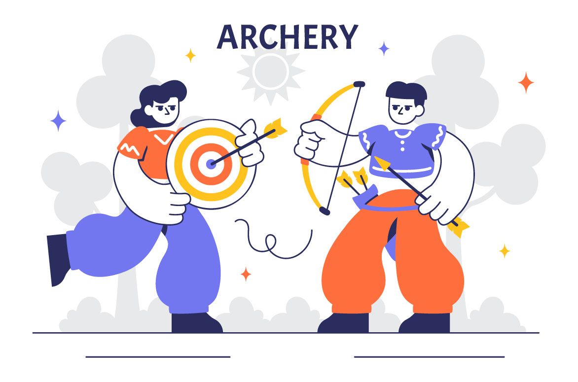 Archery Sport Vector Illustration Featuring a Bow and Arrow Aiming at a Target, Depicting an Outdoor Recreational Activity in a Flat Background Suitable for Poster, Web Banner, Brochure, Landing Page and Others Background Template Features:
