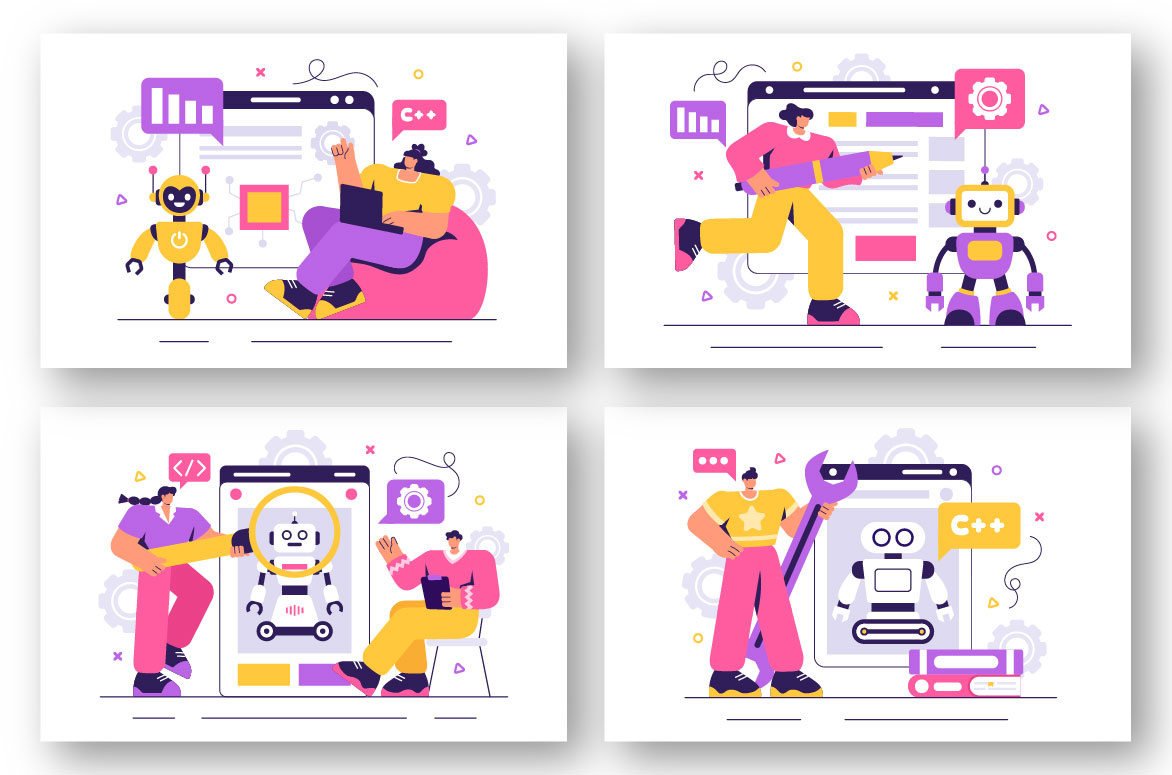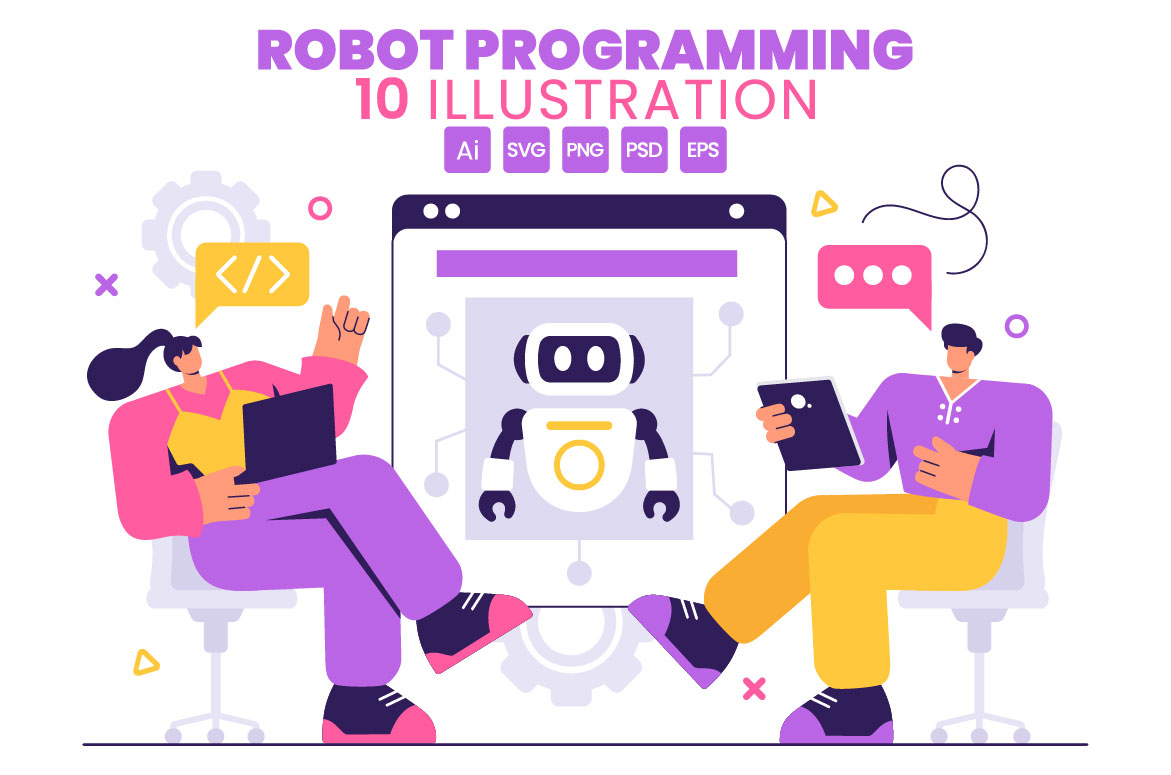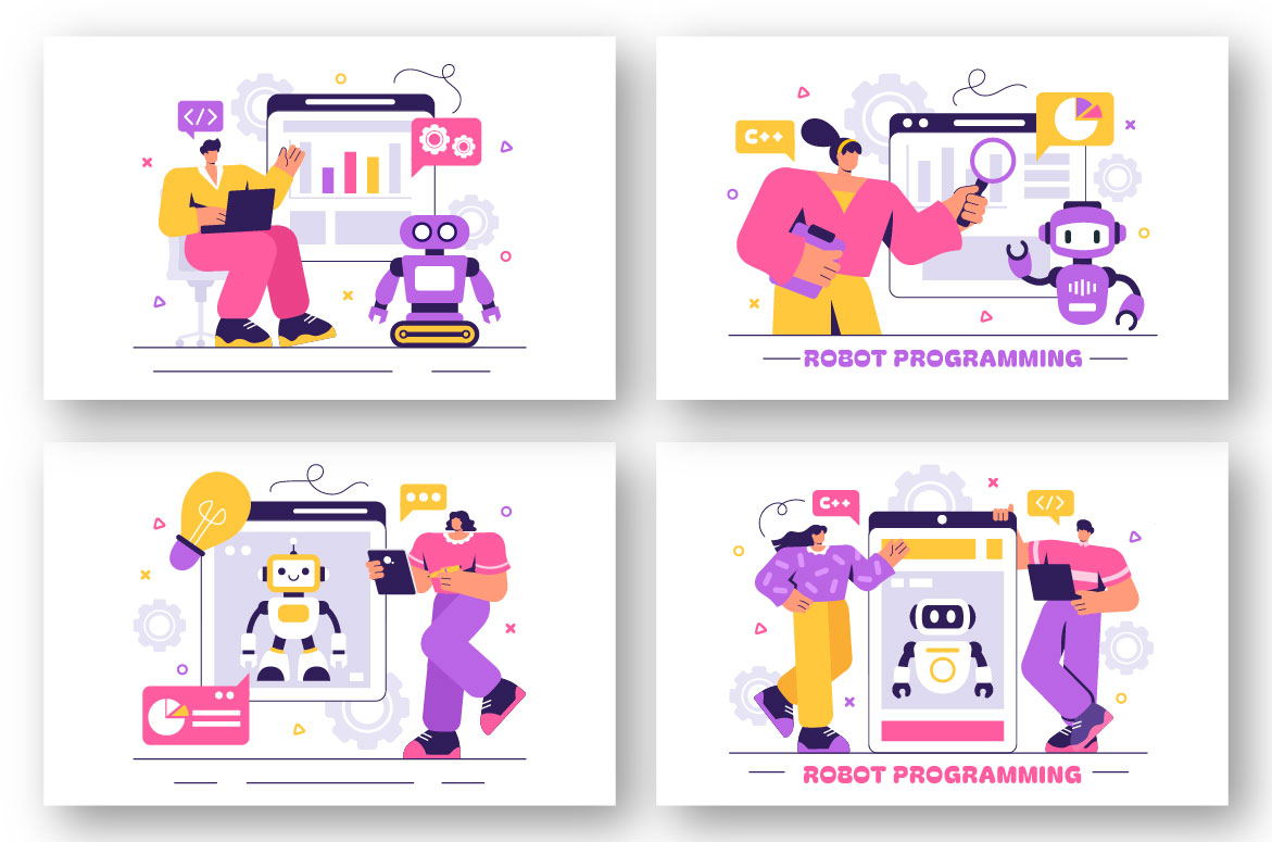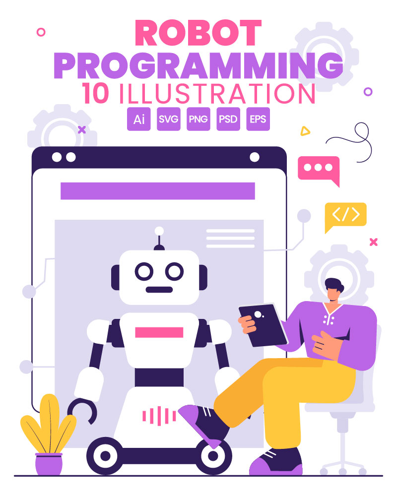 Robot Programming Vector Illustration Featuring an Artificial Intelligence Robot Interacting with a Digital Data Interface for Advanced Technology Suitable for Poster, Web Banner, Brochure, Landing Page and Others Background Template Features: