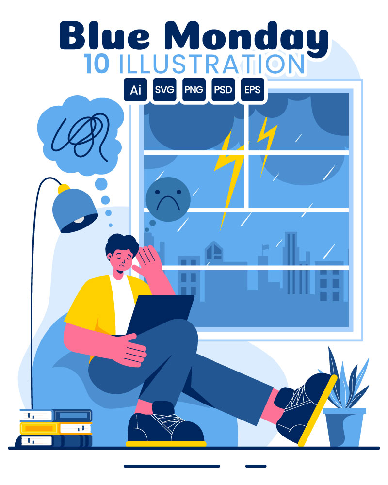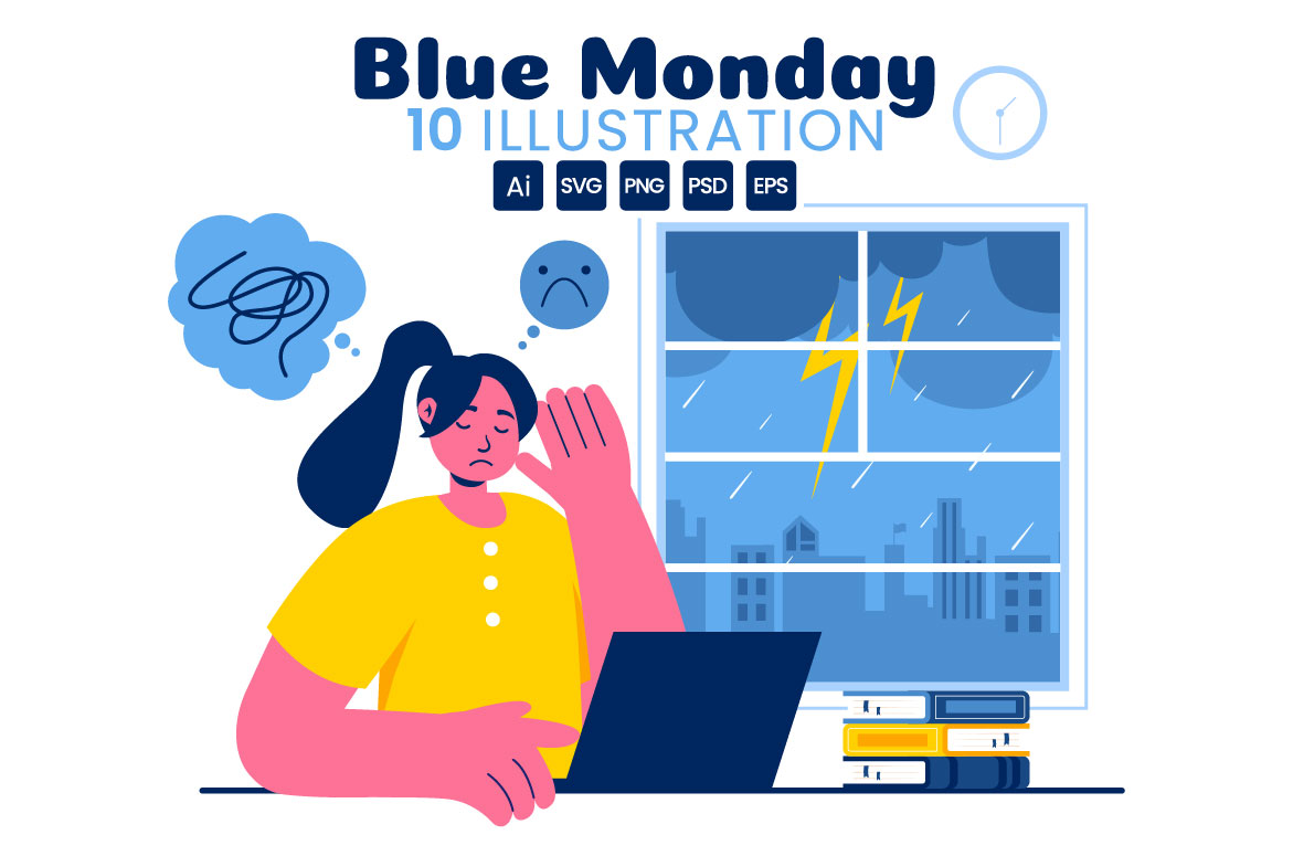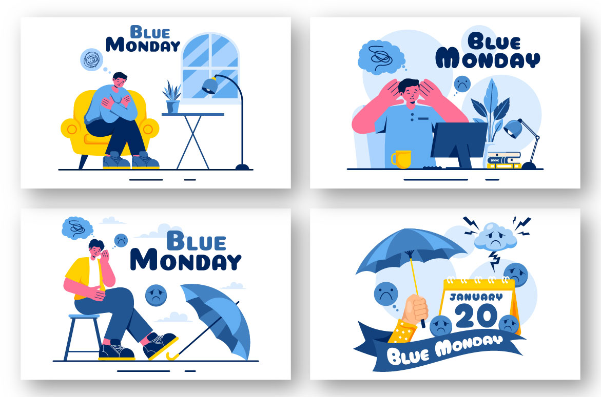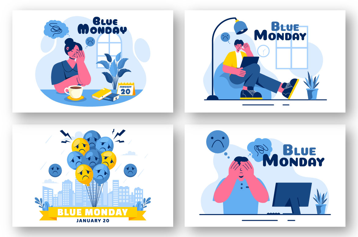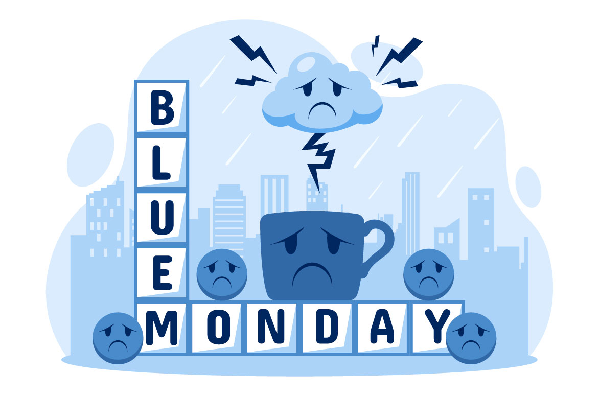 Blue Monday Illustration Depicting Sadness and Mental Health Influenced by Weather and certain circumstances in a Flat Style Cartoon Background Suitable for Poster, Web Banner, Brochure, Landing Page and Others Background Template Features: