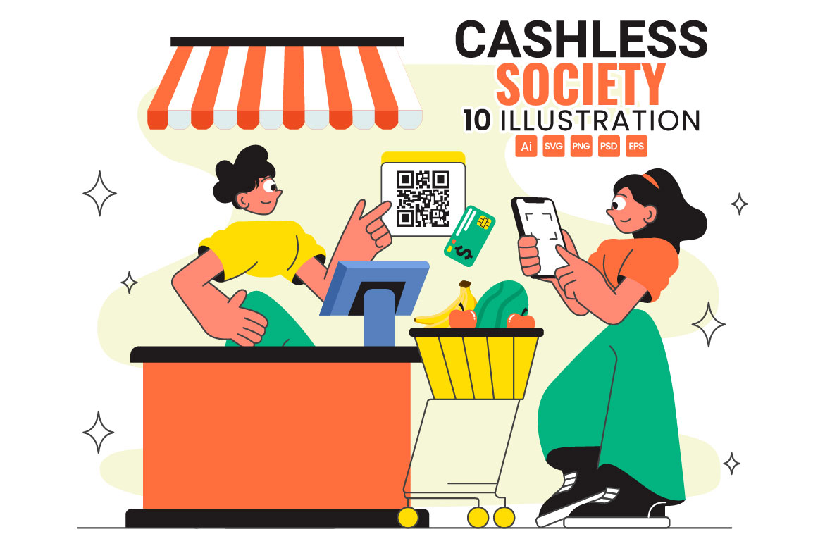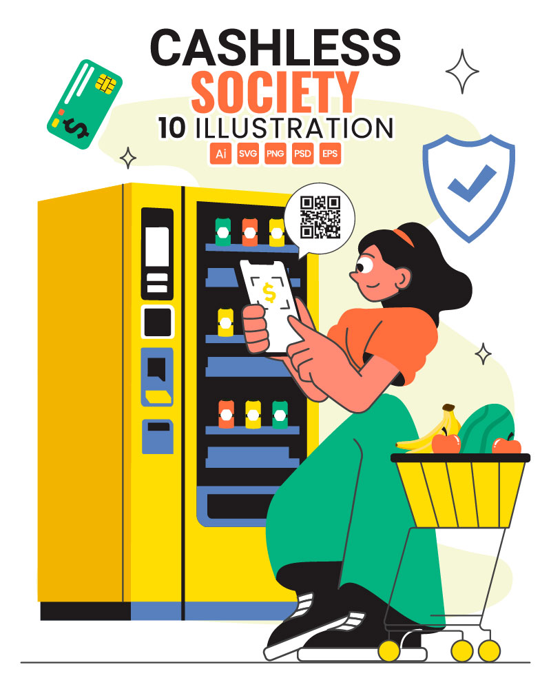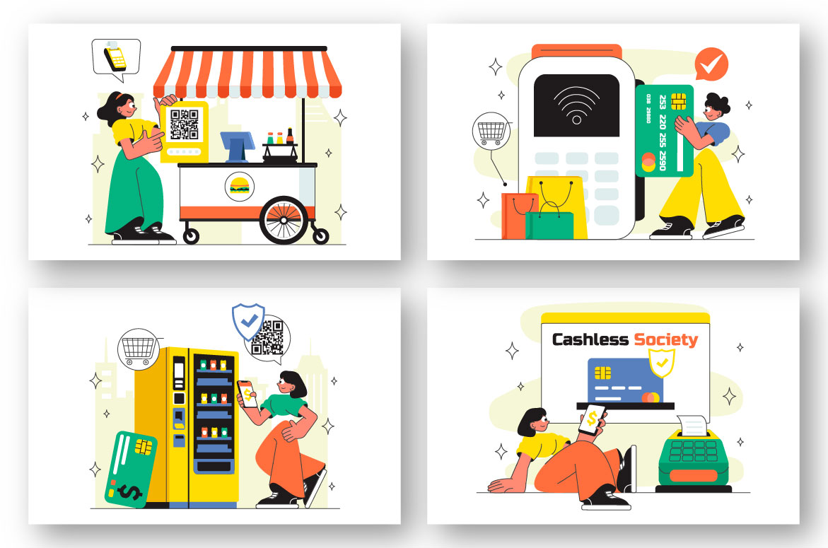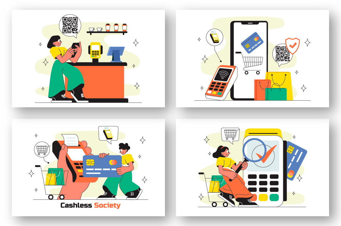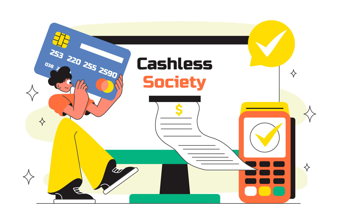 Cashless Society Payment Vector Illustration featuring Mobile Transactions, Digital Payments, Credit Card Machine, and Encryption in a Background Suitable for Poster, Web Banner, Brochure, Landing Page and Others Background Template Features: