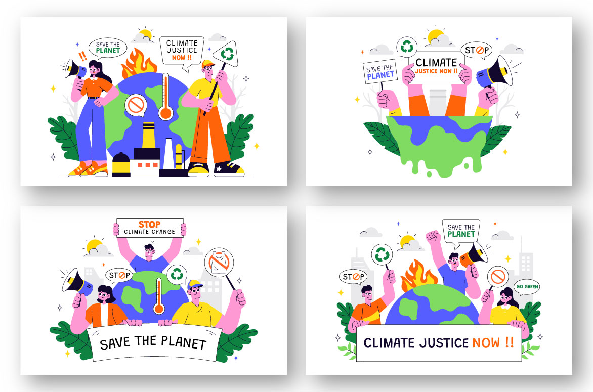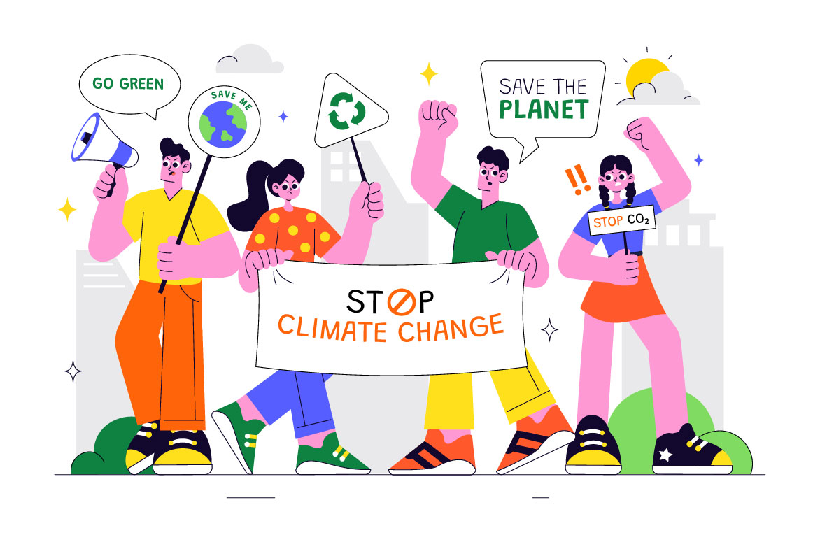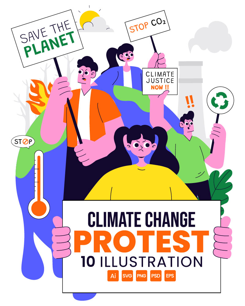 Climate Change Protest Illustration Featuring People Holding Placards with Slogans to Protect the Environment, Save the Planet and Stop Global Warming Suitable for Poster, Web Banner, Brochure, Landing Page and Others Background Template Features: