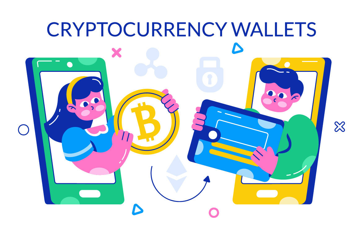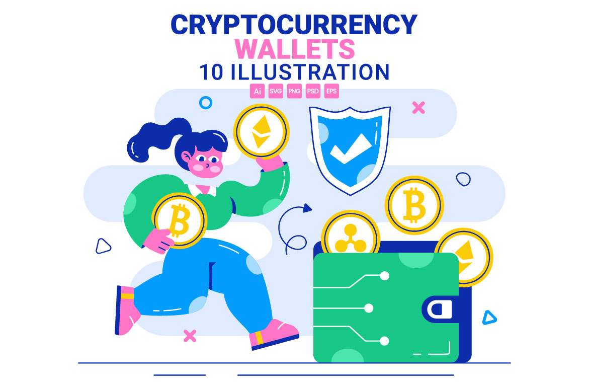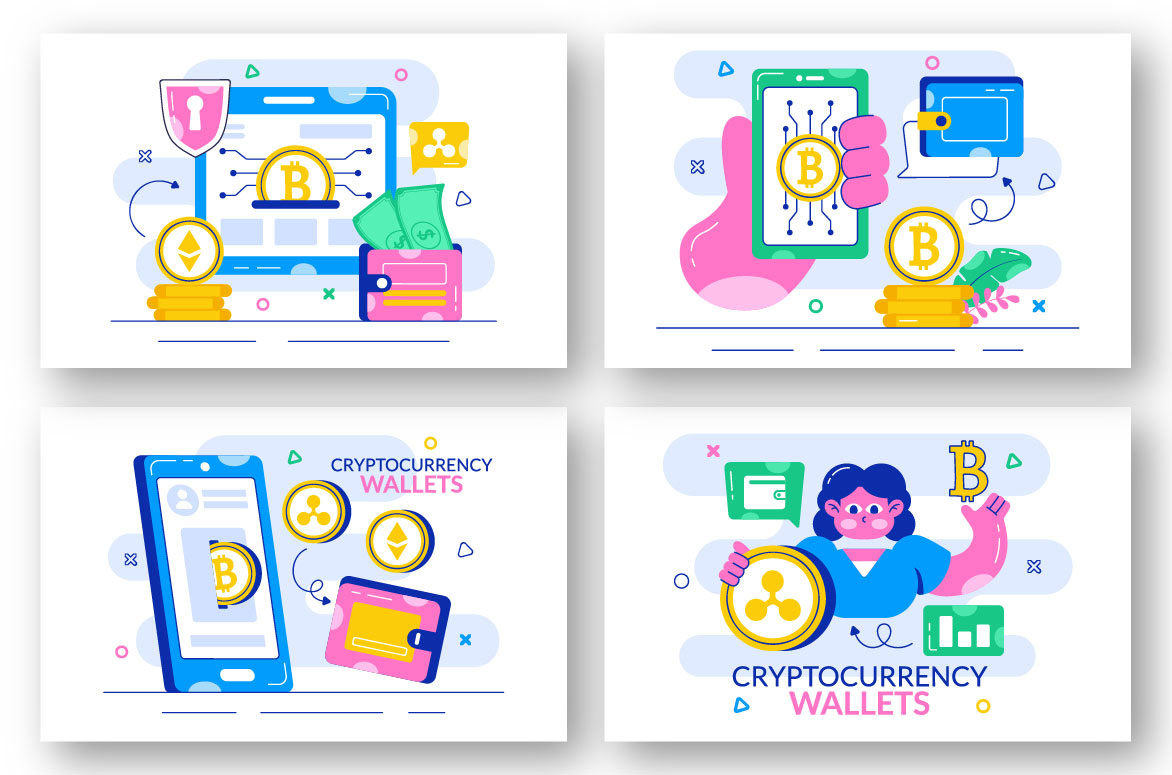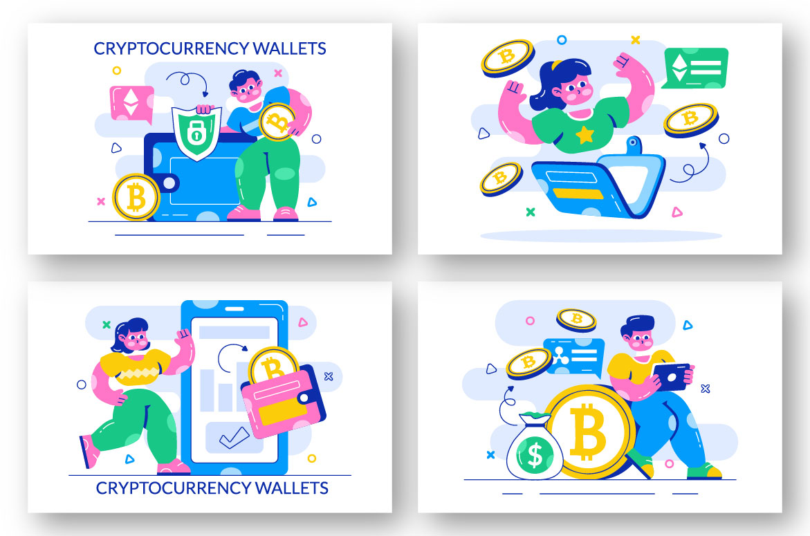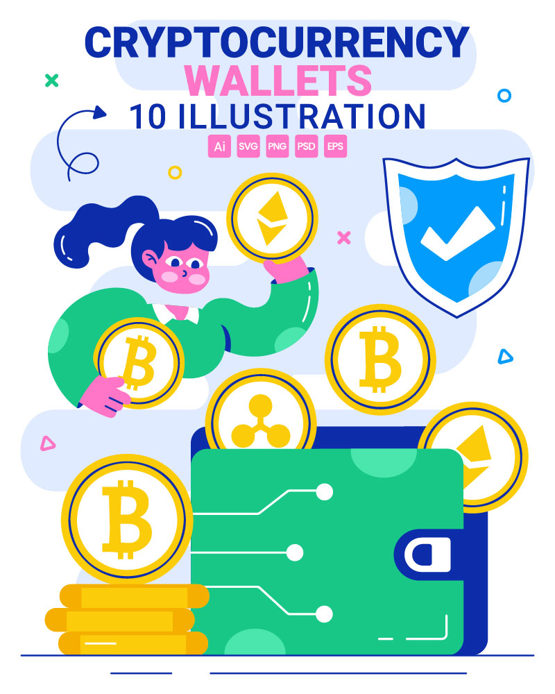 Cryptocurrency Wallets Trading Illustration featuring a Pile of Coins, Digital Currency Wallet, Blockchain Technology, and Bitcoin in a Background Suitable for Poster, Web Banner, Brochure, Landing Page and Others Background Template Features: