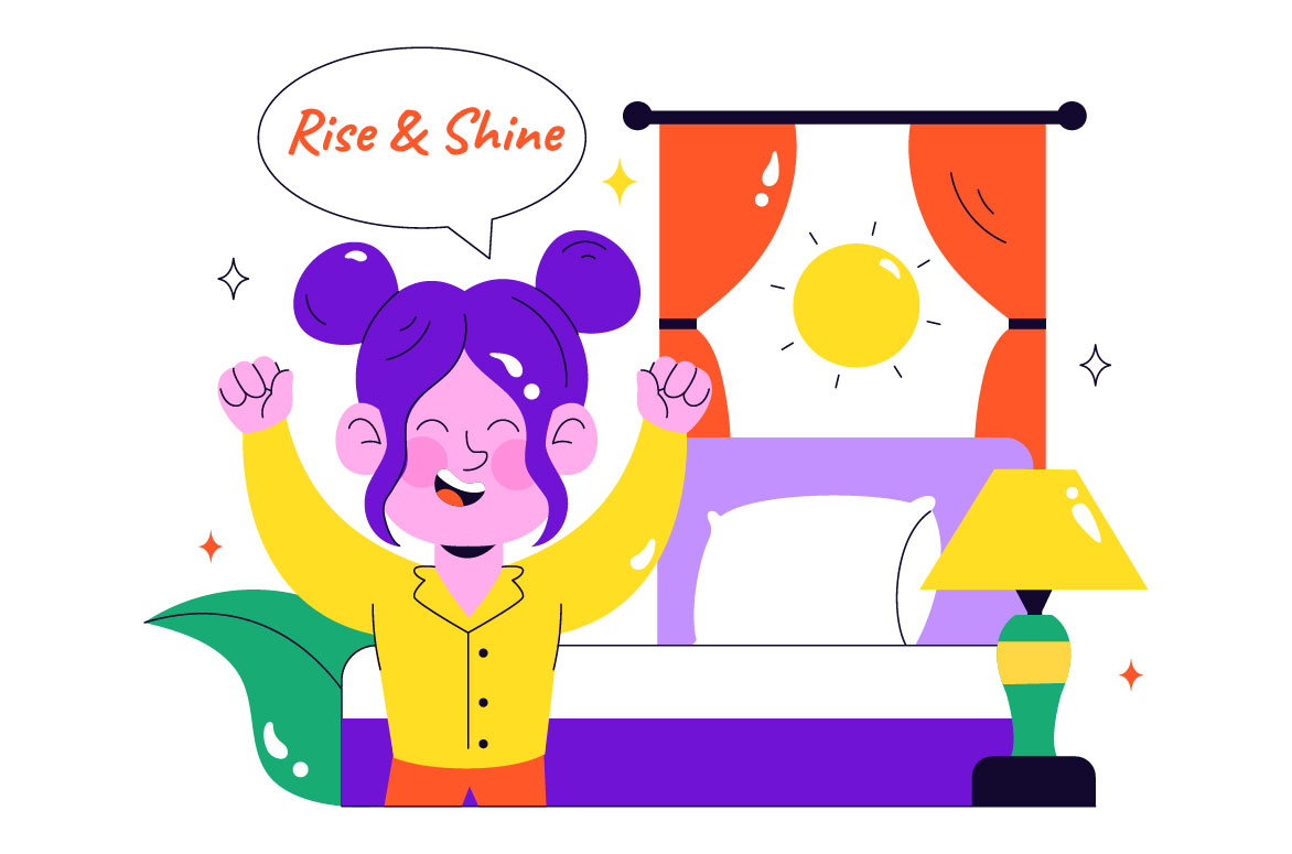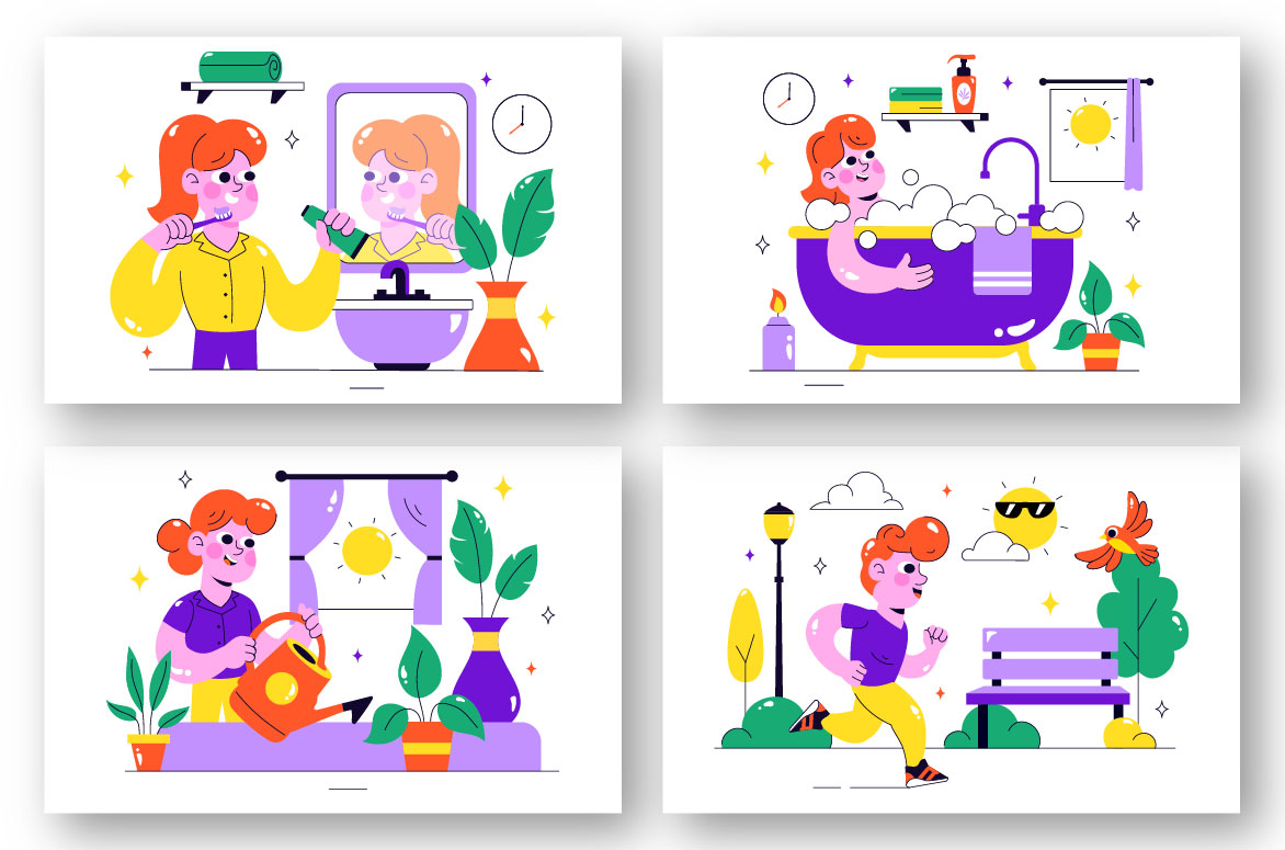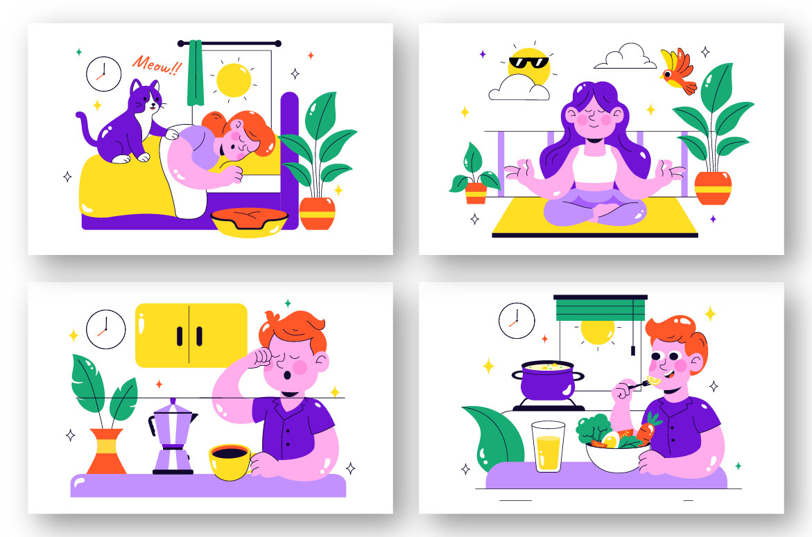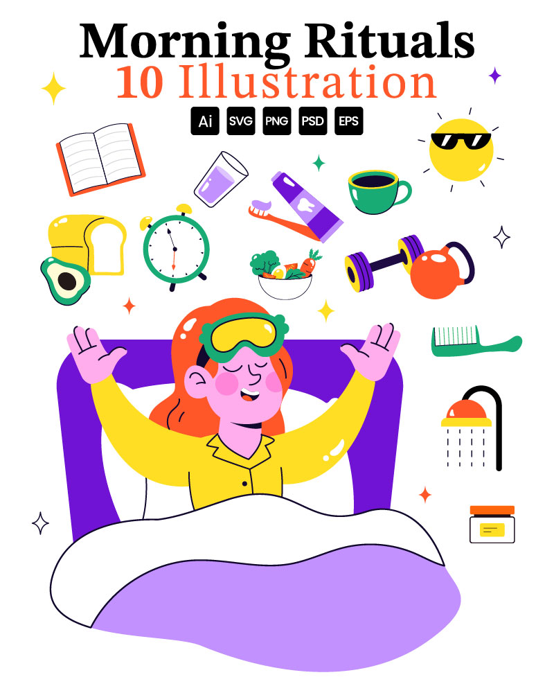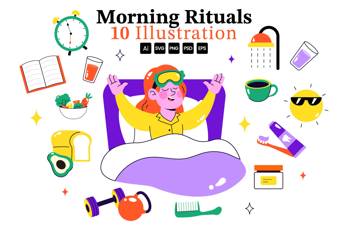 Morning Rituals Vector Illustration featuring People Doing Their Morning Routines and Practicing Healthy Lifestyle Habits in a Style Background Suitable for Poster, Web Banner, Brochure, Landing Page and Others Background Template Features: