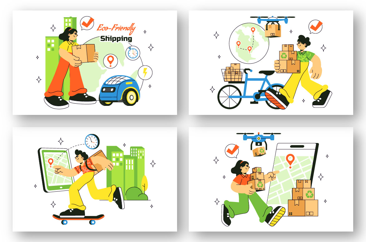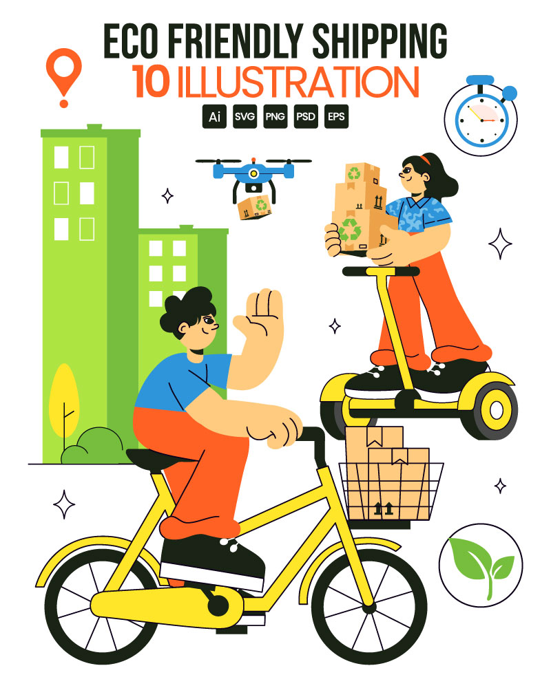 Eco Friendly Shipping Service Illustration Featuring Sustainable Logistics, Green Transport, Urban Delivery, Zero Emission Vehicle In a Background Suitable for Poster, Web Banner, Brochure, Landing Page and Others Background Template Features:
