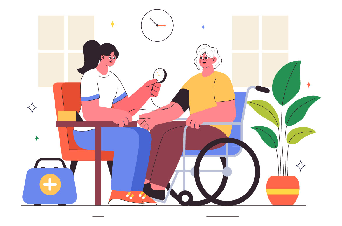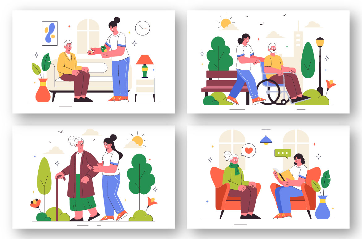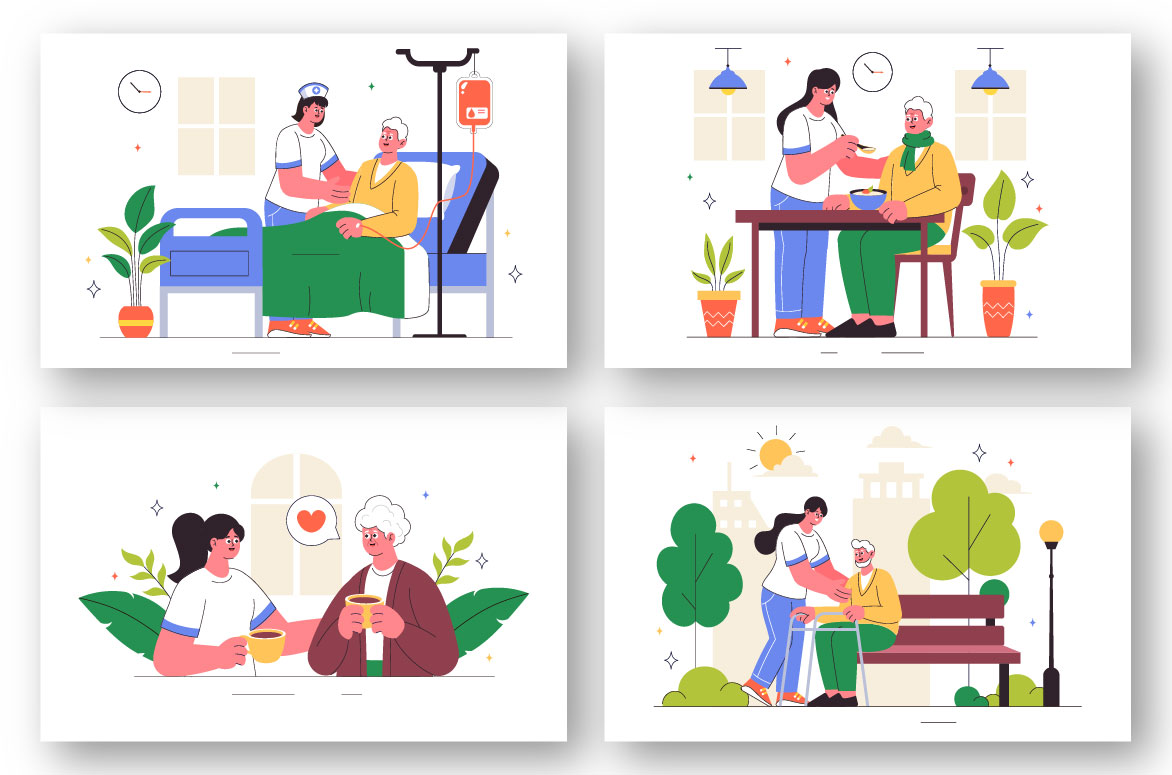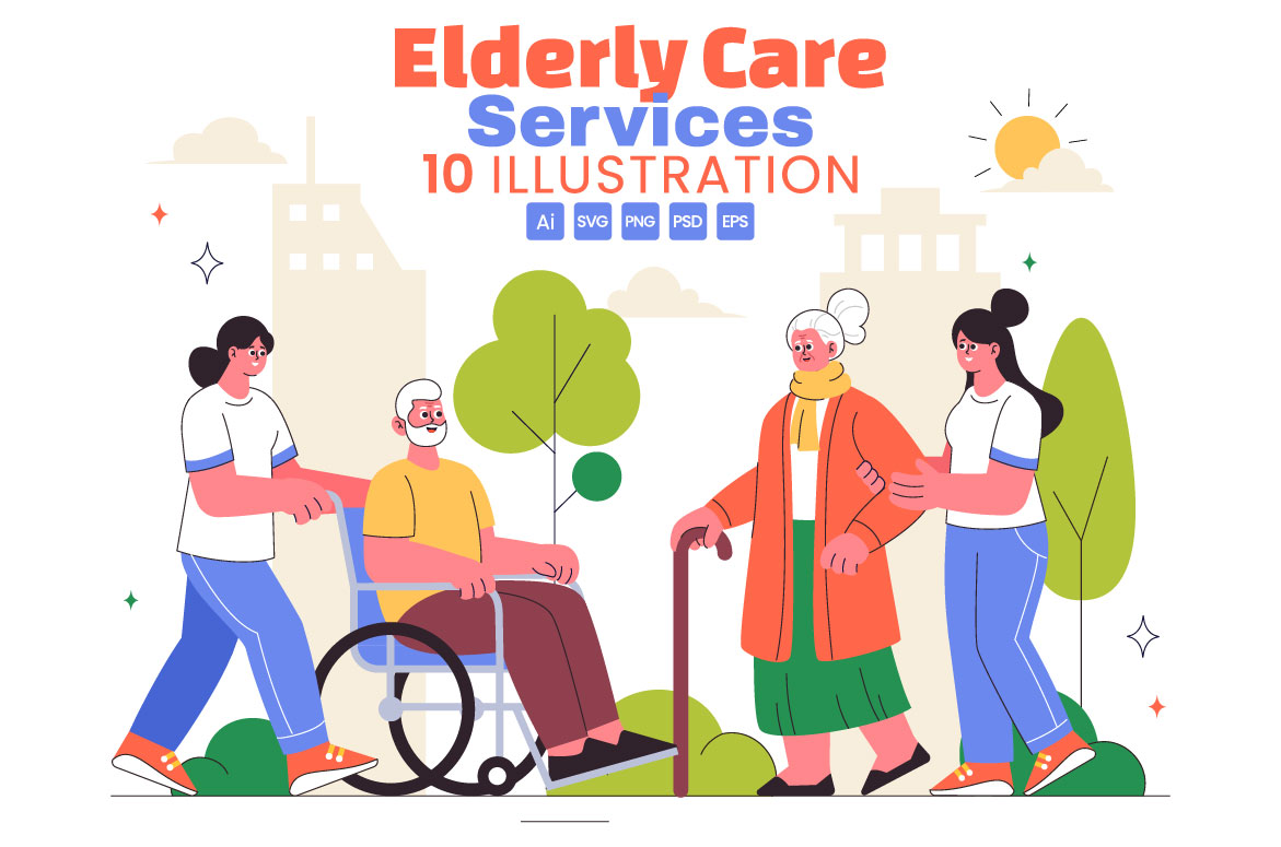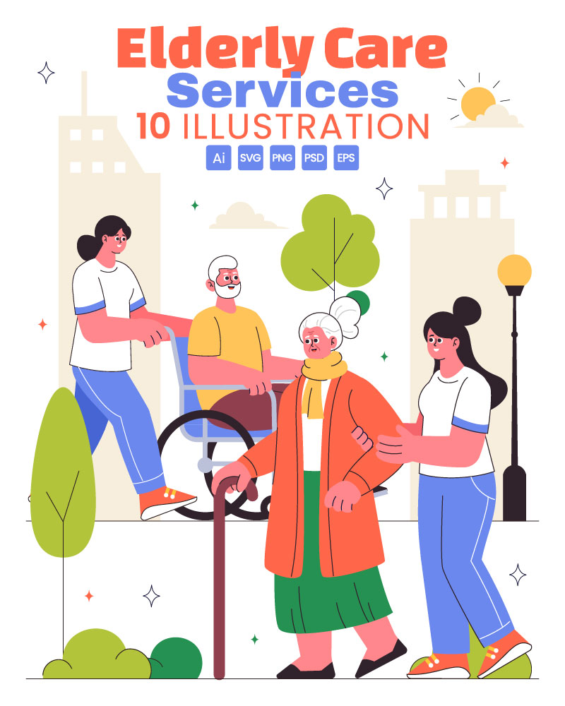 Elderly Care Services Vector Illustration Featuring Life with a Caregiver, Nursing Home, Assisted Living, and Support in a Flat Style Background Suitable for Poster, Web Banner, Brochure, Landing Page and Others Background Template Features: