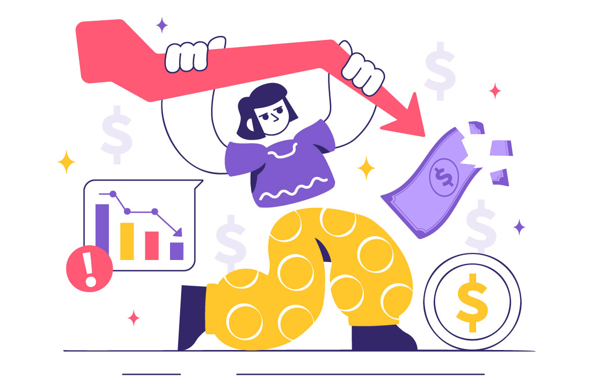 Financial Crisis Vector Illustration featuring concepts of Bankruptcy, Economic Collapse, and Cost Reduction with a Downward Arrow in a Background Suitable for Poster, Web Banner, Brochure, Landing Page and Others Background Template Features:
