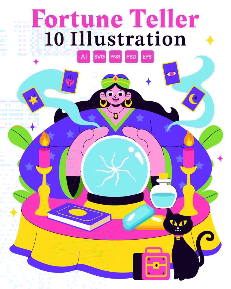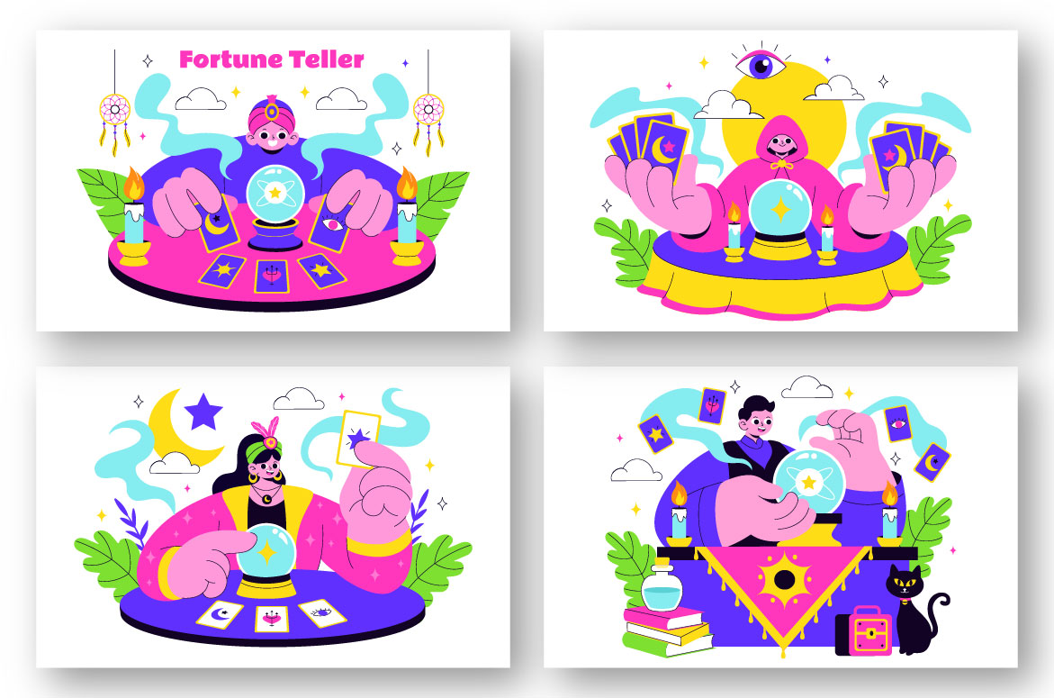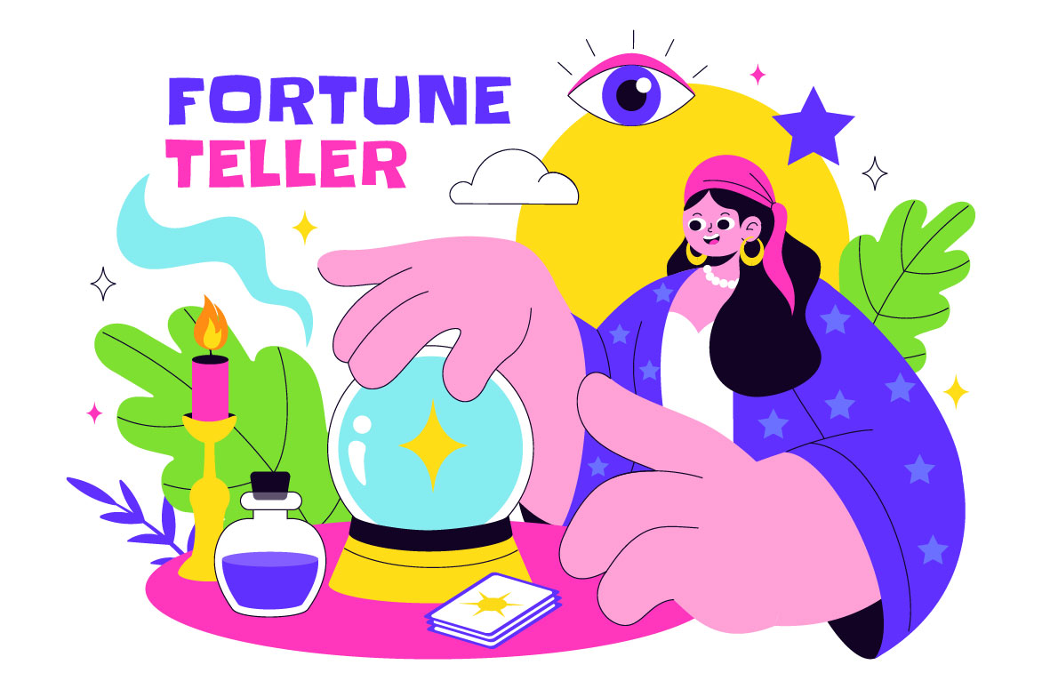 Fortune Teller Vector Illustration with Crystal Ball, Magic Book, and Tarot Cards for Predicting Destiny and Telling the Future in a Flat Background Suitable for Poster, Web Banner, Brochure, Landing Page and Others Background Template Features: